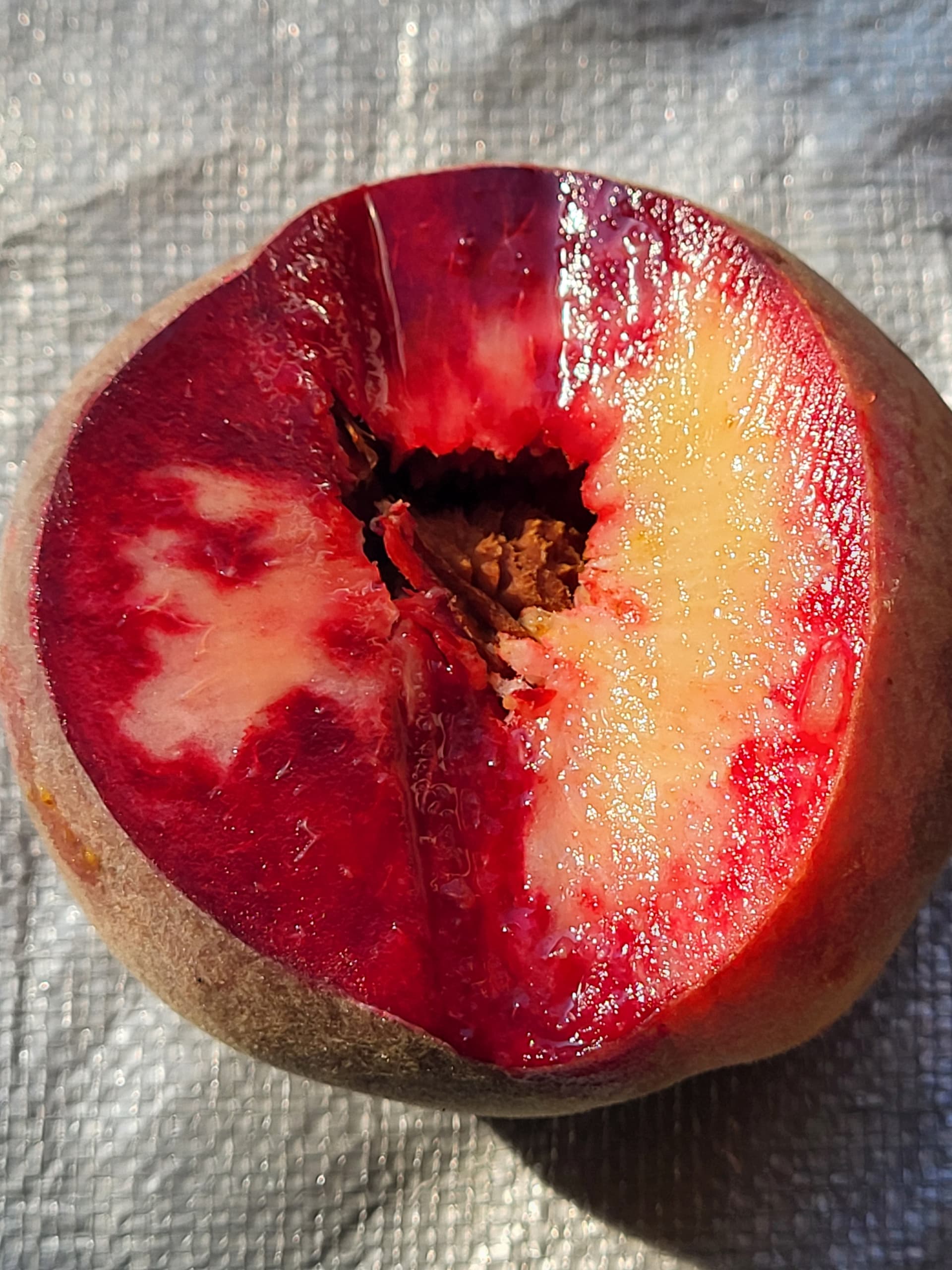 Here’s a photo my wife took of an open Indian Free I picked this season. This year most weren’t this red, some years there are peaches completely red from this variety.