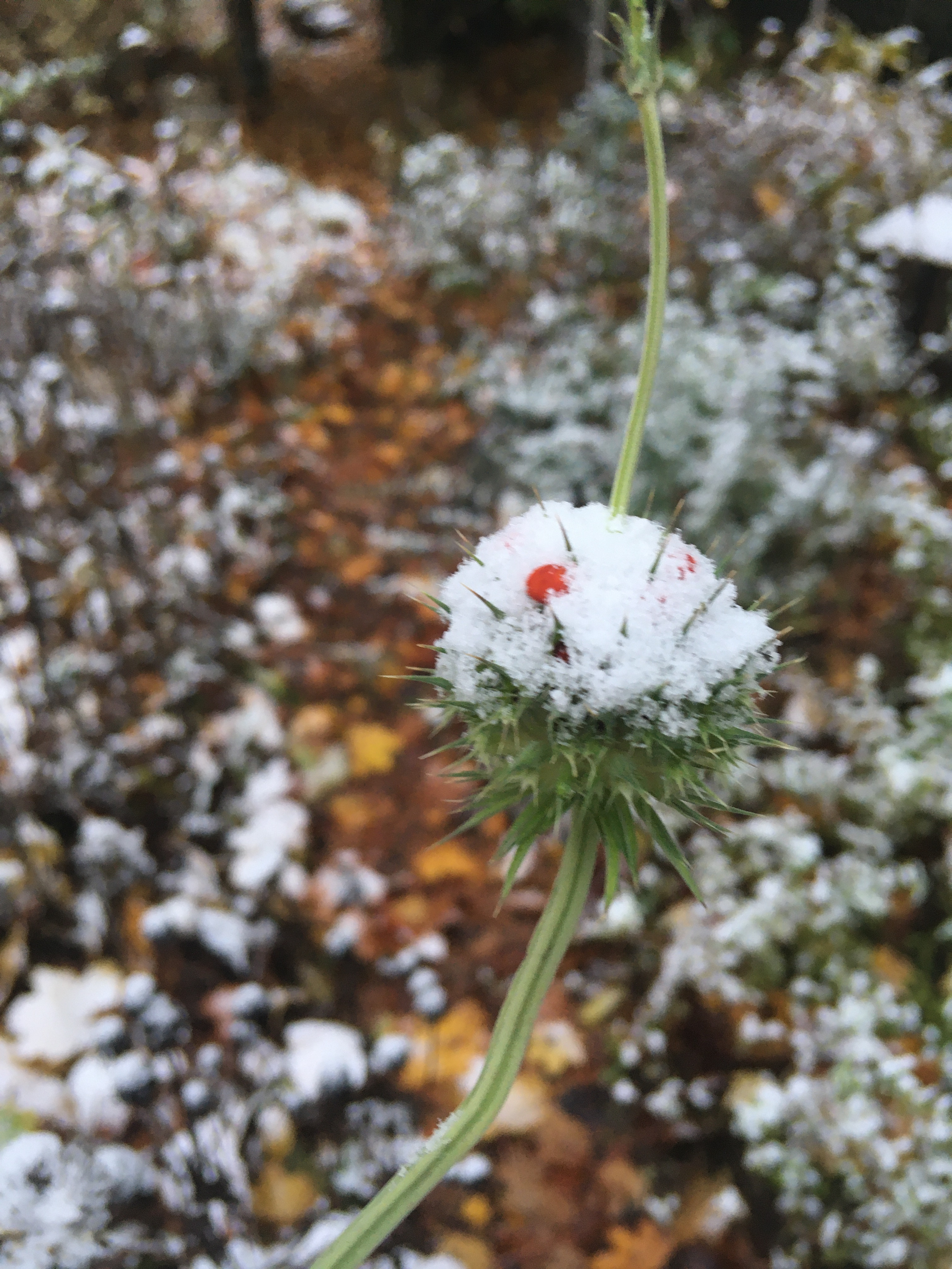 Awoke to snow on the ground this morning. It was 60°F yesterday and allegedly 20°F now. It really should not be finding the ground hospitable for this.