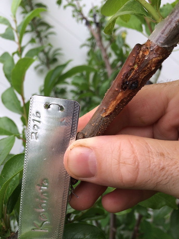 I did notice a problem with one of the plum grafts- maybe ripping through the tape was a bit of a stress for it, as it leaked sap. When I felt it, it was dried and hard, so I think that it may be OK. Kahinta graft from 5/4: