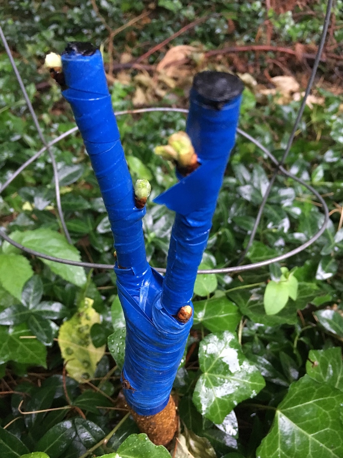 Yes, I grafted it a week or two ago. I had a huge 3-year old volunteer mulberry bush the birds must have deposited. Caliper an inch thick. I flush cut the bush at its base and applied two rind grafts. I wrapped it crazy tight with an endless amount of electrician’s tape. The understock was leaking a ton of sap as I was grafting. I wrapped from the bottom up, and the sap was welling up and pooled in the center of the cut end between the rind grafts as I was wrapping. I wrapped around everything, then applied sealant on the tips of the scions. Even still, the sap was leaking through the tape! So the cut-ends of the scions were flooded with sap to-become callous tissue.