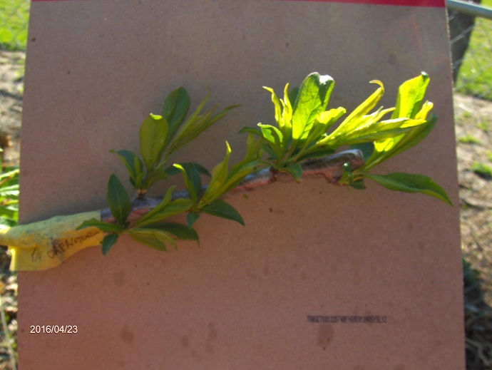 Persimmons and pawpaws grafted first week of April have swollen buds, although it might be hard to see. Peach, grafted at the same time.