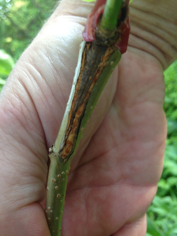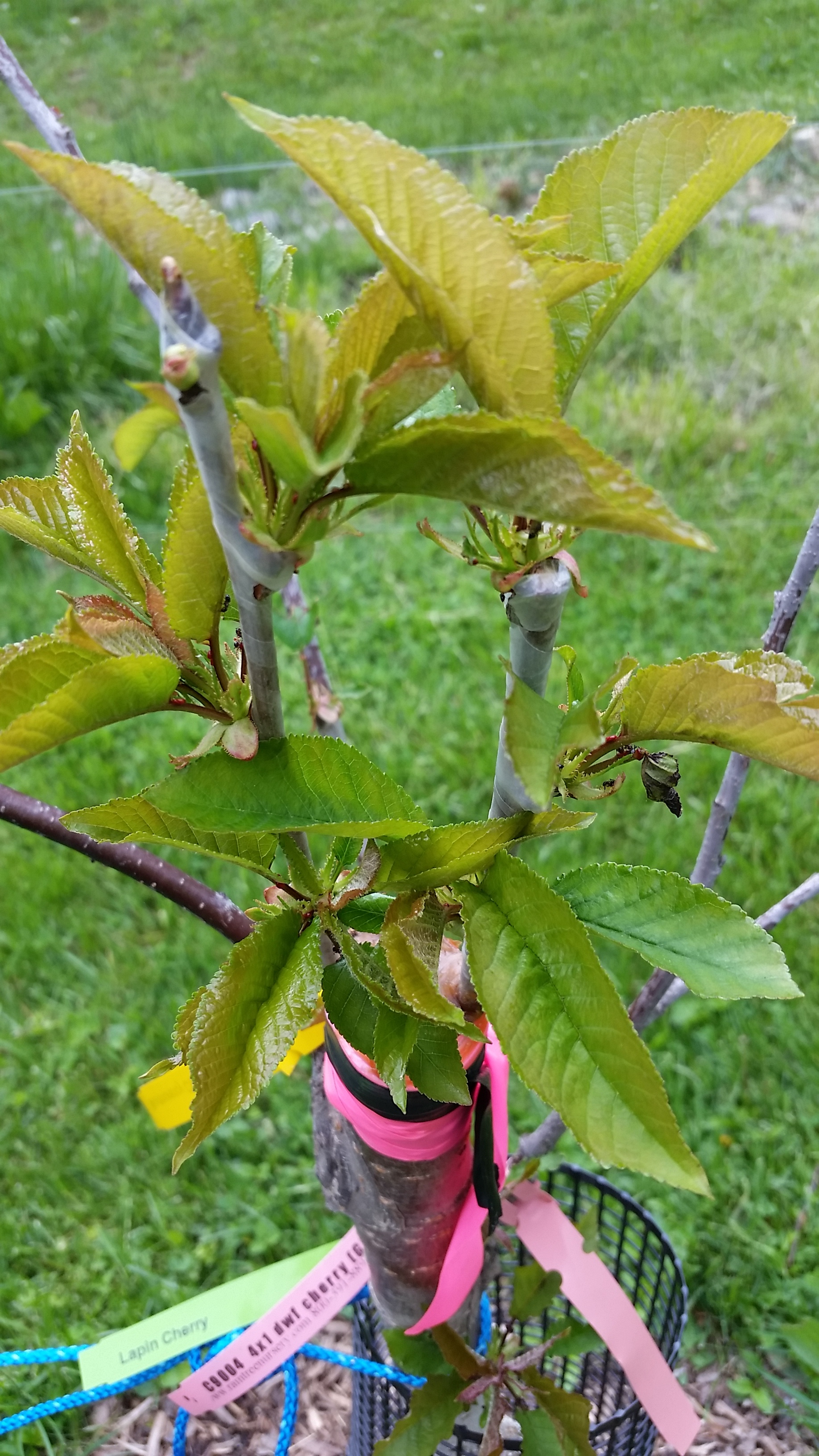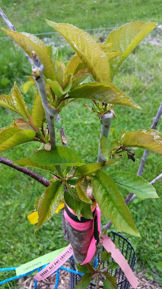 My sweetheart cherry top work is doing well. You can see in the background the other branches that were stripped by deer. I can not believe the deer did not eat the leaves on the sweetheart cherry.