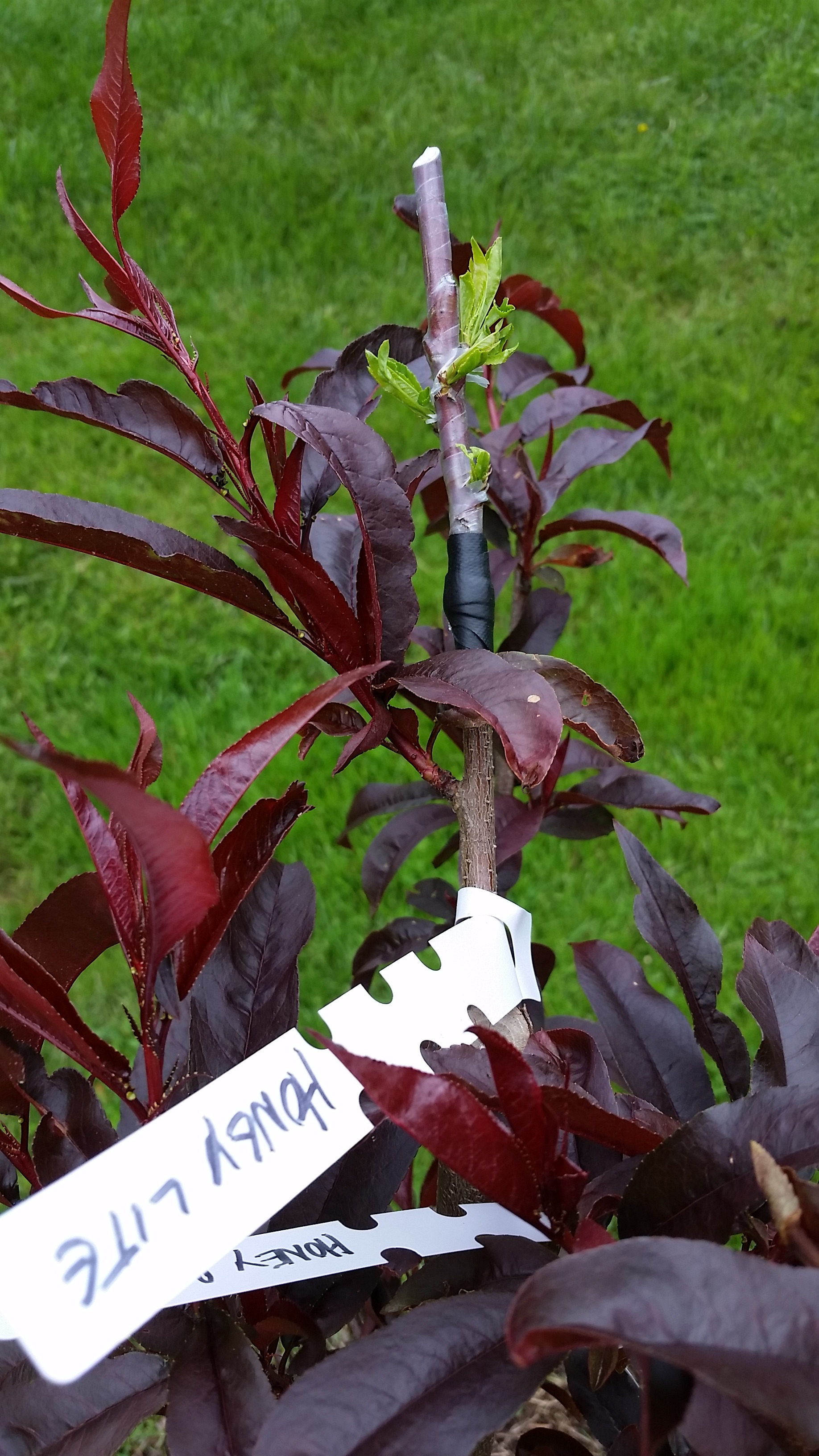 I added this graft pic just because of the interesting contrast in leaf color. It’s Honey Lite nectarine grafted onto spice zee. By the end of the summer the spice zee leaves will be dark green but great contrast during early season.