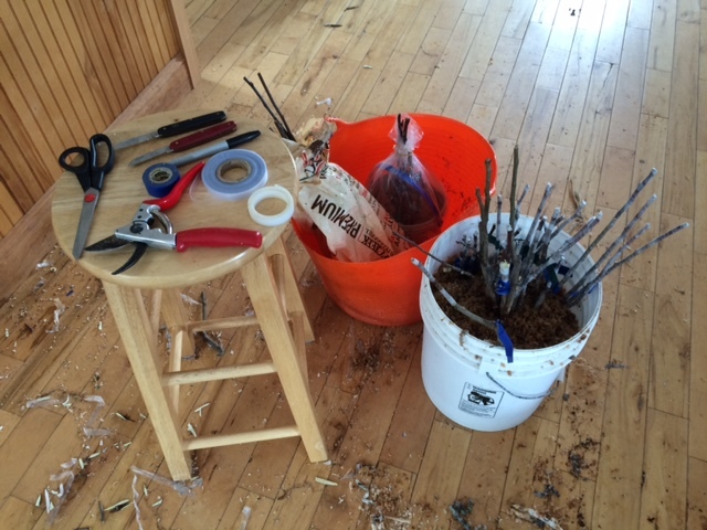When I was done I had a pile of foot-long B118 and M111 sticks sitting there, and for giggles I dug out some old rooting hormone, dipped the butts, and stuck them in damp sawdust. The whole mess is in the basement under our mudroom where it’s around 50F; I’ll leave them there for a couple of weeks and see how they look, unless folks here suggest treating them otherwise?