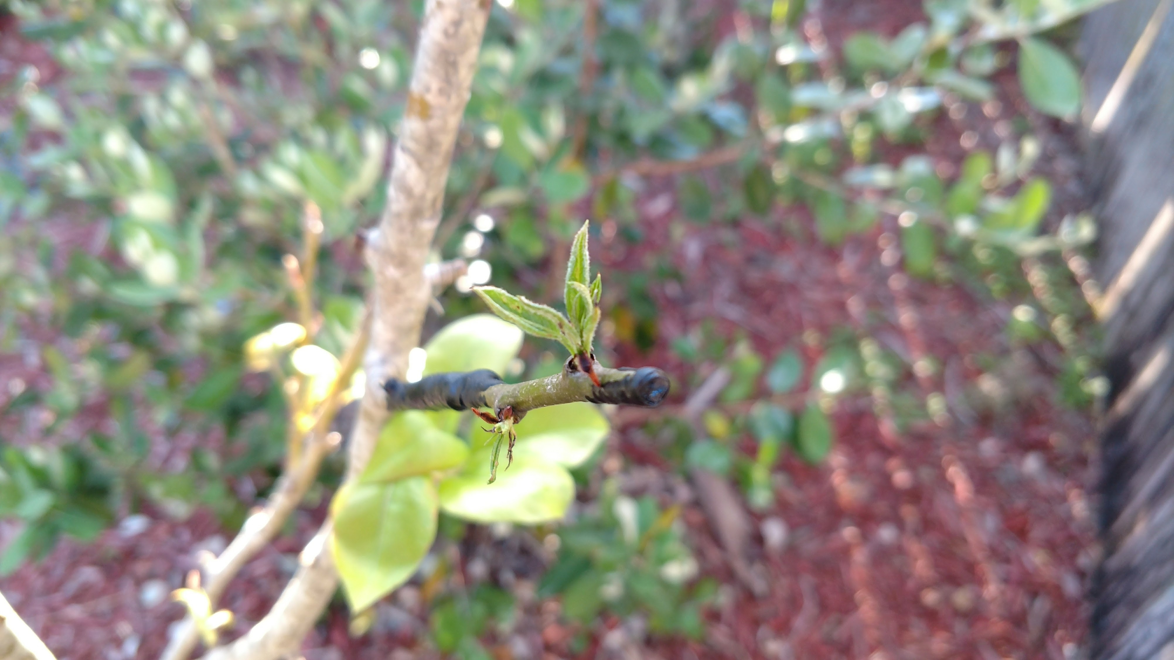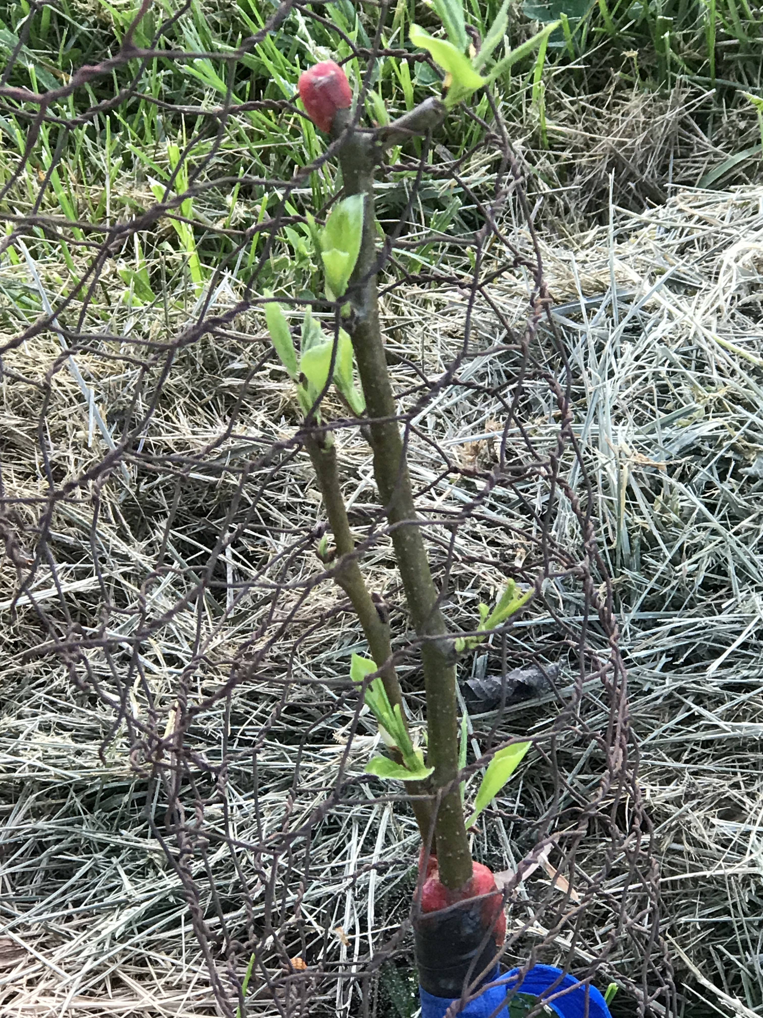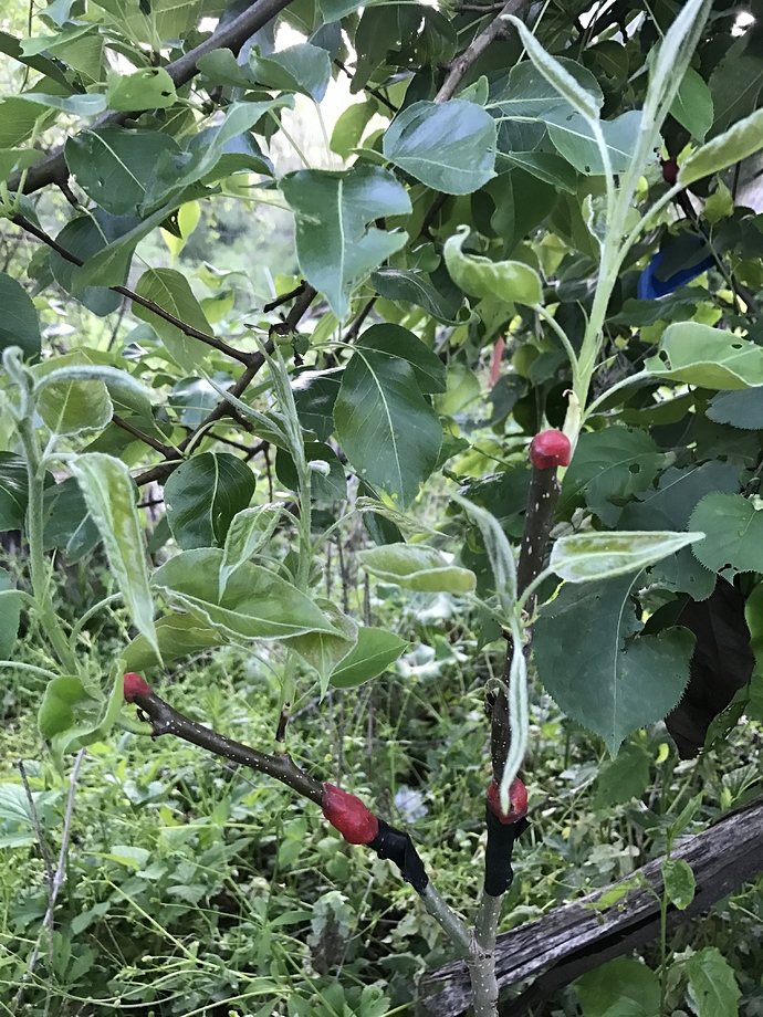 here is one of the harrow delight grafts that I put on my leconte. For some reason this tree has been slow to leaf out this year, you can see in the first pic how far along it is. Overall the tree is healthy. Anyway, the graft is only 10 days old and it’s already pushing leaves. Hoping that’s a good sign and not just caused by residual moisture that was already in the scion wood.
