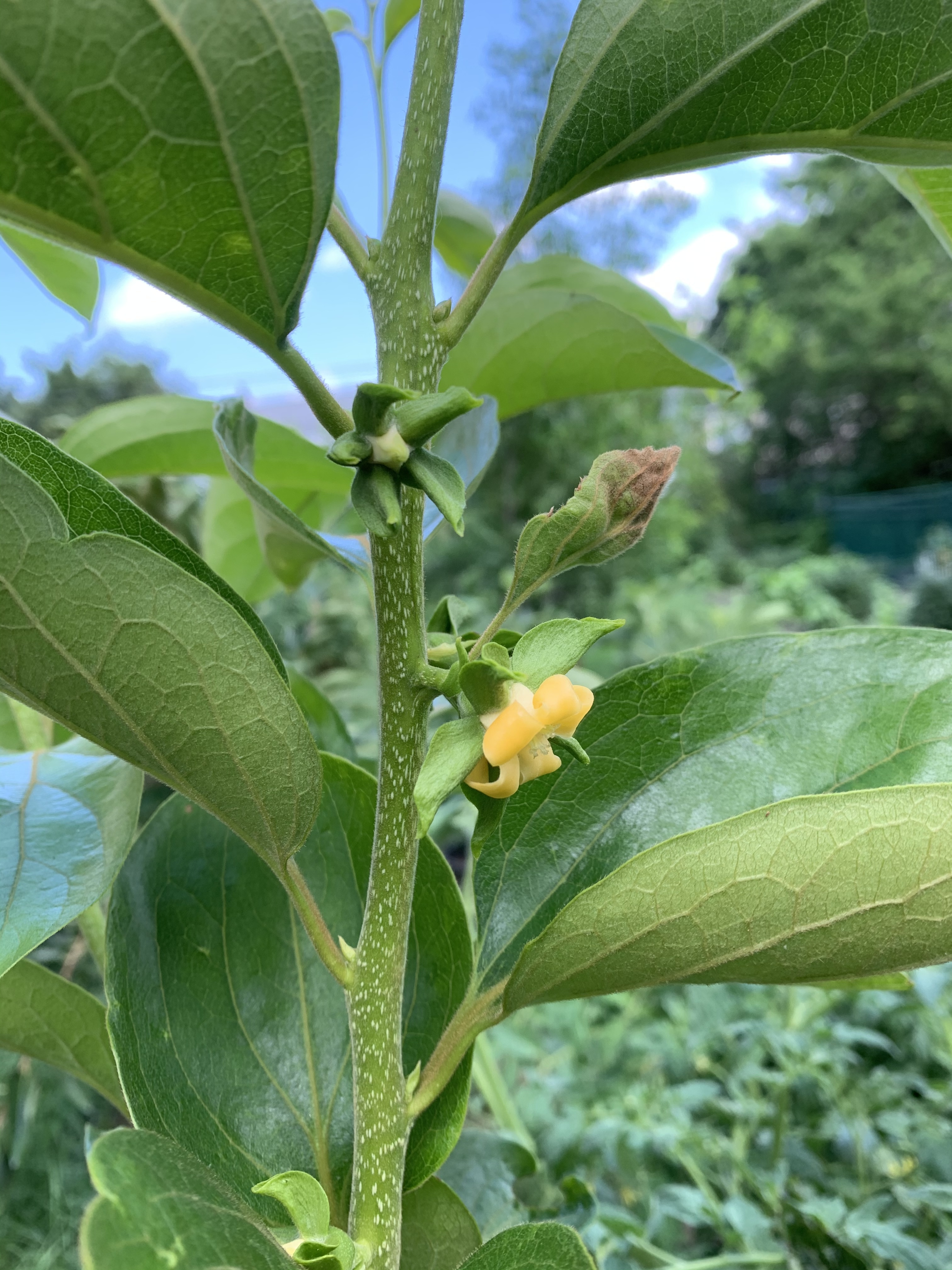 My Miss Kim persimmon decided to flower for a 2nd time on a new flush of growth. All the buds got burnt by a late freeze in spring. Too bad these won’t have a long enough season to ripen.