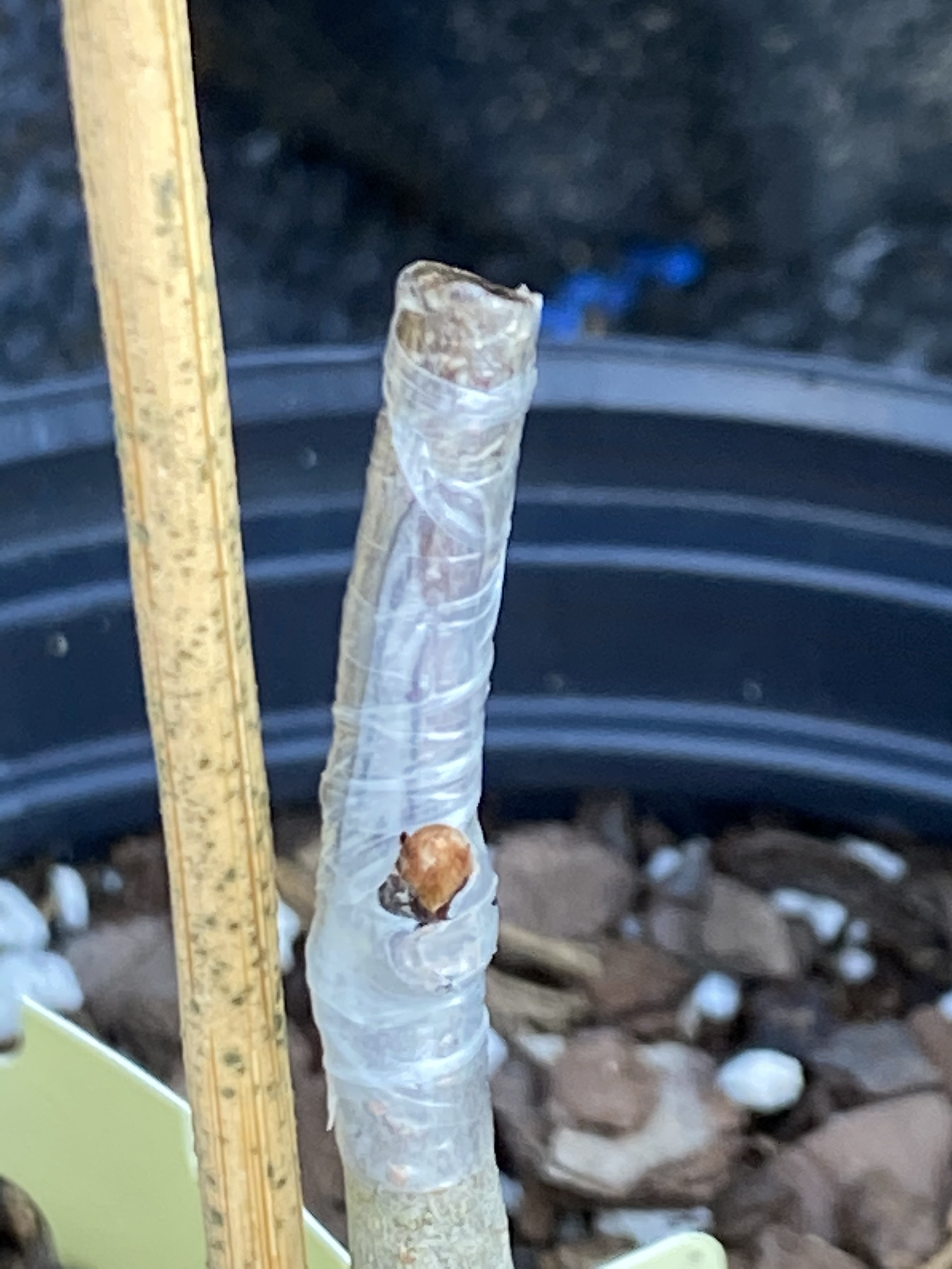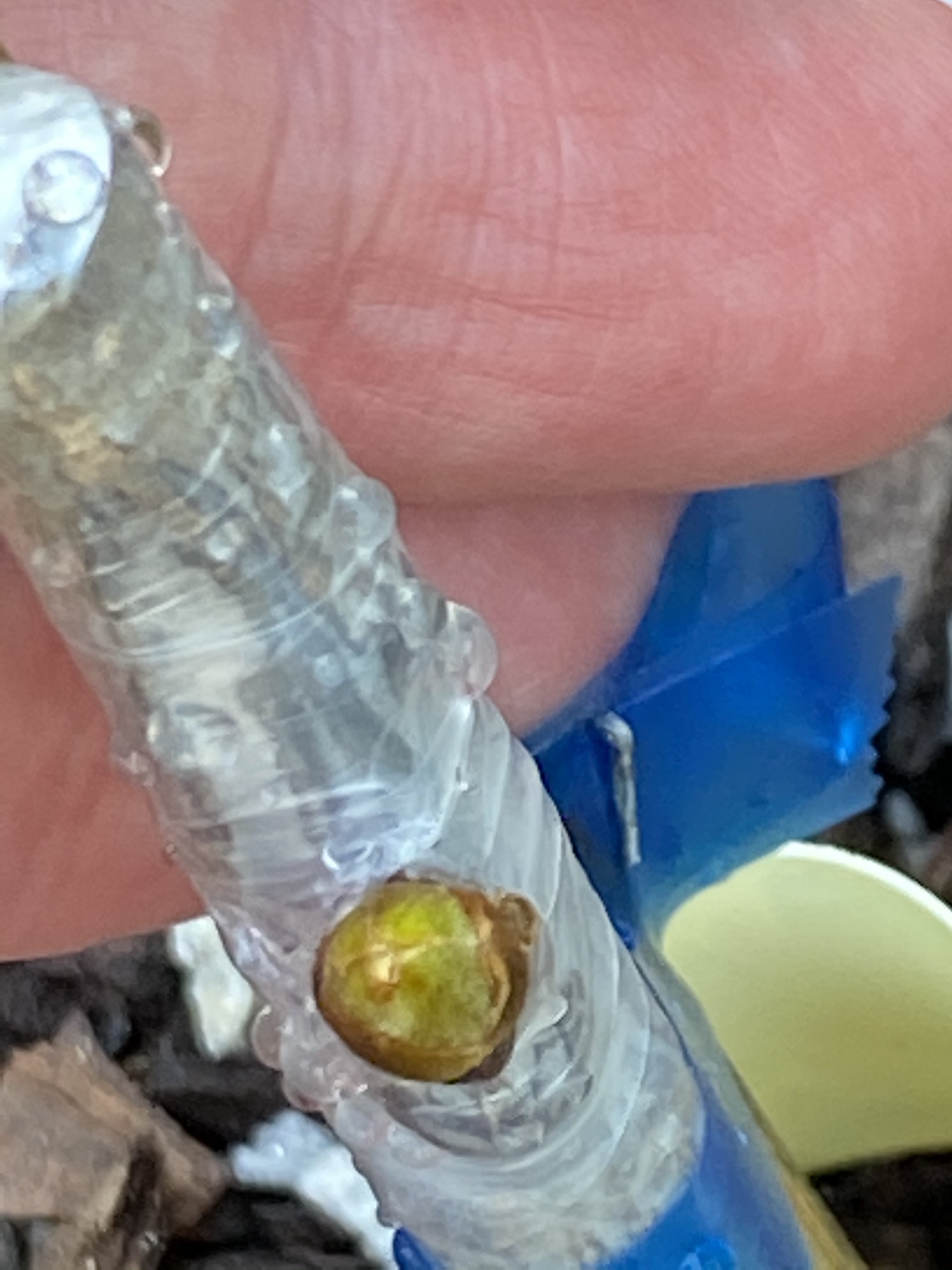 I wasn’t sure if they were adventitious or regular buds. Didn’t pay that much attention when wrapping. The squeezed/swollen buds, whatever their origin, seem to not differentiate, which is what makes me think there might be a slim chance it will root. I have plans on trying out a few methods of etiolation that researchers in Japan and the US have had success with to root persimmon cuttings. The squished bud is pretty effectively etiolated, so I think I’ll throw that in to the mix.