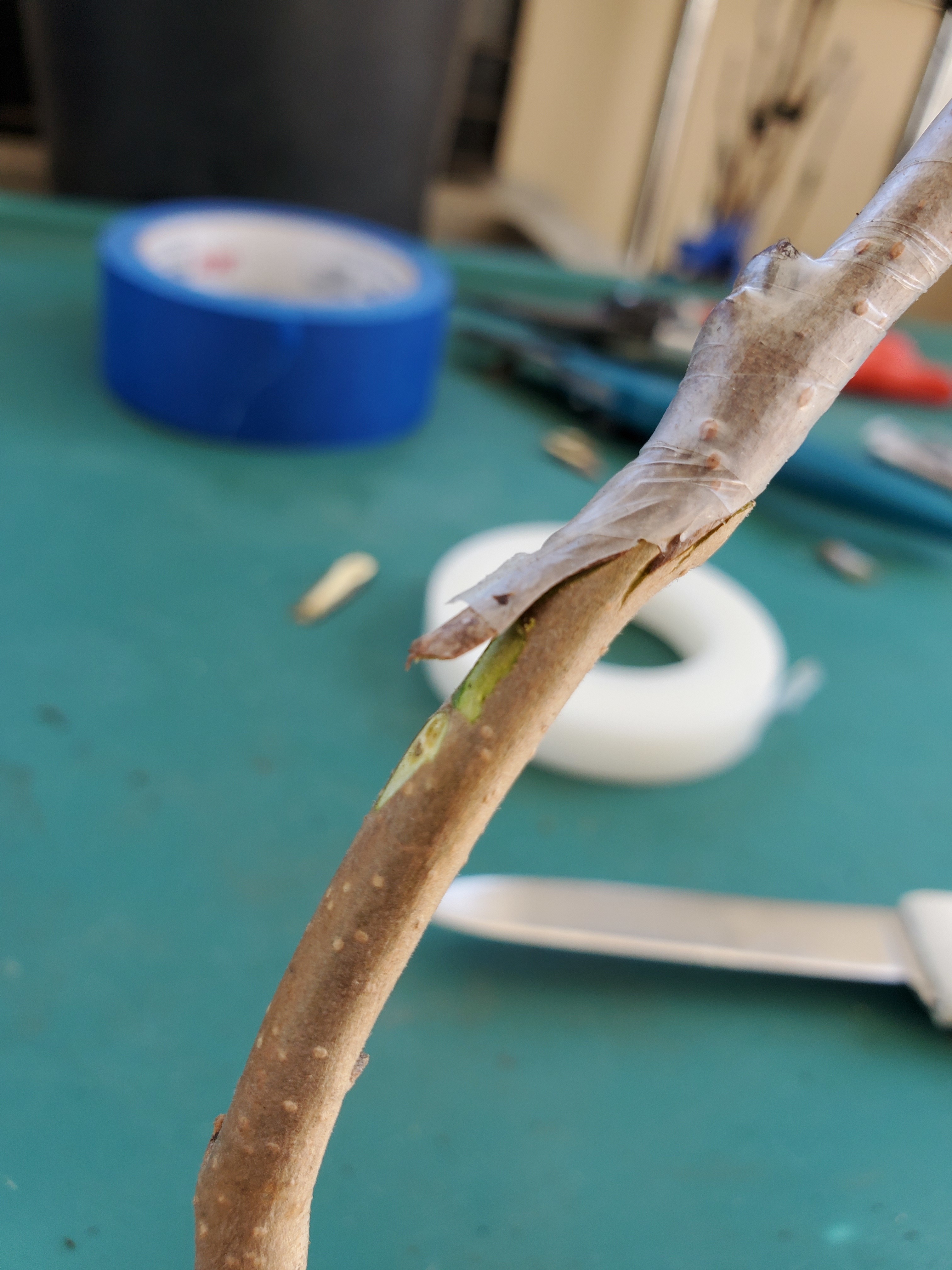 Trying to turn a bug into a feature. Grafting w/t, I still sometimes get a little flap at the end of my cut. If it doesn’t otherwise interfere with a good match, I’ve been keeping it and scraping away the bark where it will overhang to hopefully get more cambium contact.