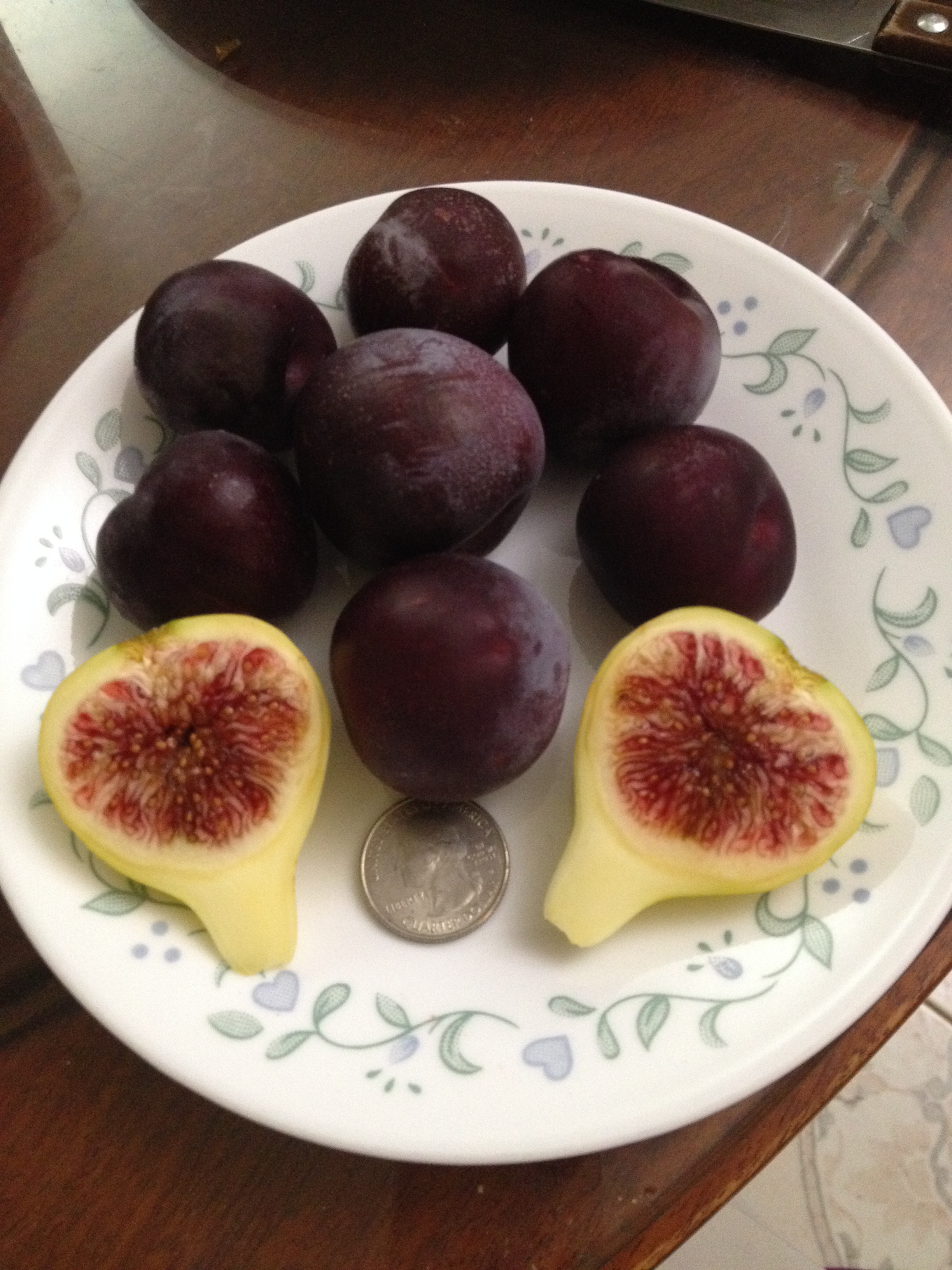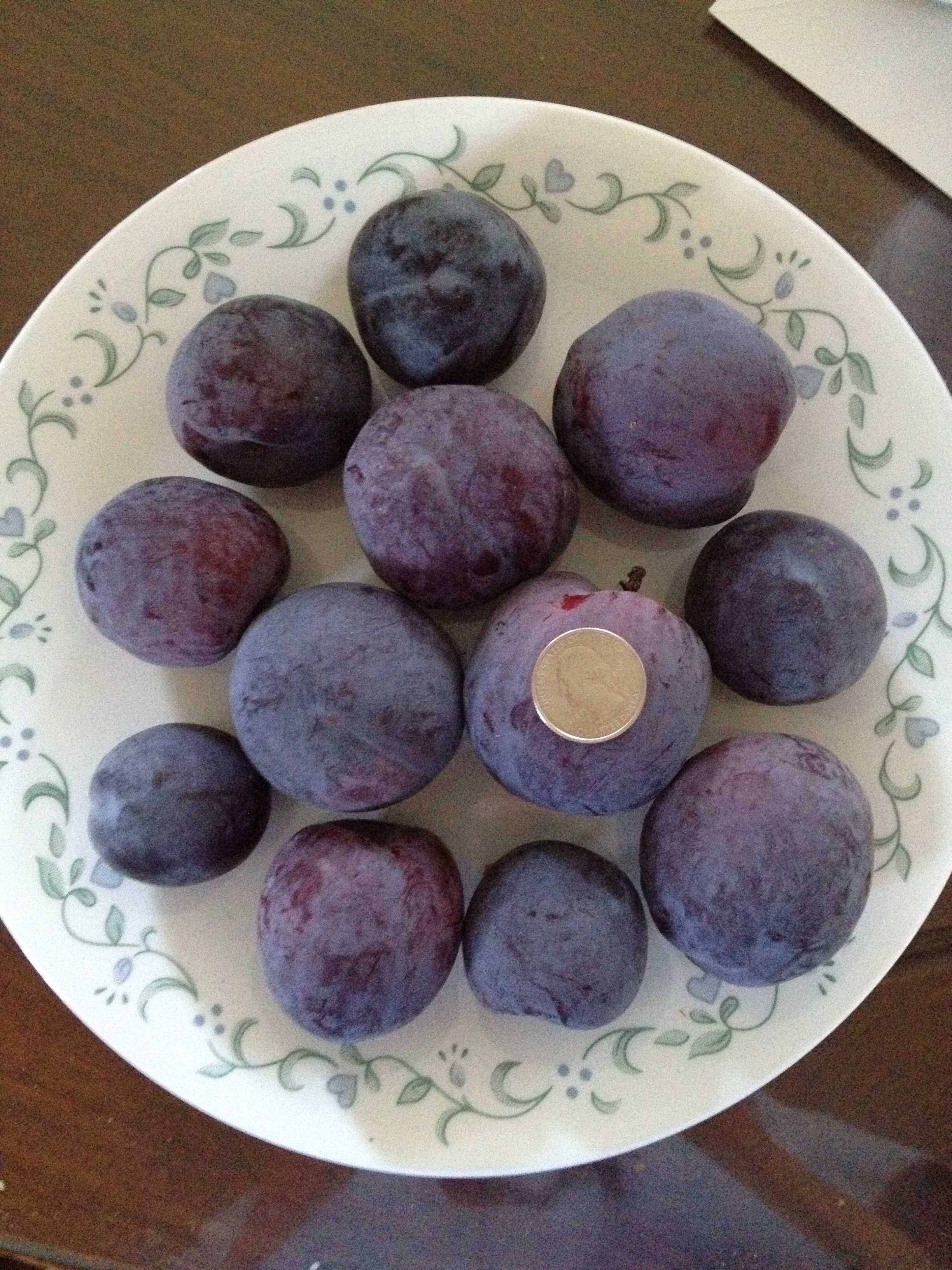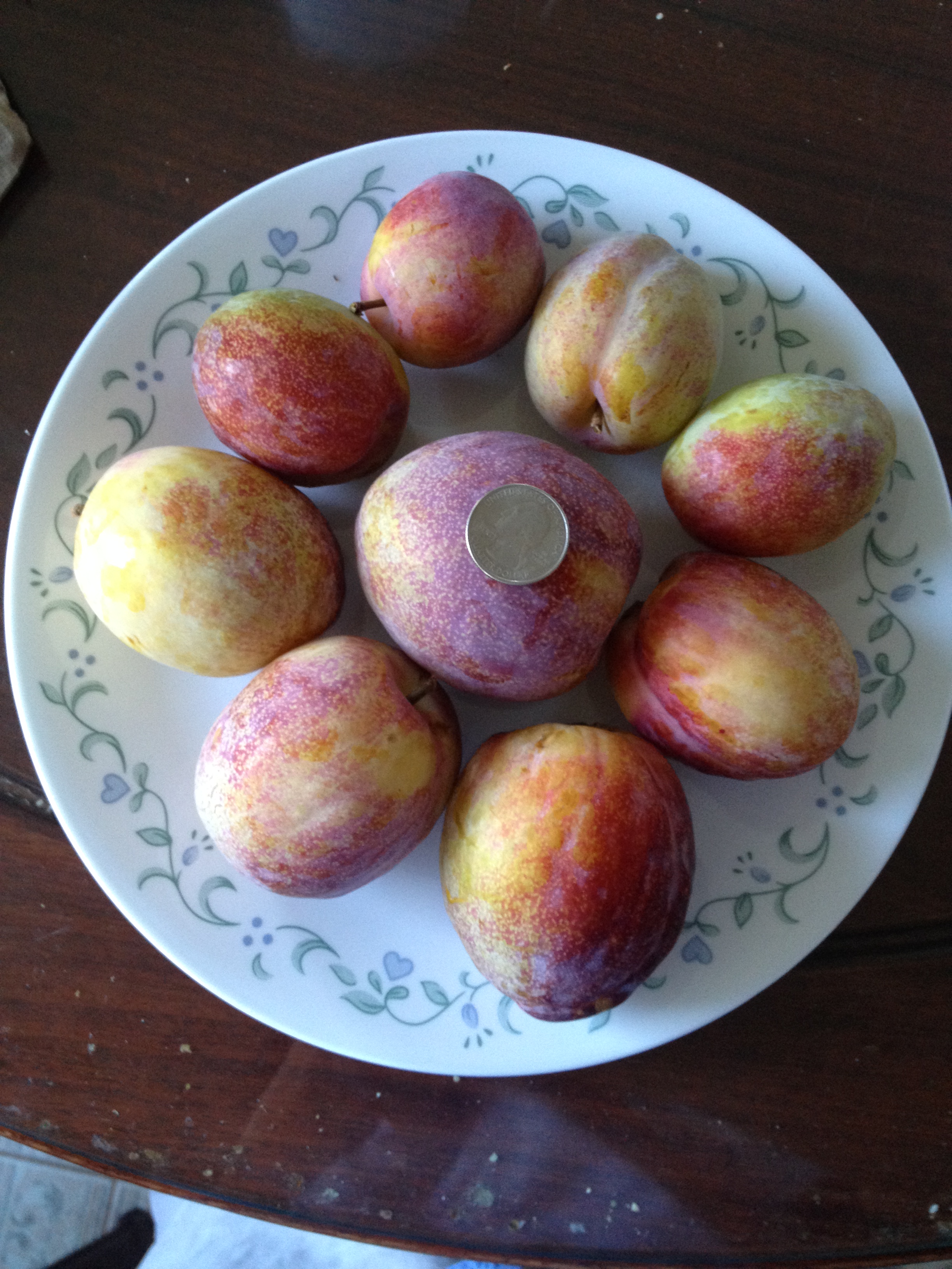 Elephant Heart plum: these dropped when I tried to put on the ziploc bags, or by the squirrels. They were green, but after a few days on the counter they changed color and became sweet.
