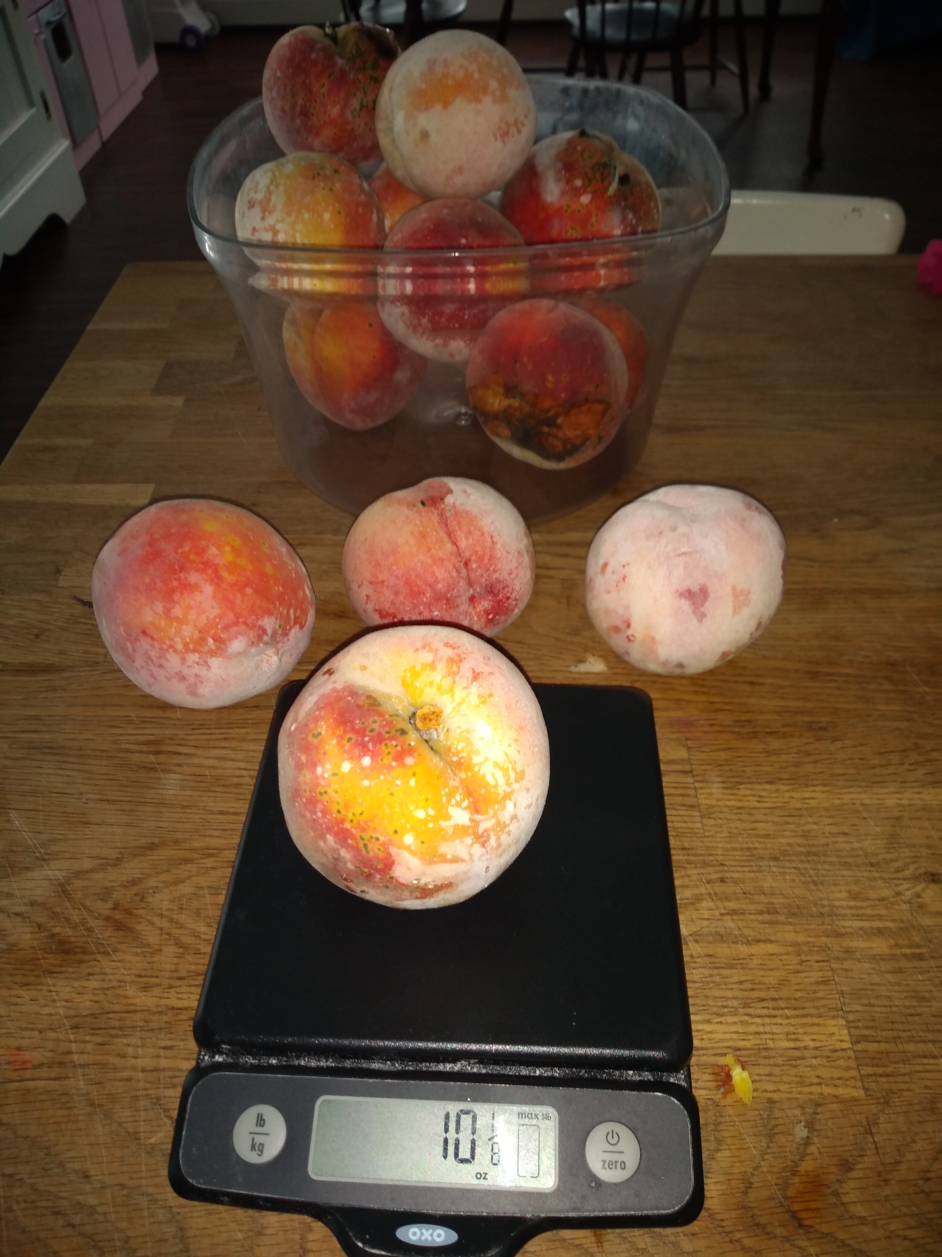These unknown peaches from my home Depot tree are huge this year. I guess this is what happens when you don’t let tree grow 250 peaches.