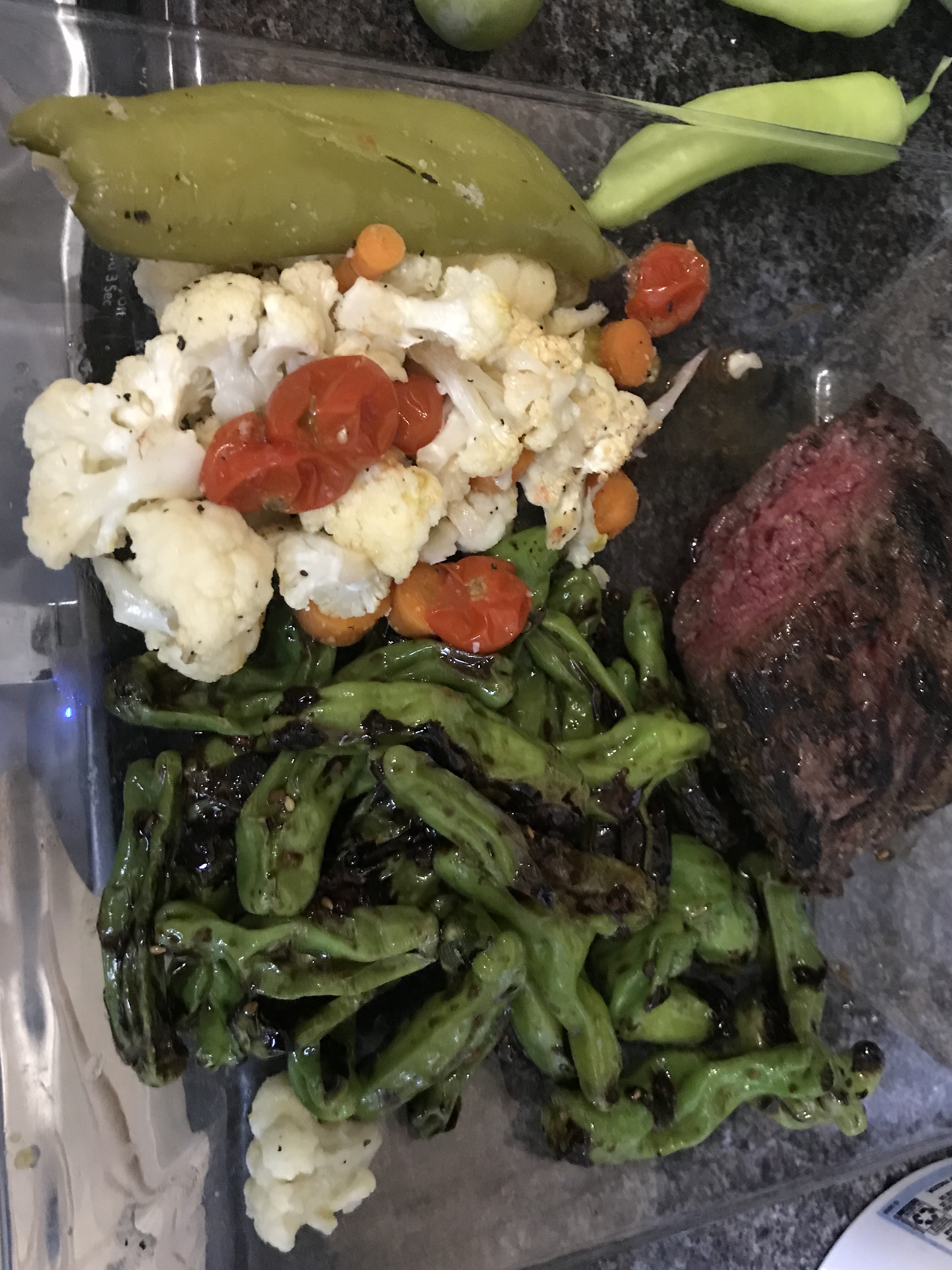 Everything here was organically grown in colorado and everything except the beef and cauliflower was grown by my Wife and I. This is roasted vegetables, blistered shishitos and reverse seared beef.