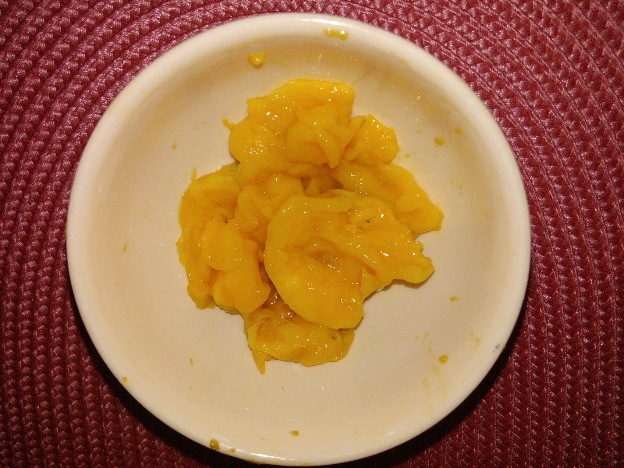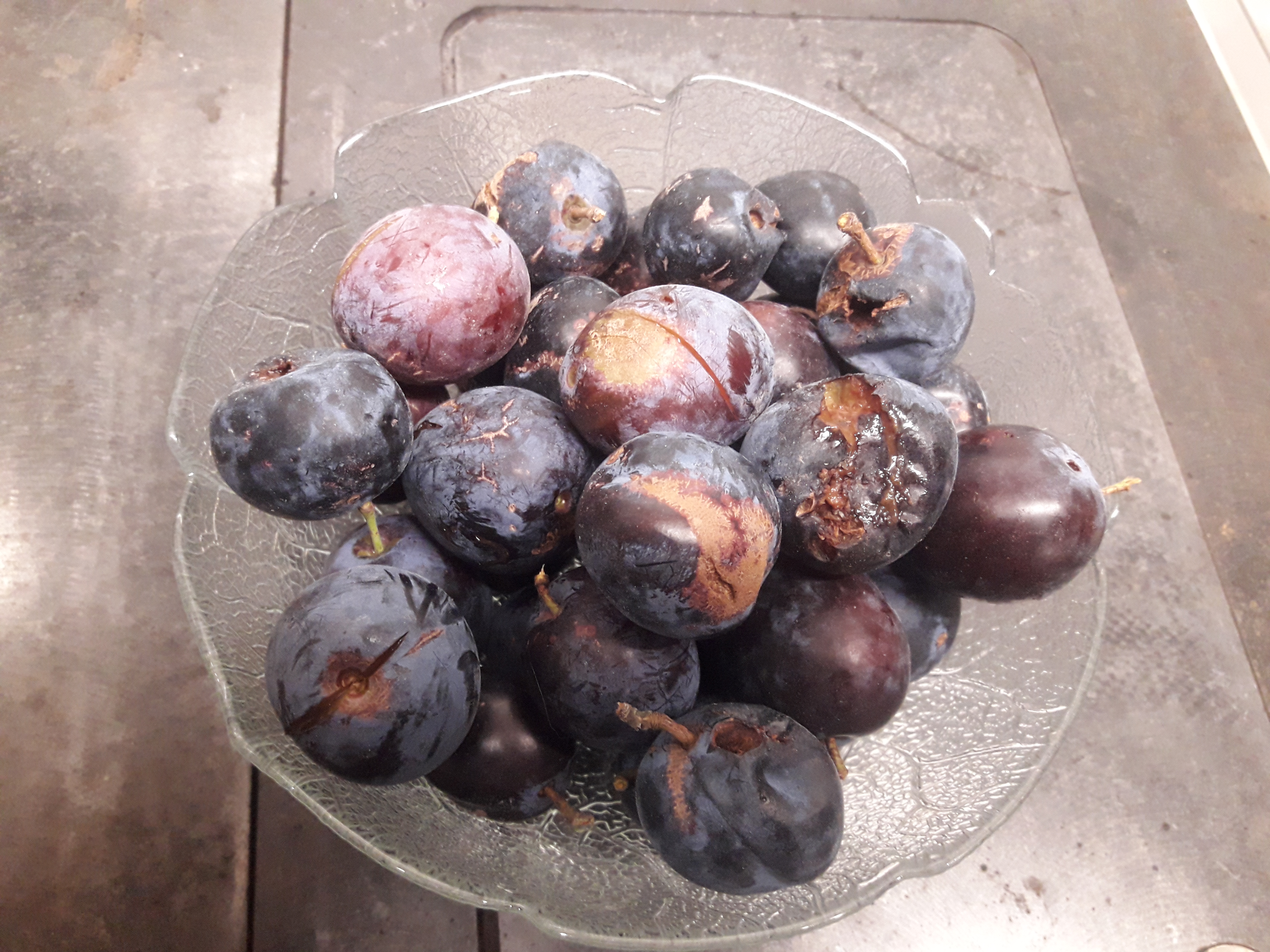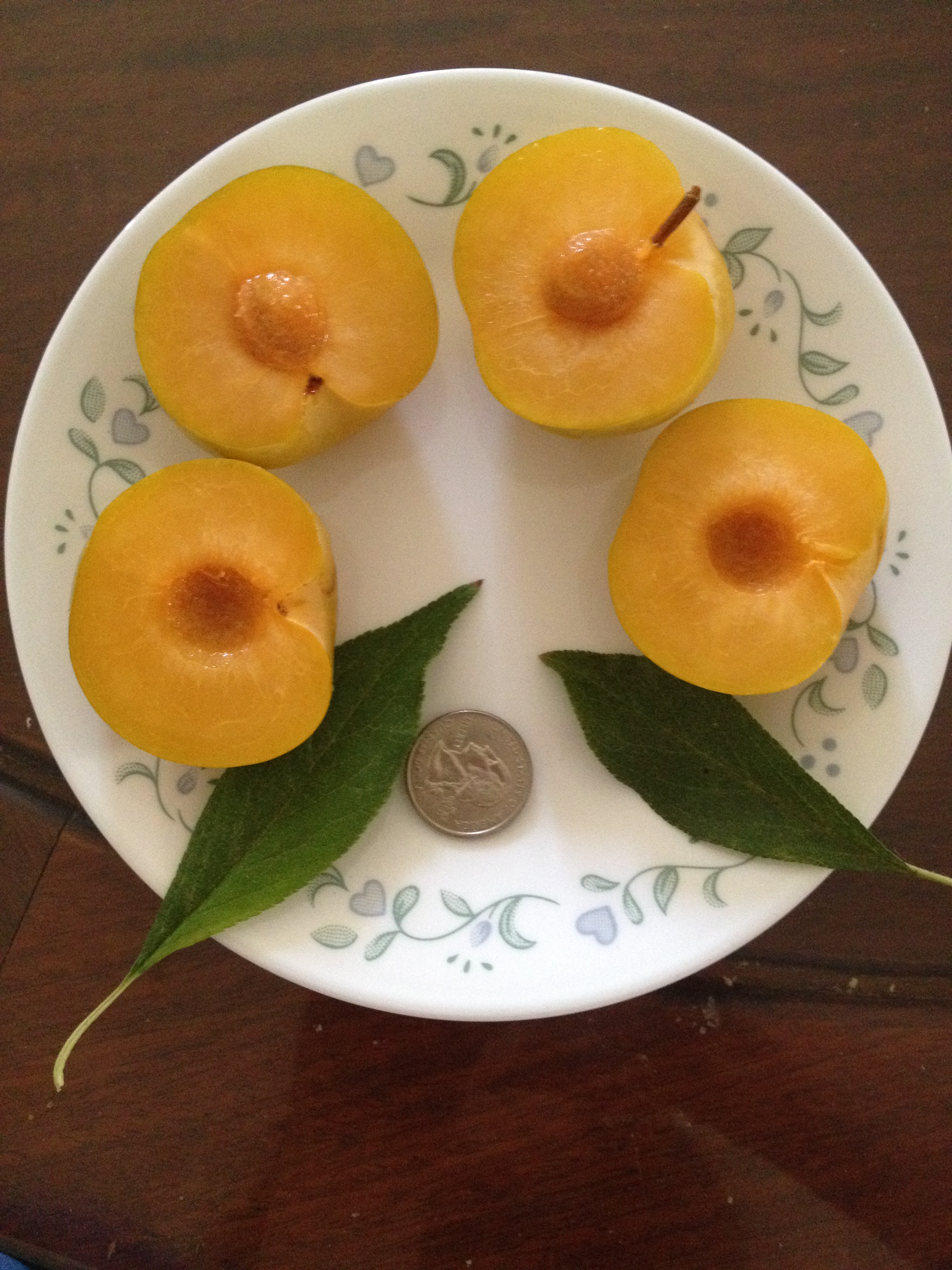 The other tree beside the compost has bigger fruit. They’re mostly freestone, too. These have a simpler flavour, but I like them well. I tried to shake the tree but sadly the fruit split if they fall on the ground. The damaged fruit on top happened this way.