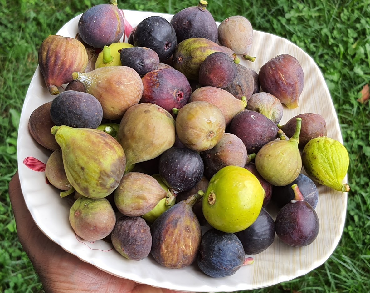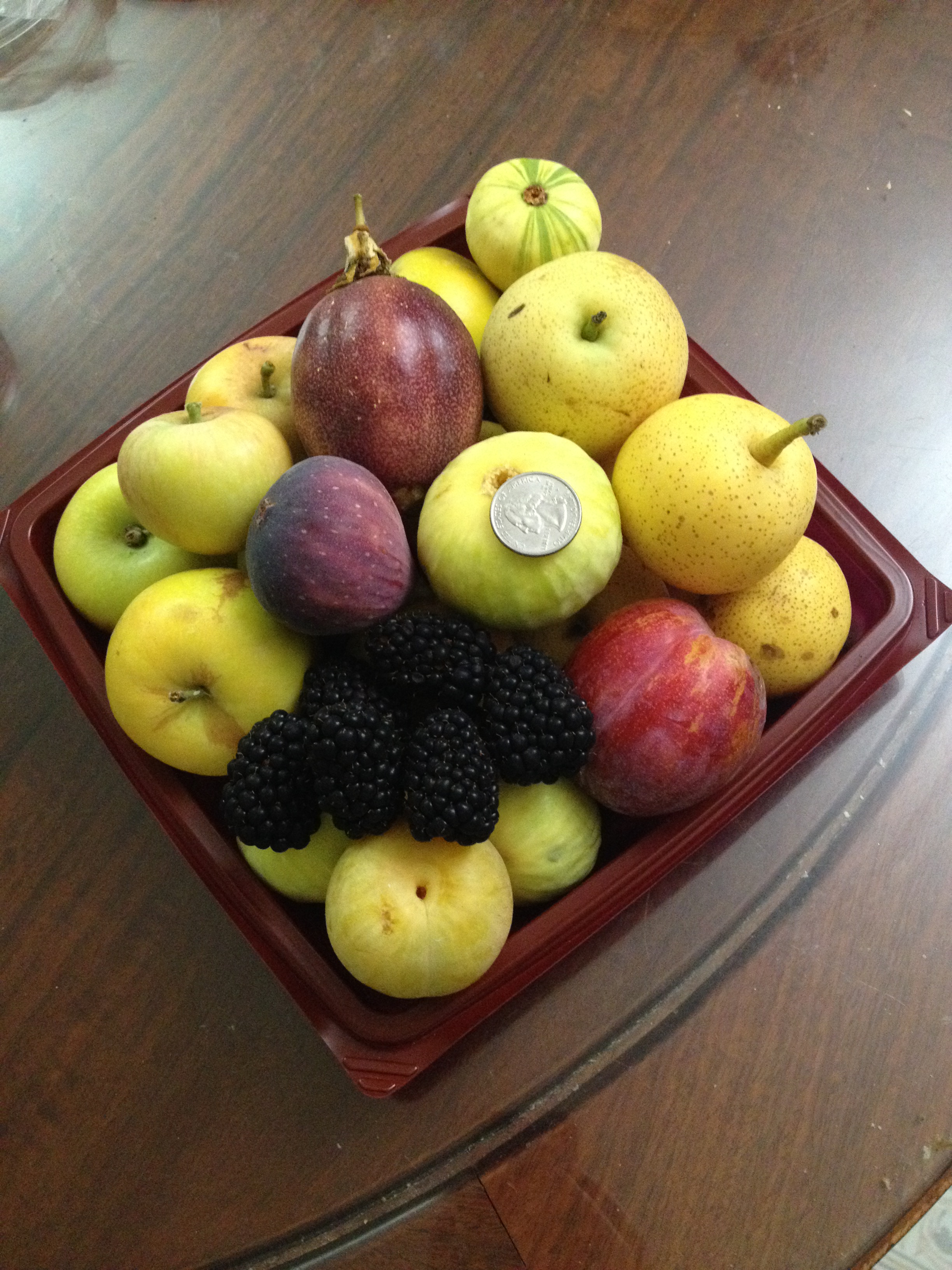 These are some of the fruits we picked today: asian pears, apples, figs, passion fruit, Flavor Grenade, Emerald Drop, and Prime Ark Freedom blackberries