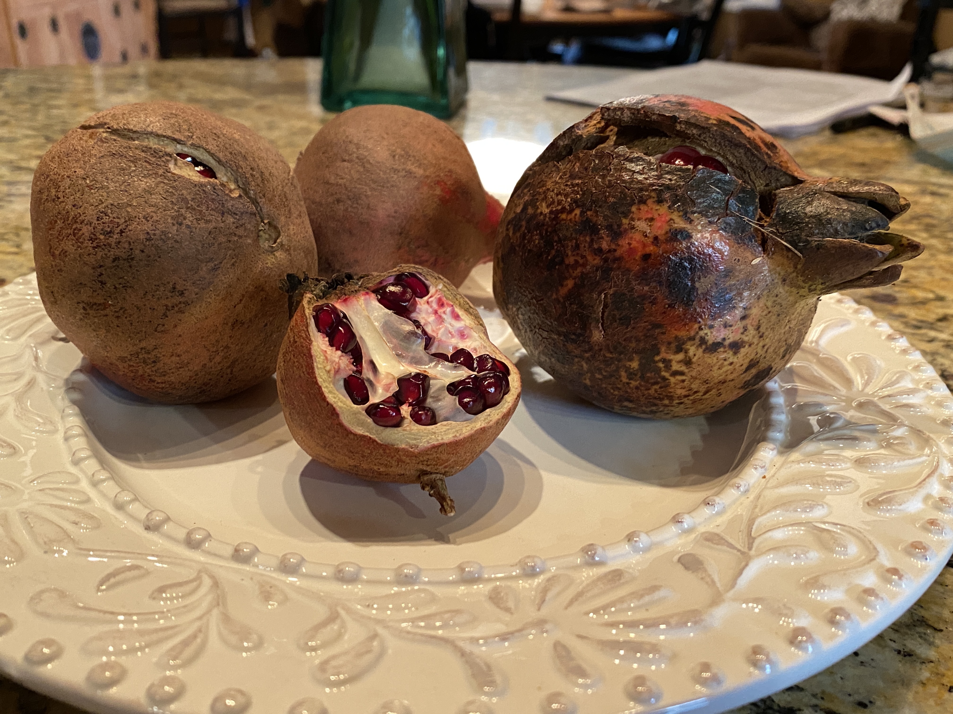 These pomegranates are Wonderful and Hotuni Zigar (largest on right). Had lots of others . . . but all had rot. Every last one.
