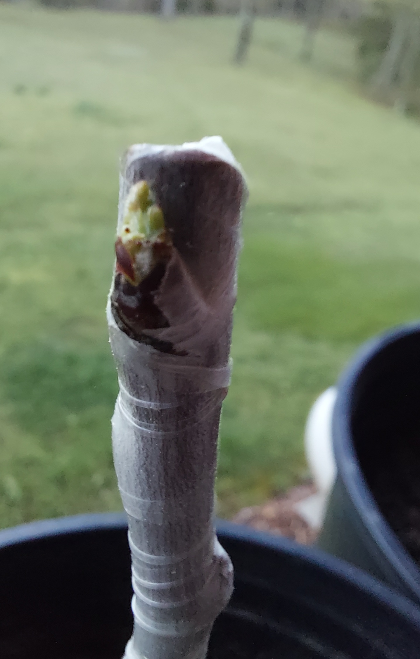 All 4 of my apple grafts have some nice bud swell now… breaking thru parafilm. This Novamac/B9 is showing some green. Love it. These are my first attempts at grafting.