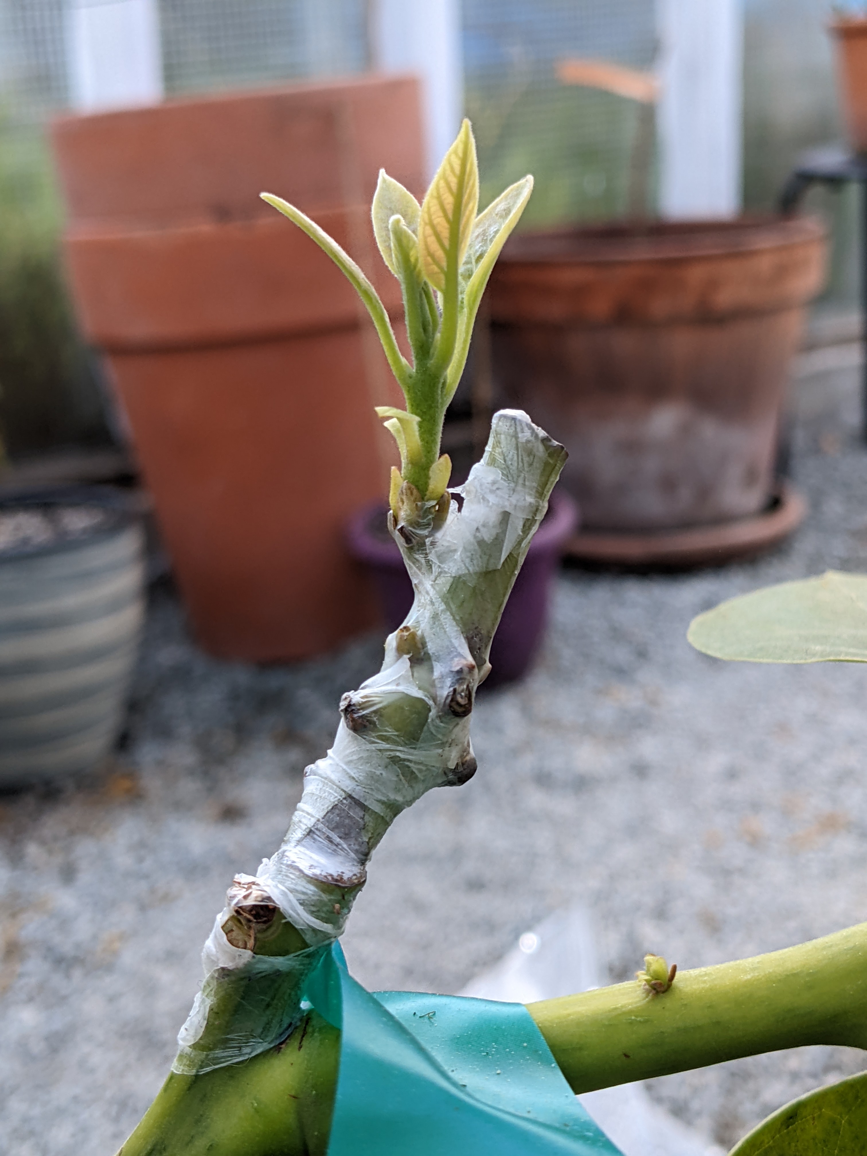 Latest graft (“Stewart”) on one of the multi-graft avocado trees is pushing nicely: