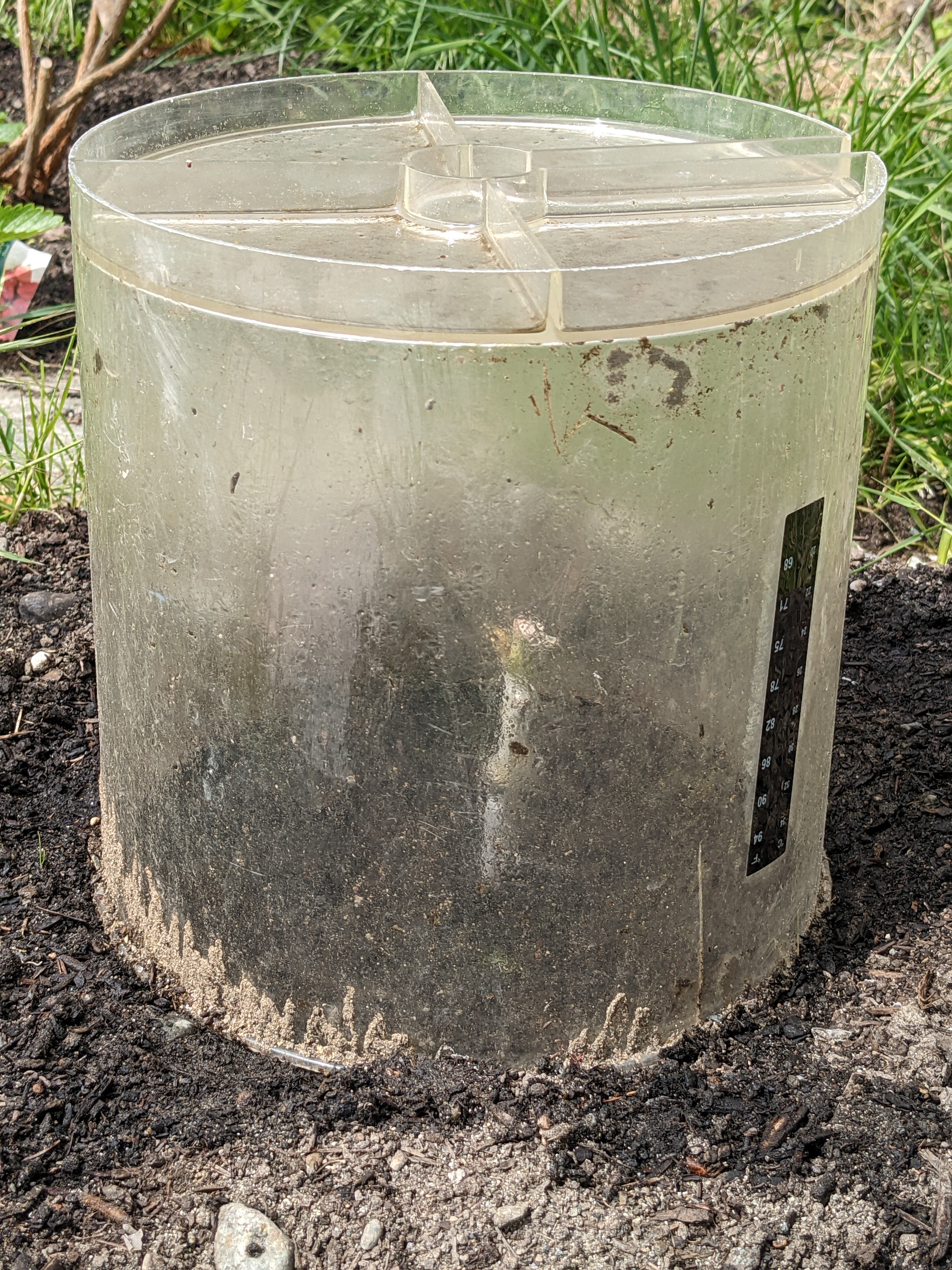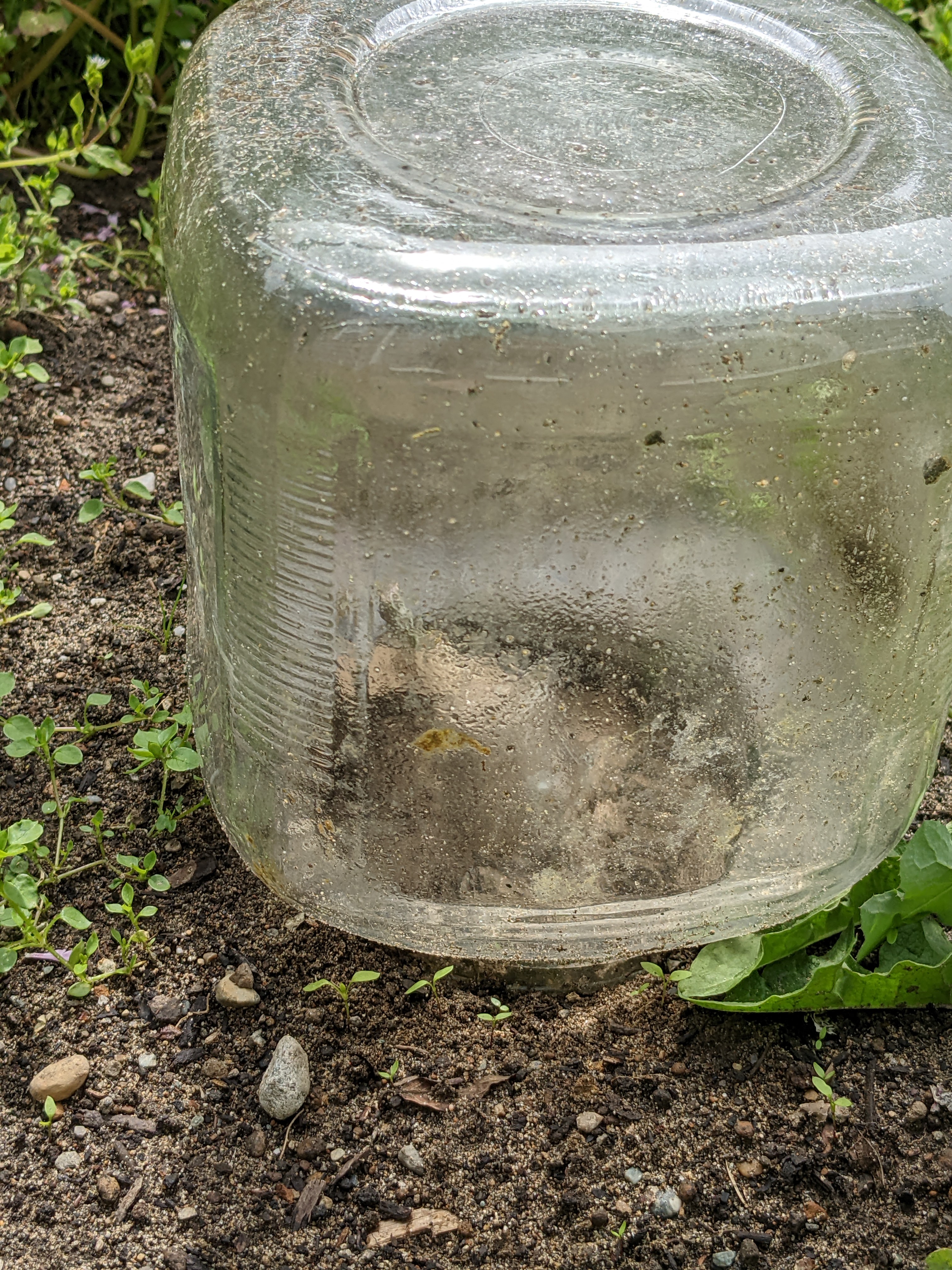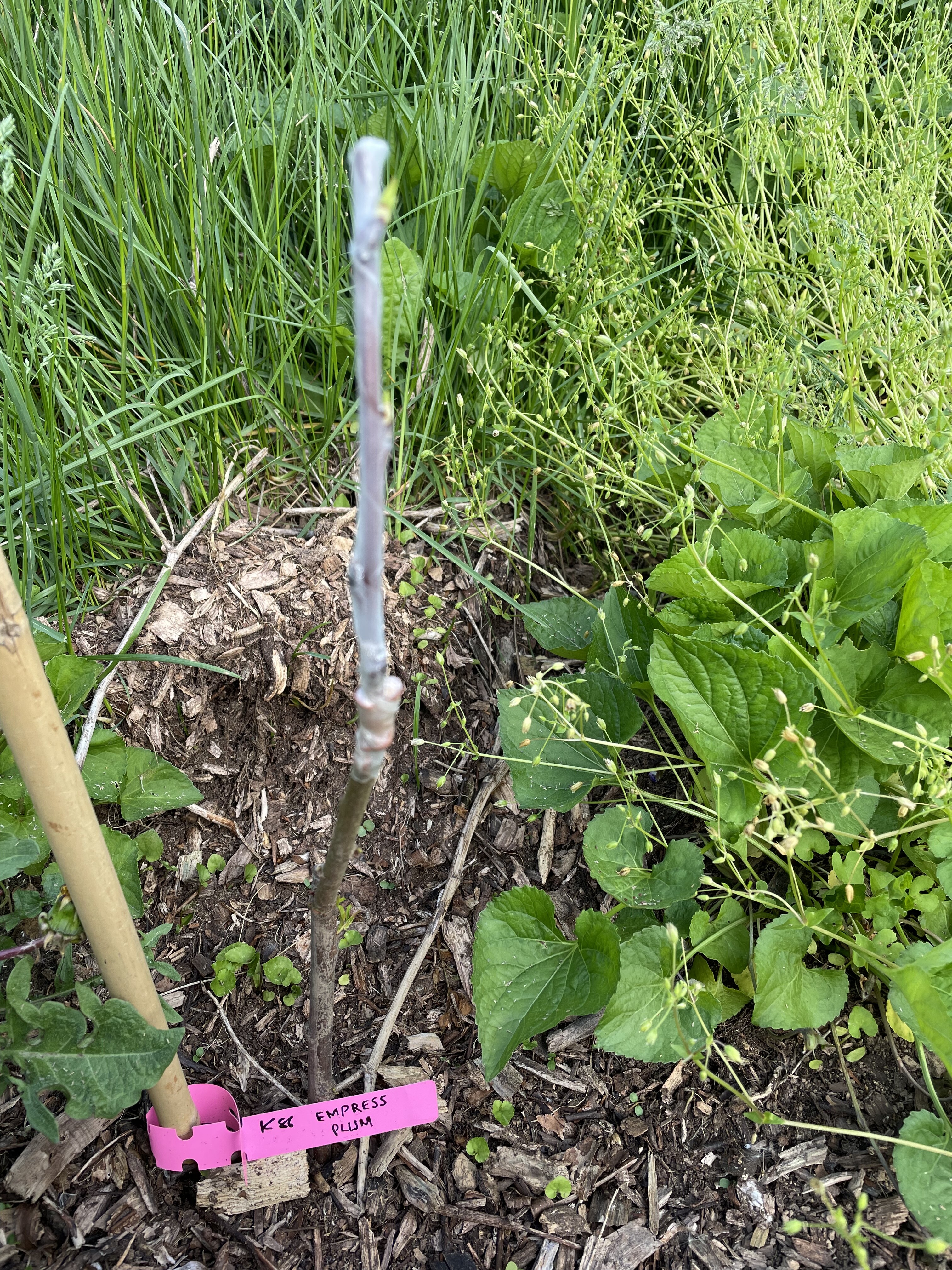 The second one originally had two scions, but a damn cat knocked one off while doing its business (that’s also why the graft is covered in dirt now). We’ve had a really cold spring, including a few freezes since these grafts were done. When it’s particularly cold, I put these makeshift (fishbowl) cloches on them:
