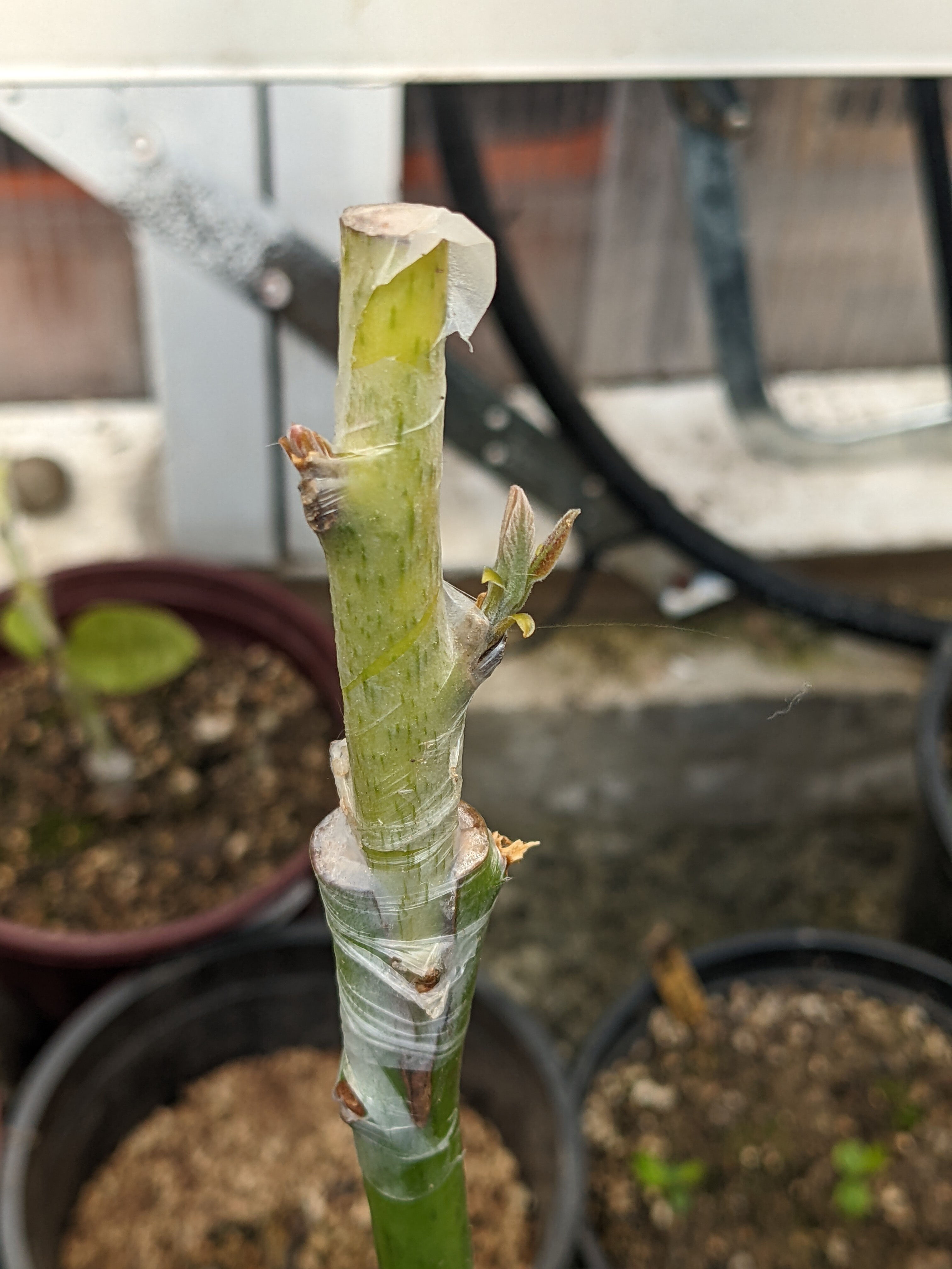 This is the first of the Long South Gate grafts that I did in February to push meaningfully, though a few others are swelling slightly (including ones in the ground outside, surprisingly):