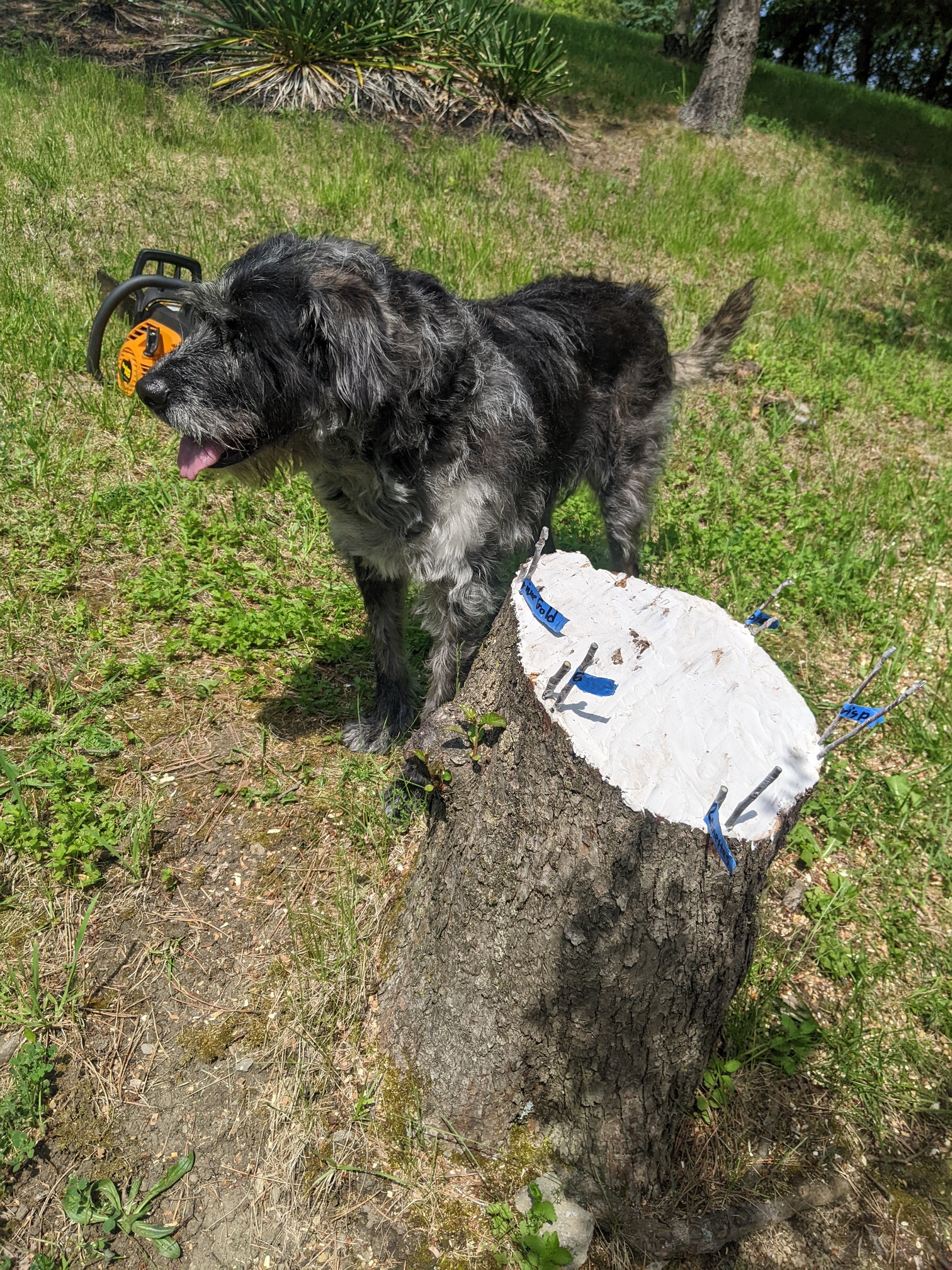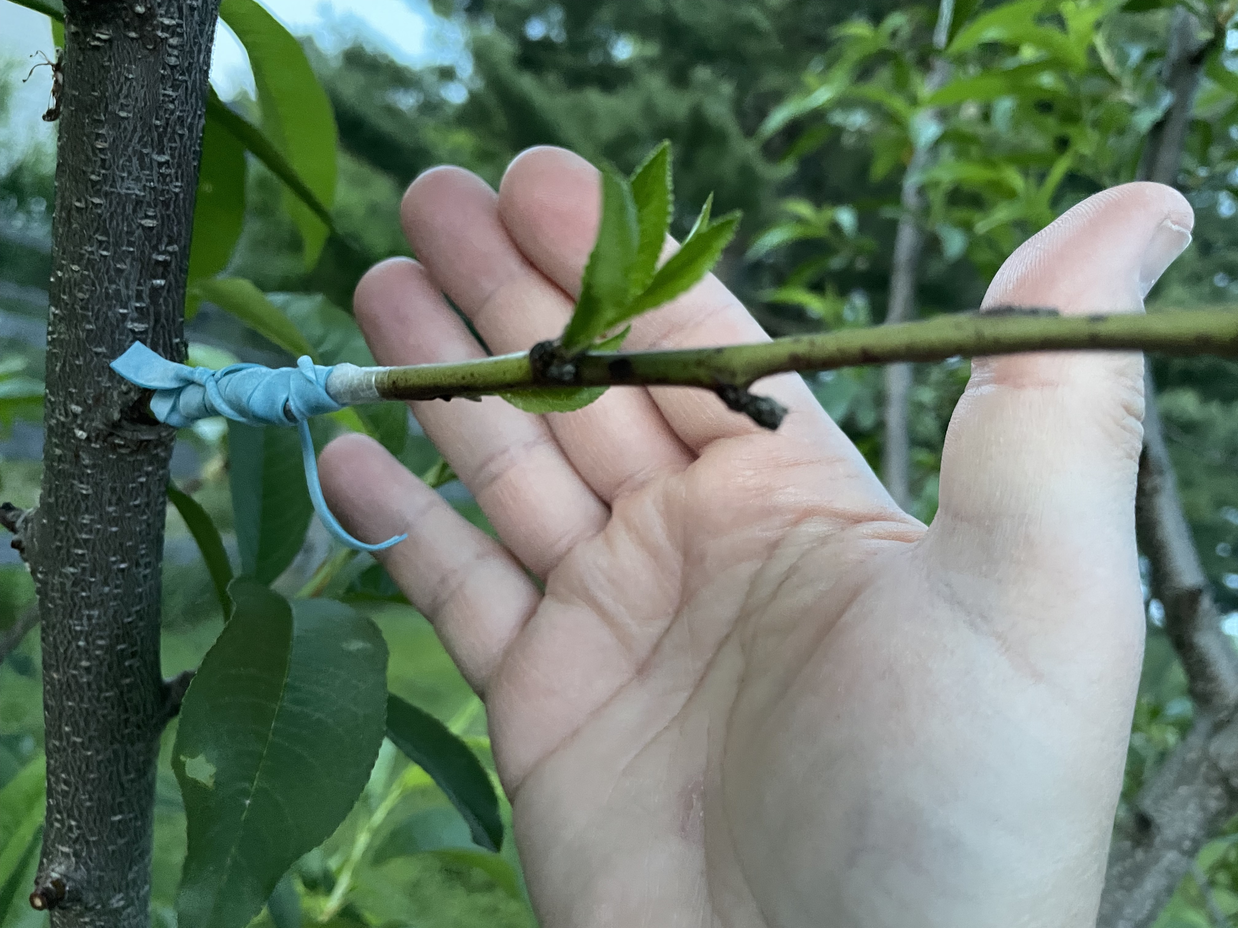 With the thick bark it looks funny, the scions so inset. I’m used to grafting younger limbs. Cool.