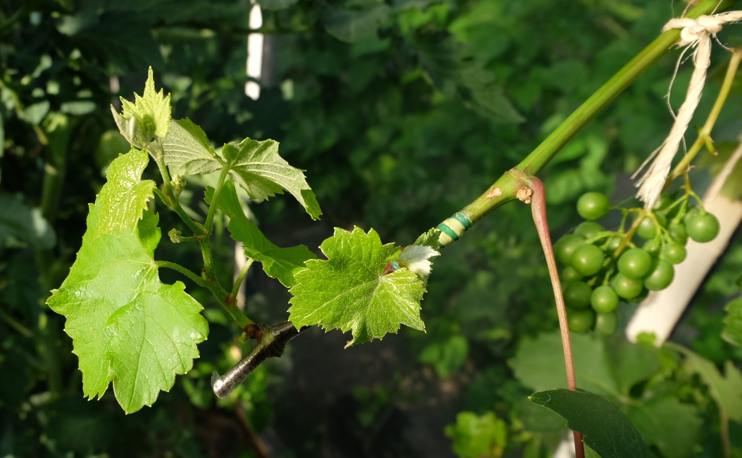 Then if you look there in the front left, near the top of that green stake… you will see one shoot coming out the low front left. That is one of the buds / shoots from that scion that was slower to take than the rest. It is much smaller, I actually thought it might die (get shaded out) at one point there because the rest were growing so much faster… but nope, now it has started growing, and yesterday was making its way out the low/mid front left there.