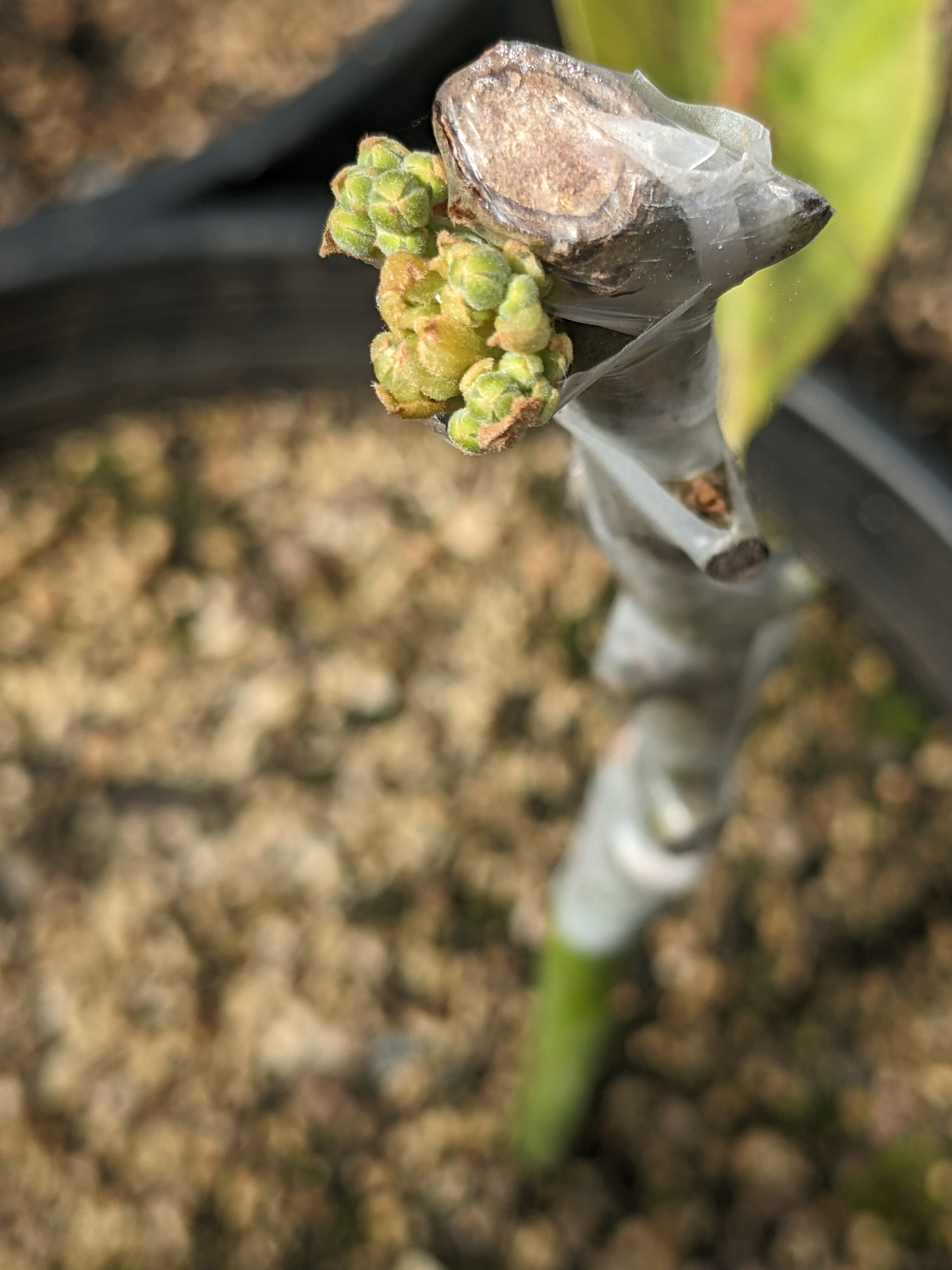 Most of the avocado grafts I did in January and February are starting to push now. Mostly vegetative buds, but here’s one of the scions that @jsteph00921 sent me from an unknown cultivar growing near Santa Rosa (possibly Mexicola or a seedling tree), pushing a flower cluster instead: