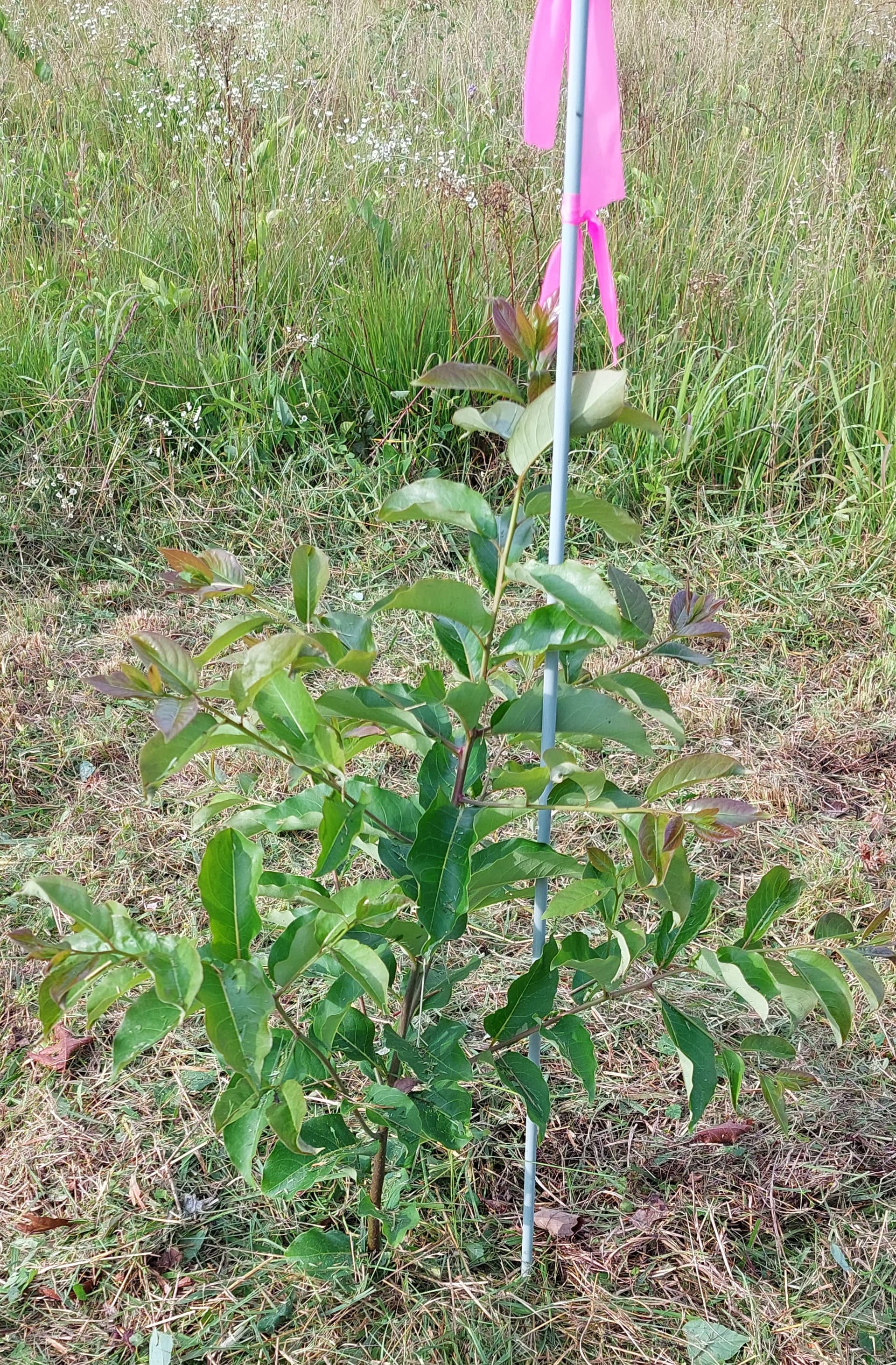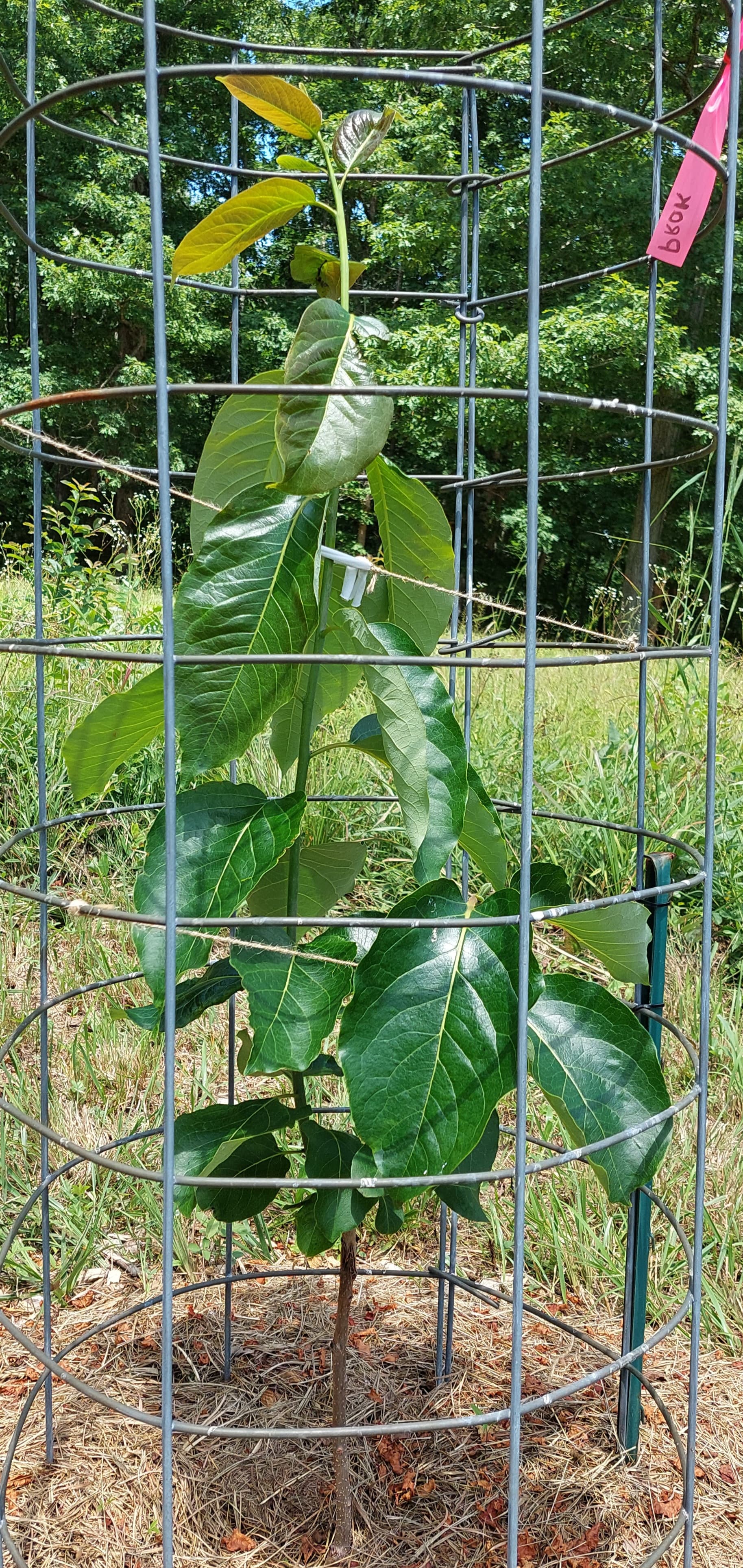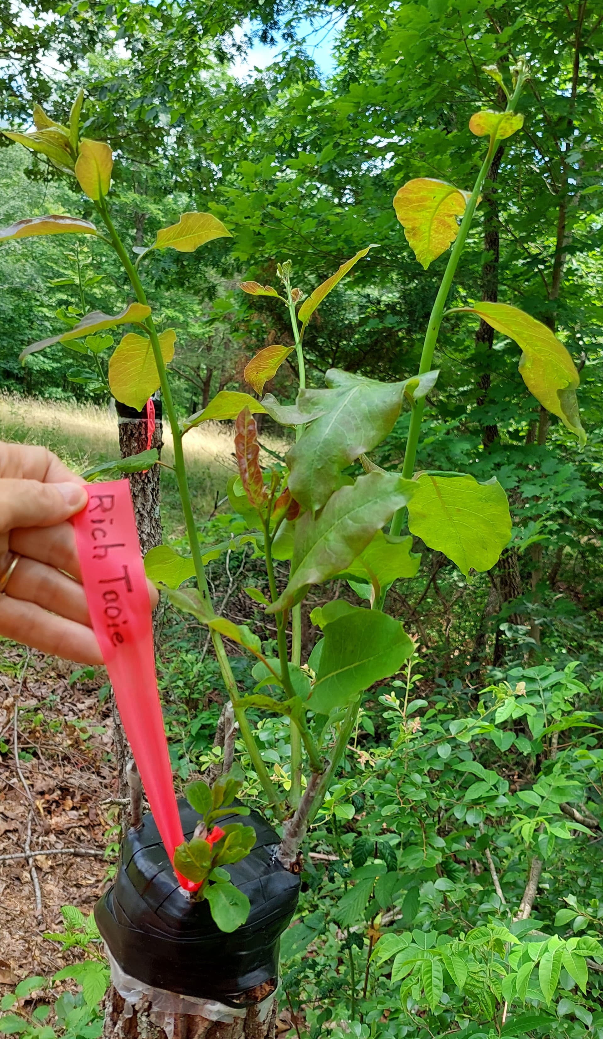 This is one of the wild DV I selected for grafting next spring. A stake and flagging so my bushhog guy does not take it out… and this evening I cut a weedeater space around it so the bushhog guy can see it better and does not feel like he has to mow so close to it.