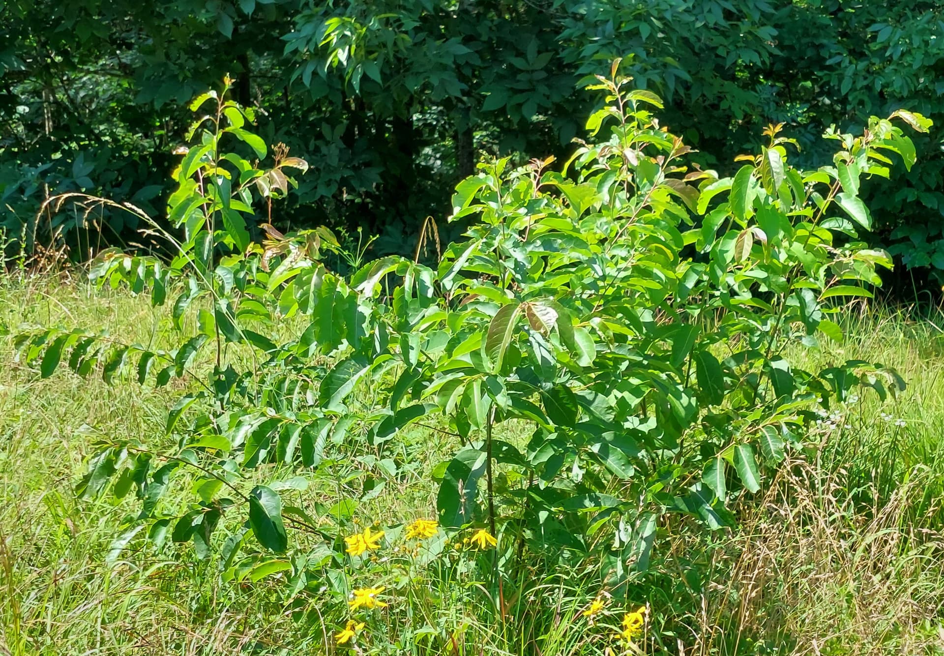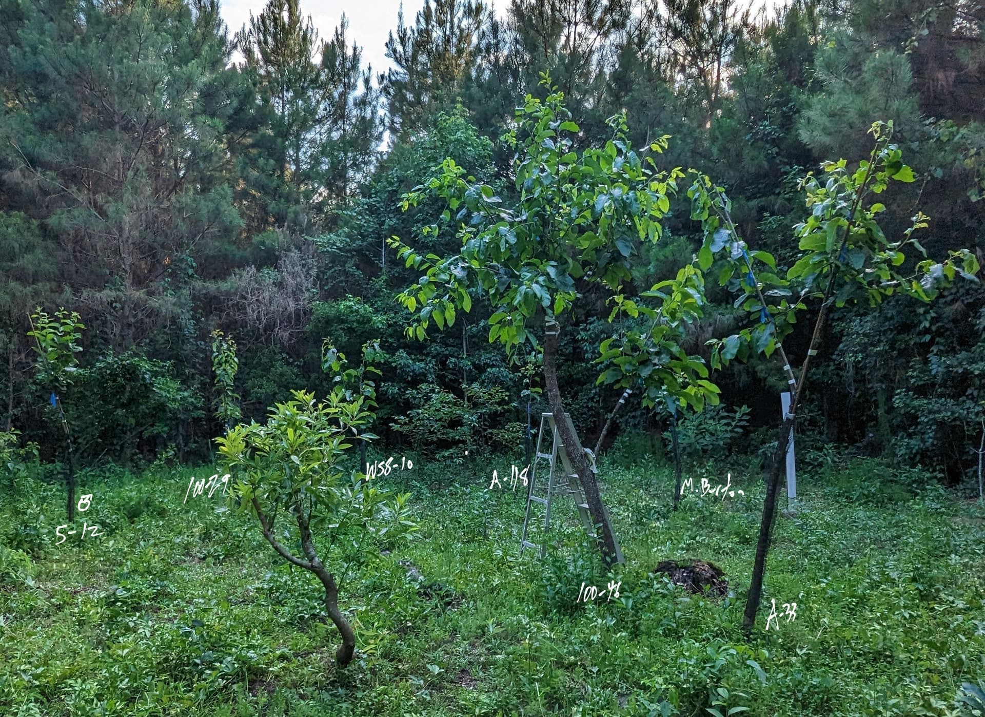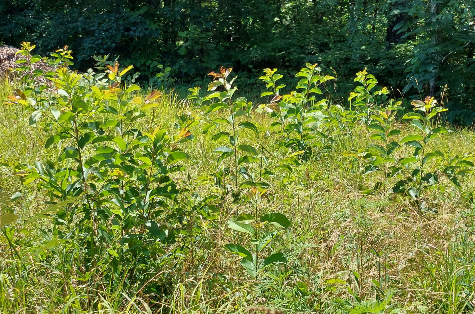 First listing my wild persimmons. I have something like 60-70 wild persimmon seedlings in my fields… it would be difficult to count them all but they just pop up everywhere in my fields. Note these fields were bushhogged last October and the growth you are seeing now all happened this spring and early summer. These have somewhat established root systems and push top growth much better than a true seedling persimmon would.