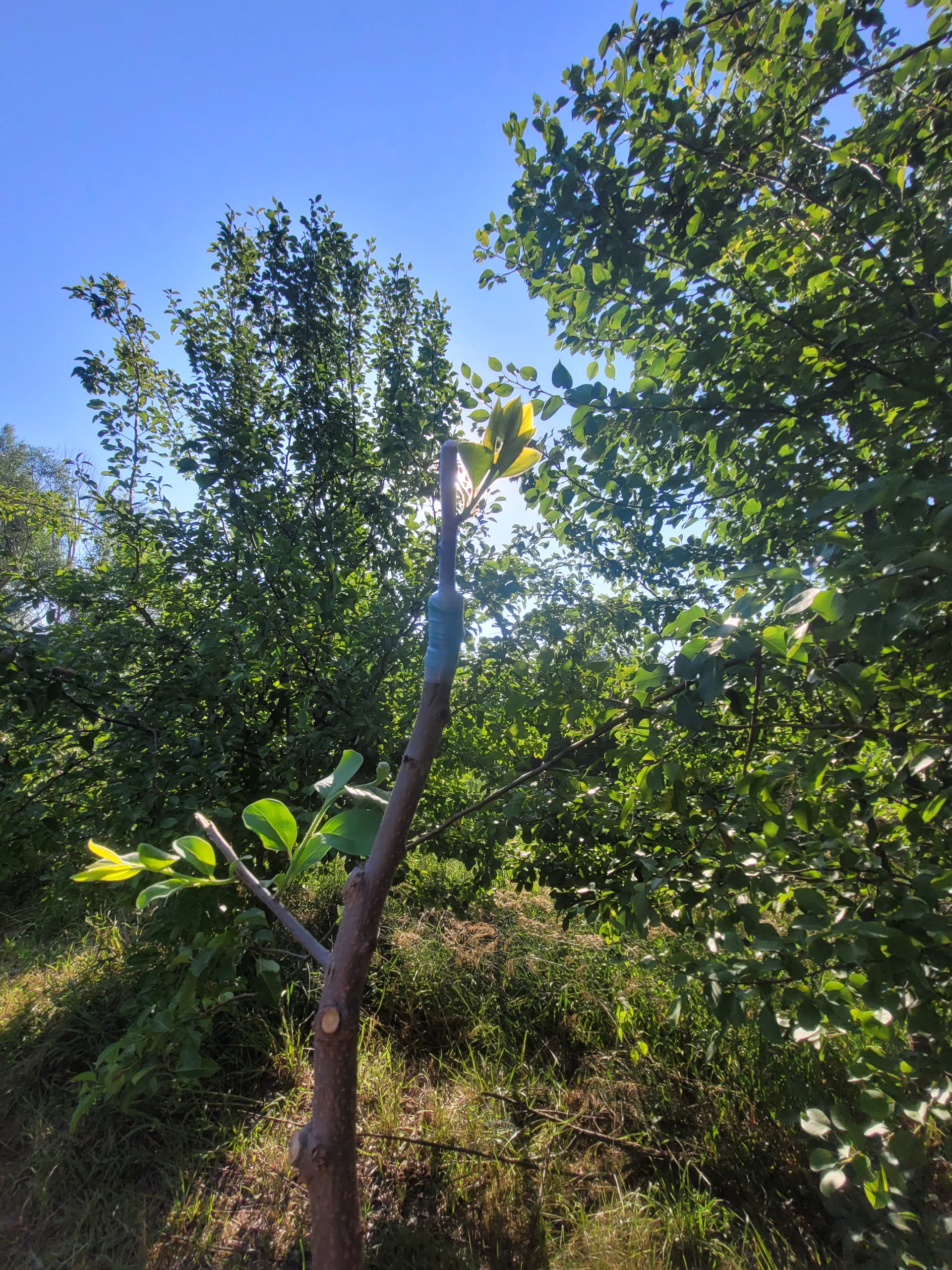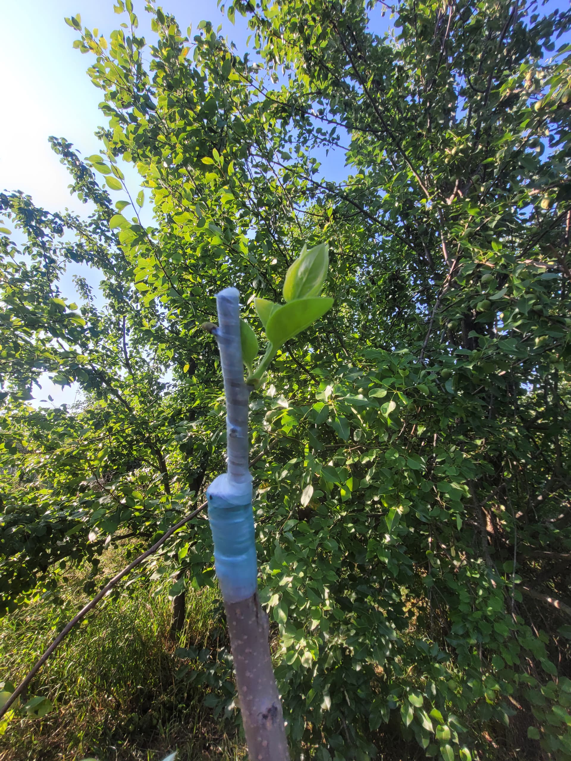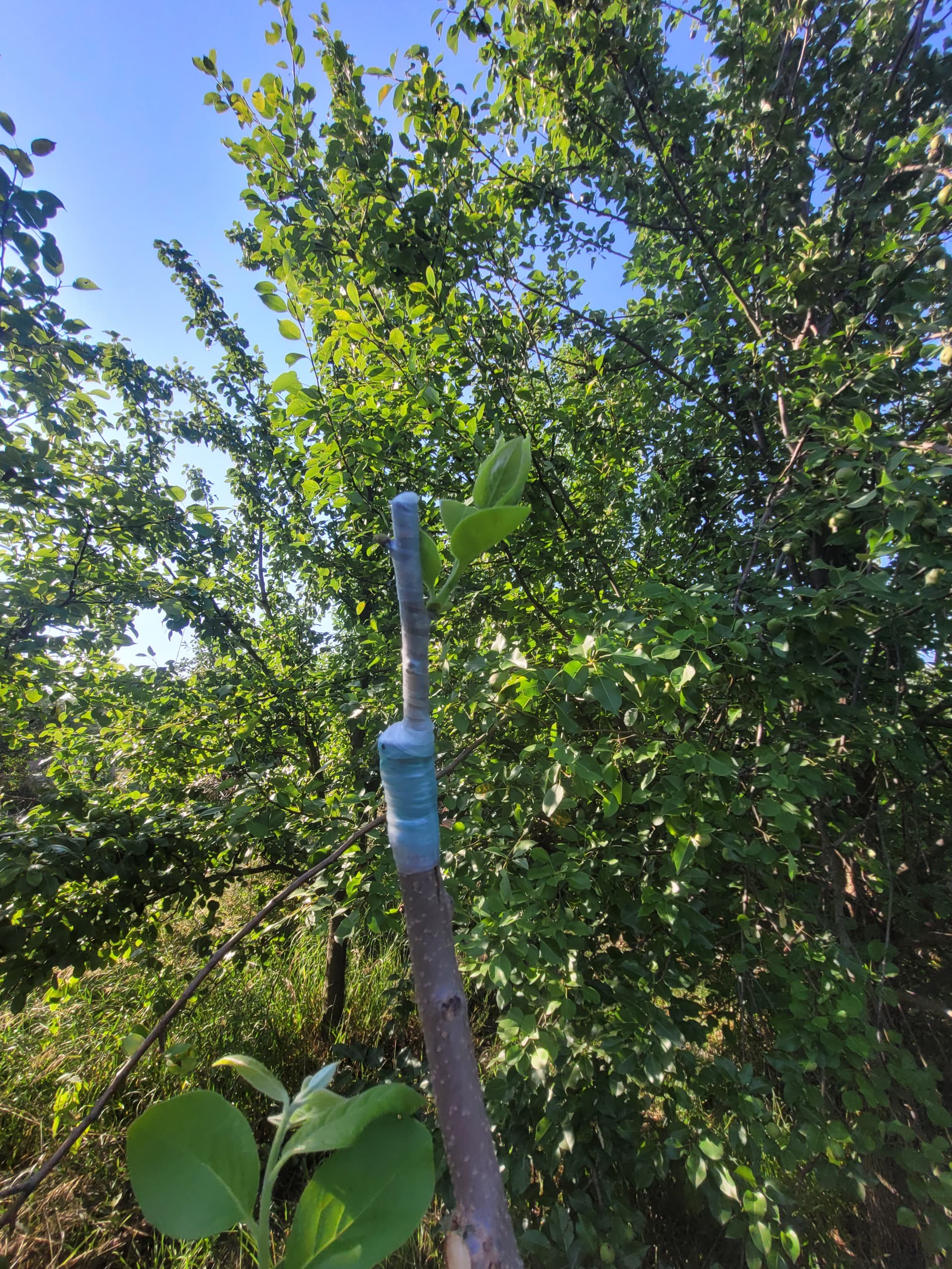 I like 1/4” strips of friction tape to bind the union and redirect the small side branches upwards. Ill put velcro tape around the new growth up the sacrificial stem at intervals as it grows, plus one around the graft union when i remove the friction tape in late july or so. This makes for a pretty wind resistant graft since its well supported, and when the tree blows, the stem provides support while moving with the scion.