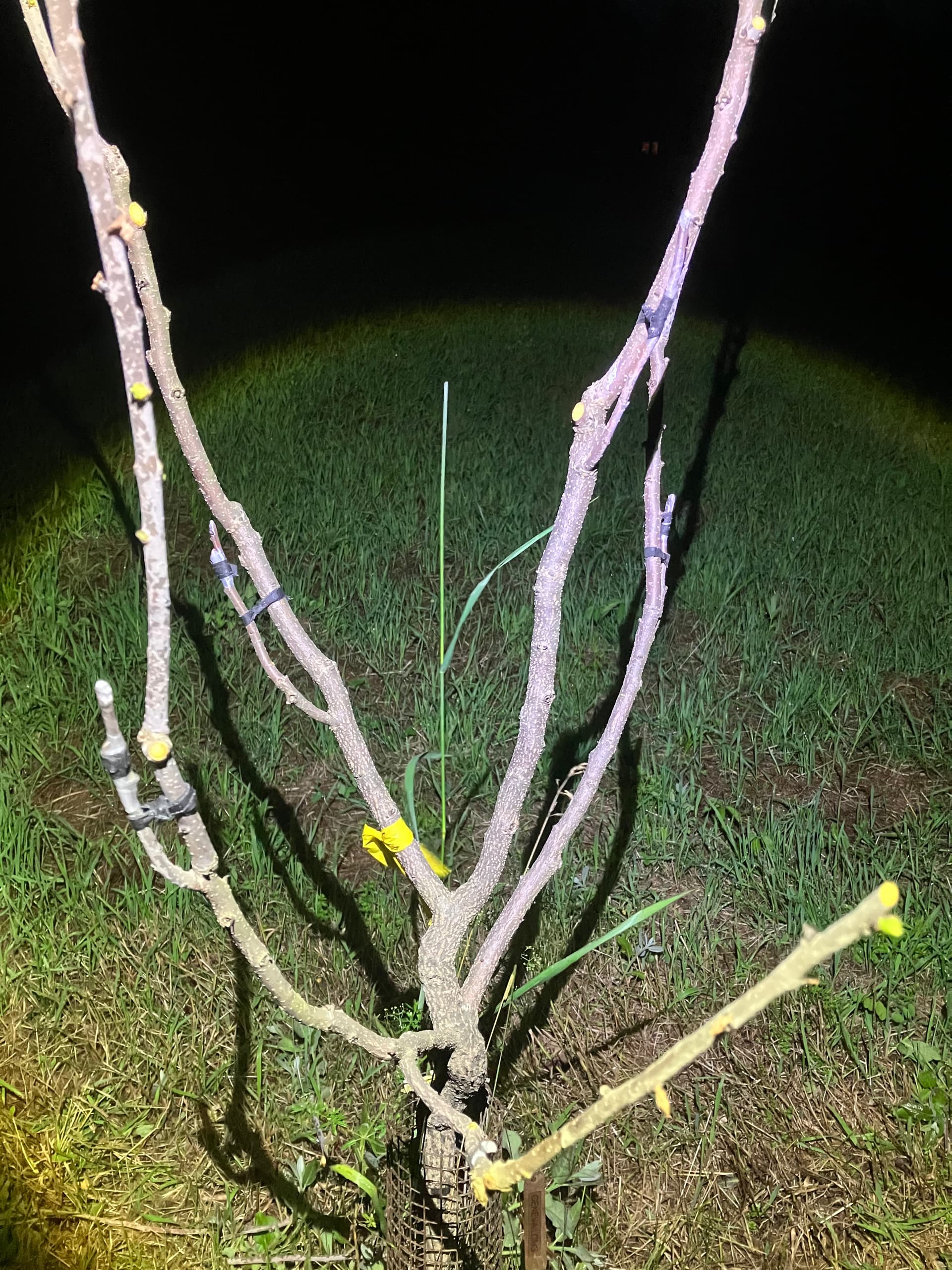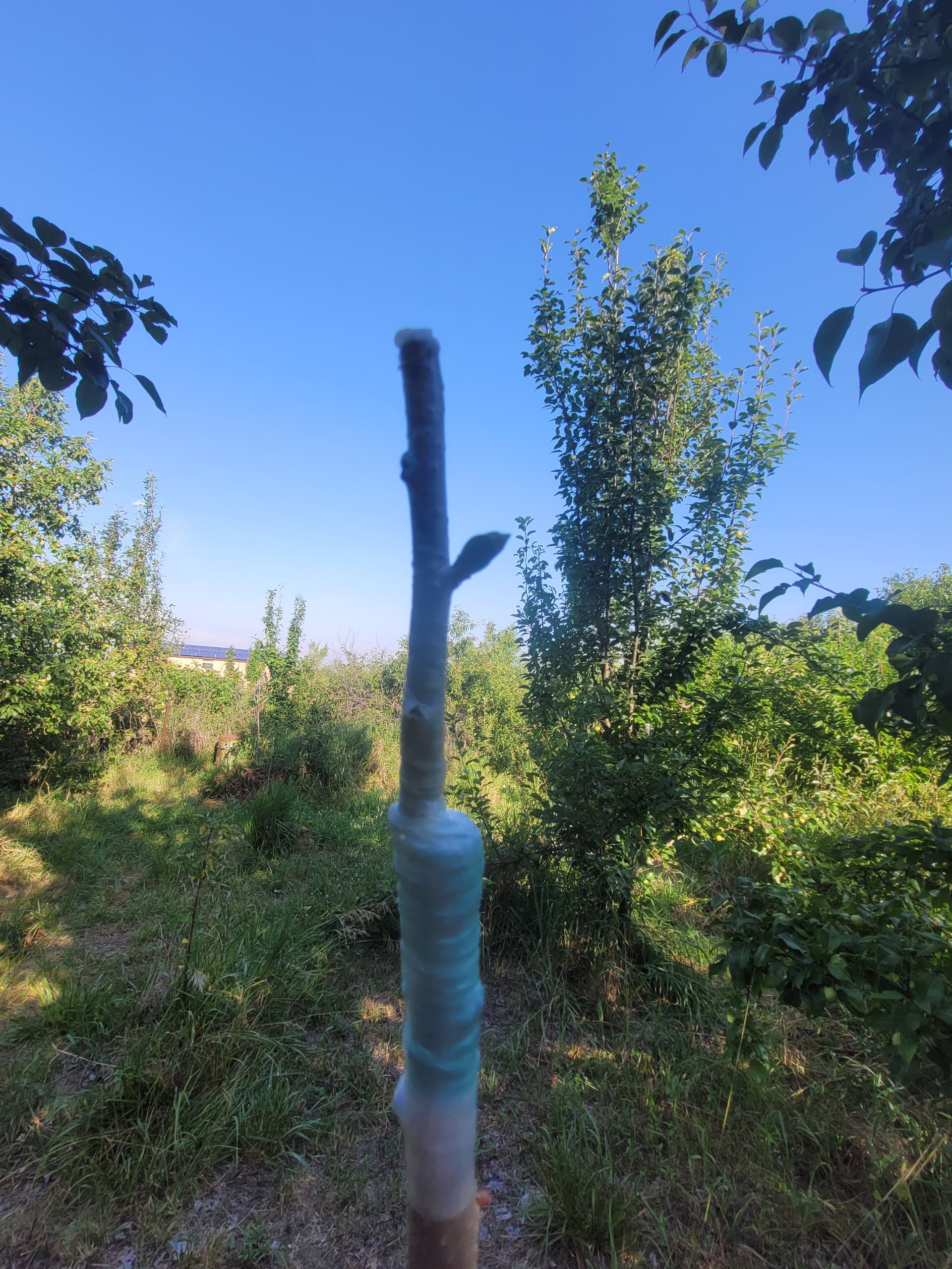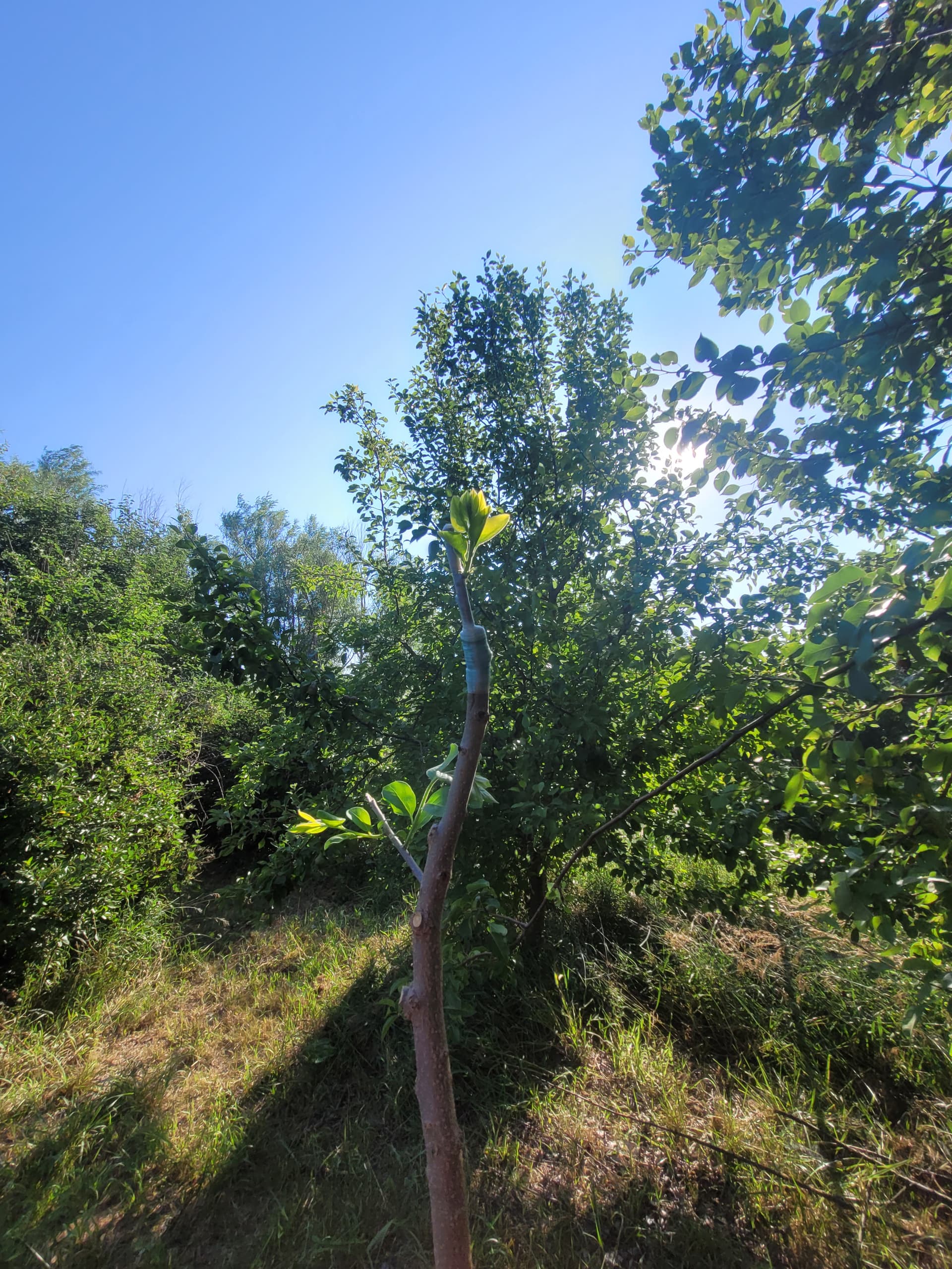 I like 1/4” strips of friction tape to bind the union and redirect the small side branches upwards. Ill put velcro tape around the new growth up the sacrificial stem at intervals as it grows, plus one around the graft union when i remove the friction tape in late july or so. This makes for a pretty wind resistant graft since its well supported, and when the tree blows, the stem provides support while moving with the scion.