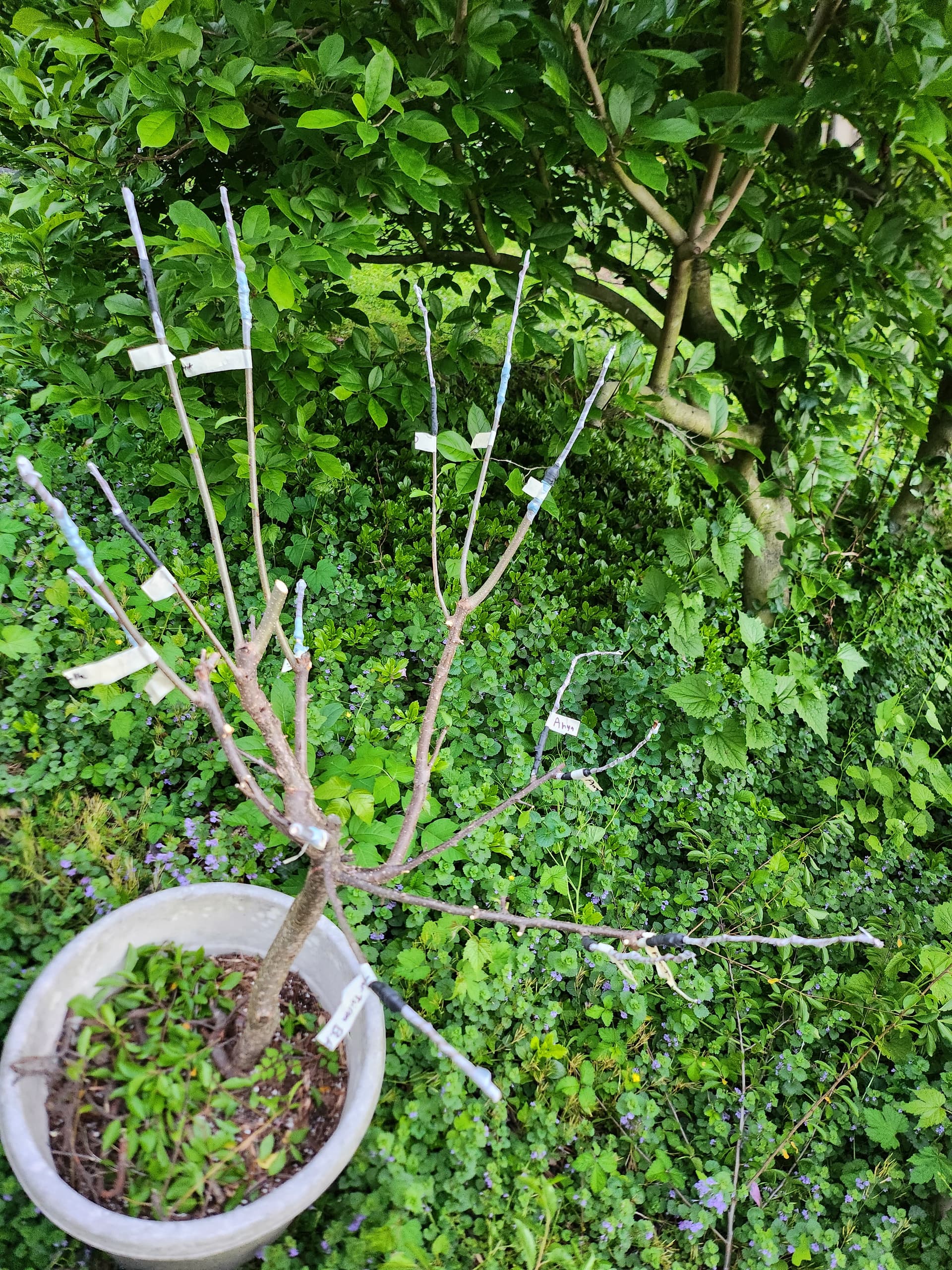 17 grafted euro plums (and a few apricots just did that will prob die of disease or get its flowers spring-frosted but we’ll see). So 3 or 4 branches of 4-5 diff varieties, will remove the less dominant/unsuccessful branches later in the summer.