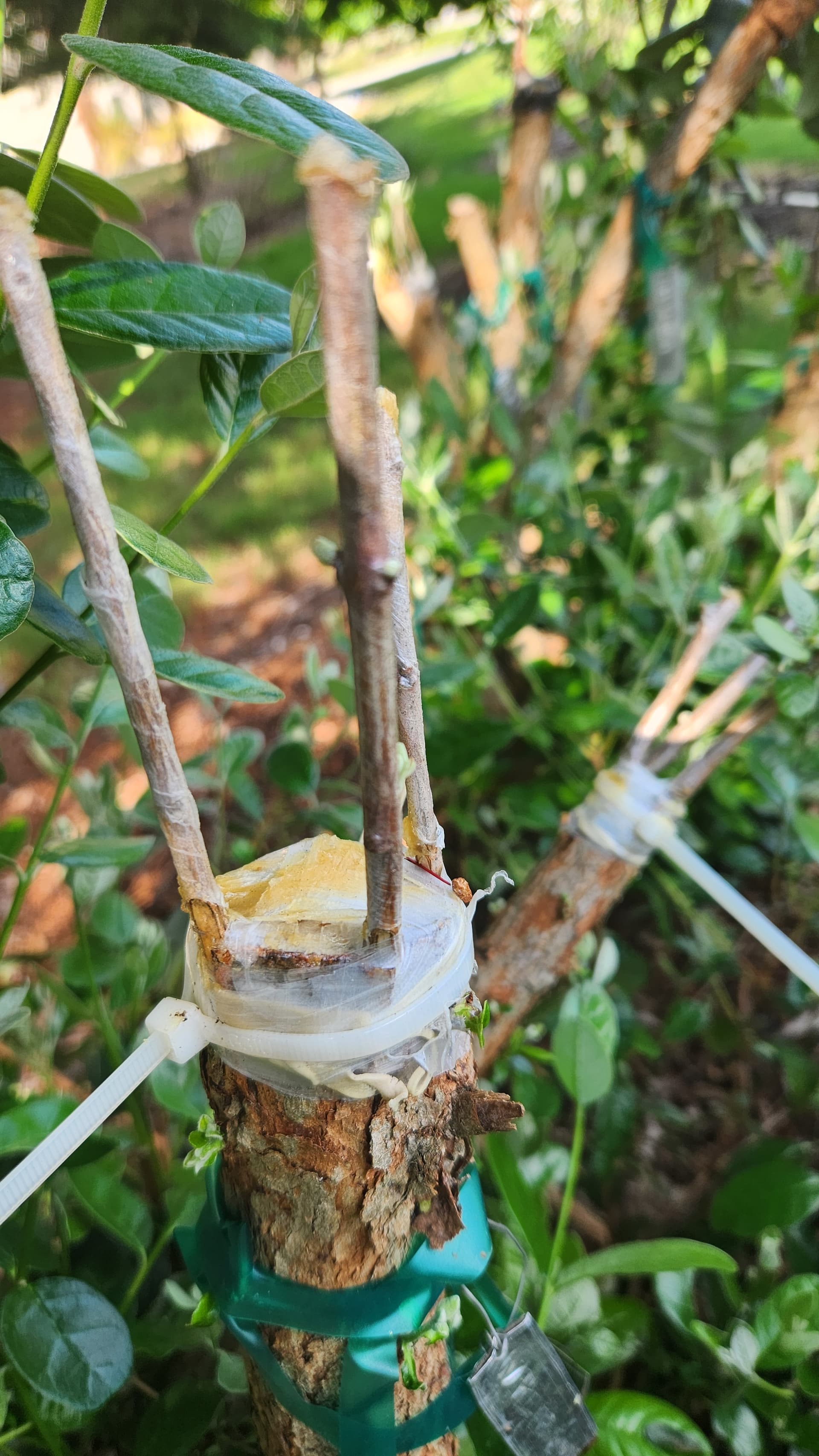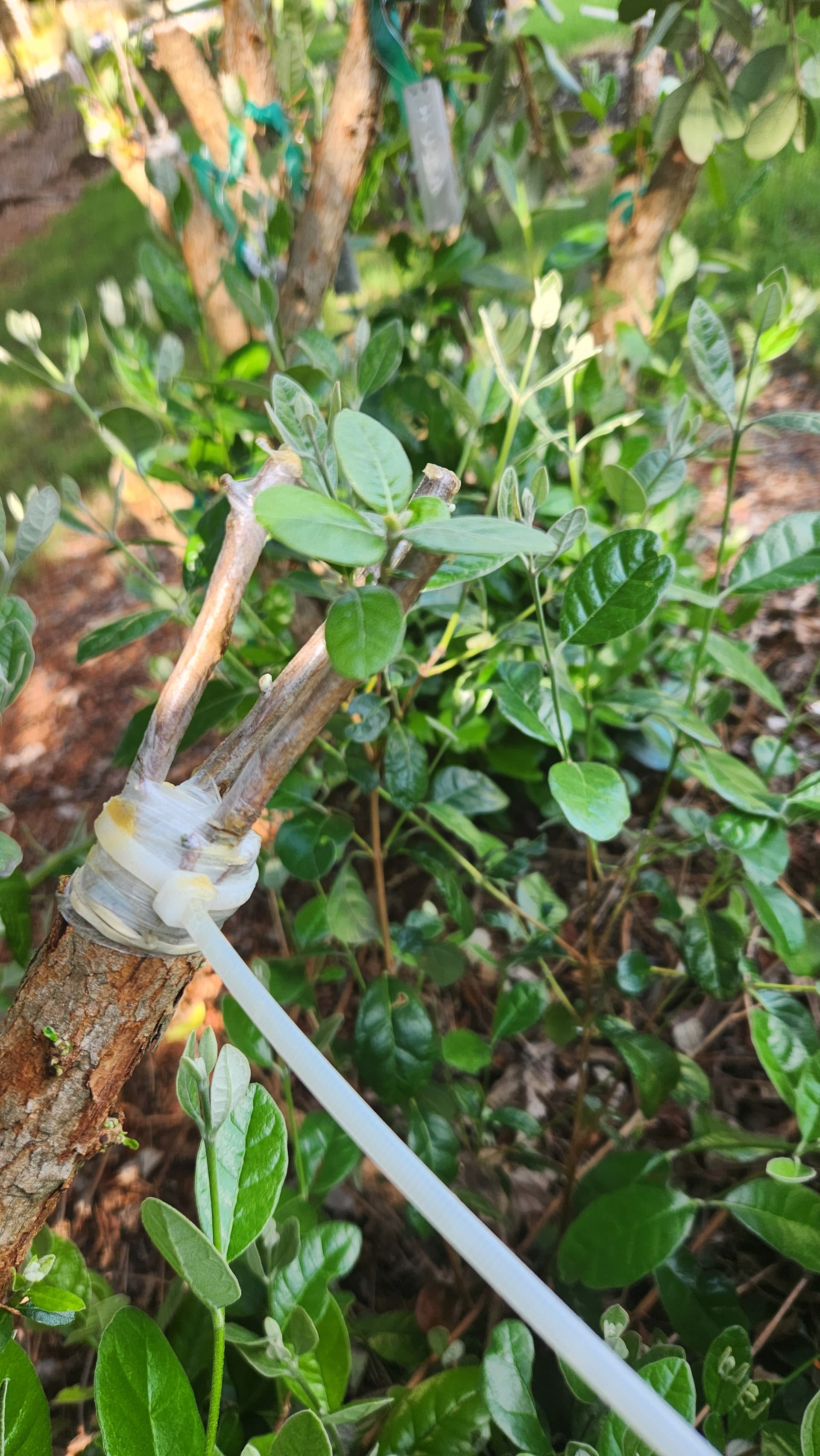 White goose feijoa grafts pushing. My large fruited franken feijoa bush is taking shape. These were bark grafts , which are tricky with how brittle the feijoa wood is. Zip tied to keep he pressure on, but I forgot to cut last year’s ties off till recently. That may have been why one of the varieties died off…