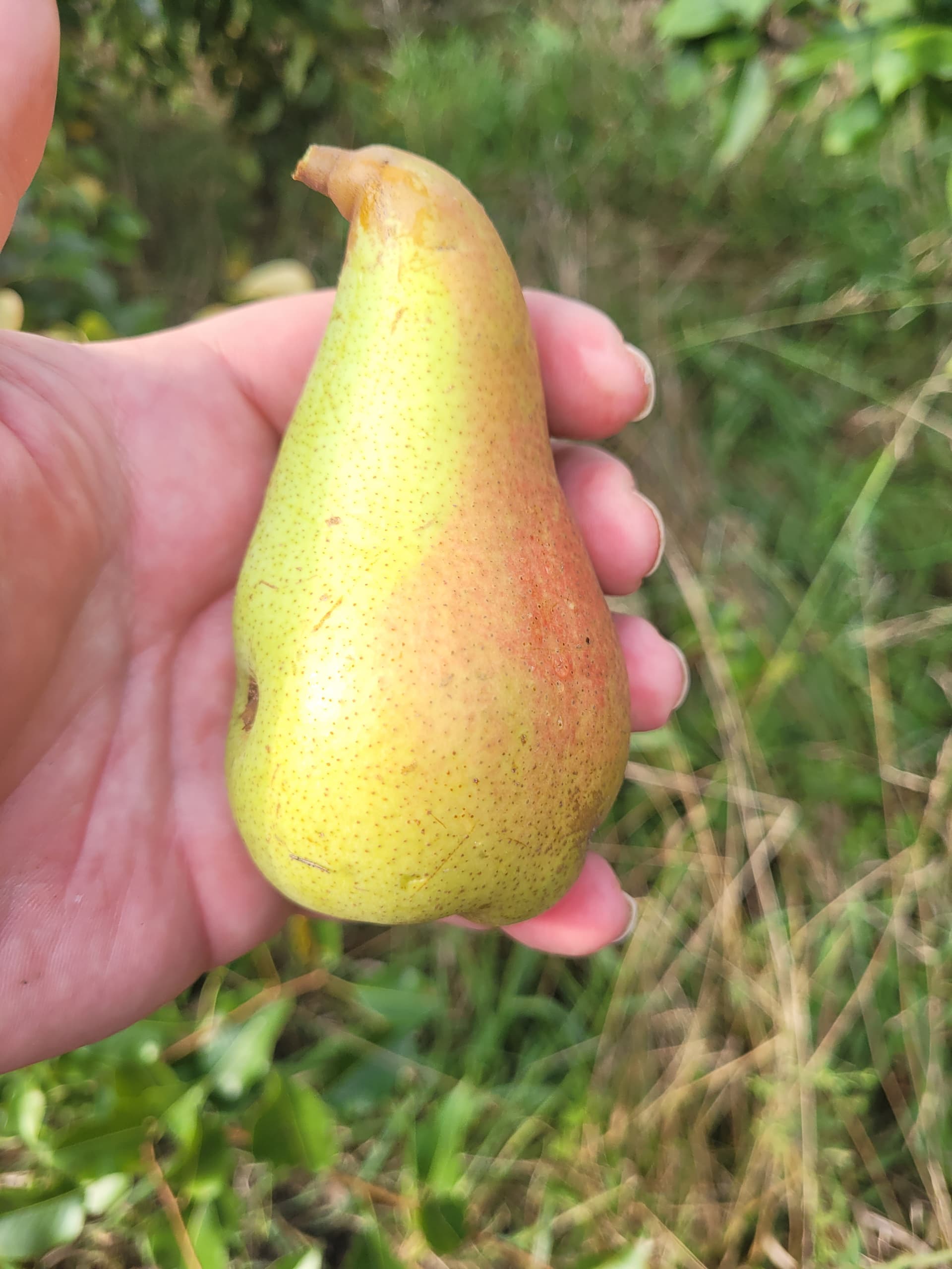 There’s one Kieffer pear in the front laying down and one Kieffer pear to the far front right.