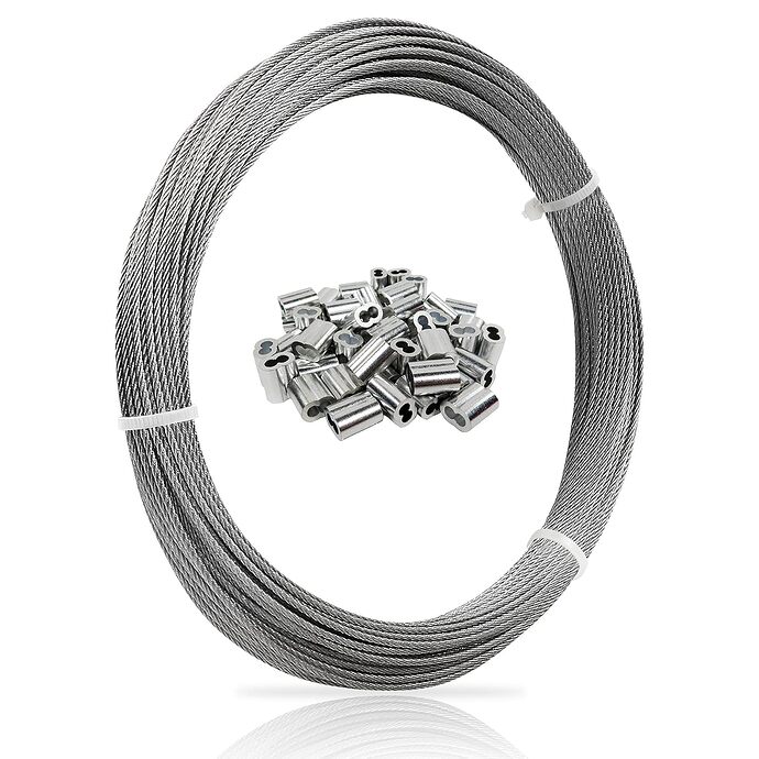… except for 2 horizontal runs I substituted 1/16 wire rope with “368lbs Breaking Strength”, particularly the top pass: