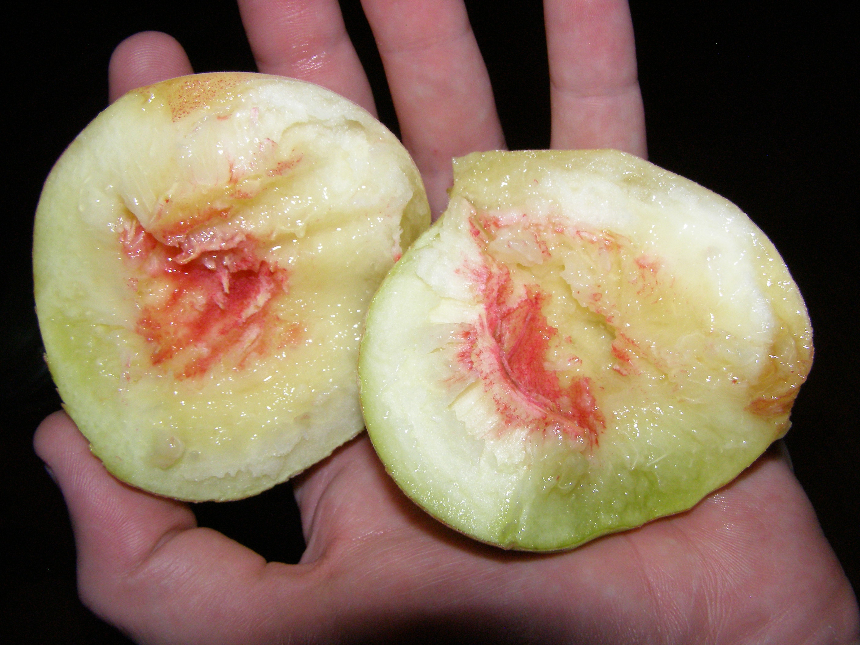 This peach looks like the one that I grew back in China when I was a little kid, we called it Da Qing Tao (大青桃), the Big Green Peach because the fruit was greenish inside out even when it’s fully ripe. Well, growing a peach was so easy back in China. The only thing I did was digging a hole and putting the tree in and then after about 3 years, the tree was loaded with big juice sweet peaches, no spray, no pruning, nothing.