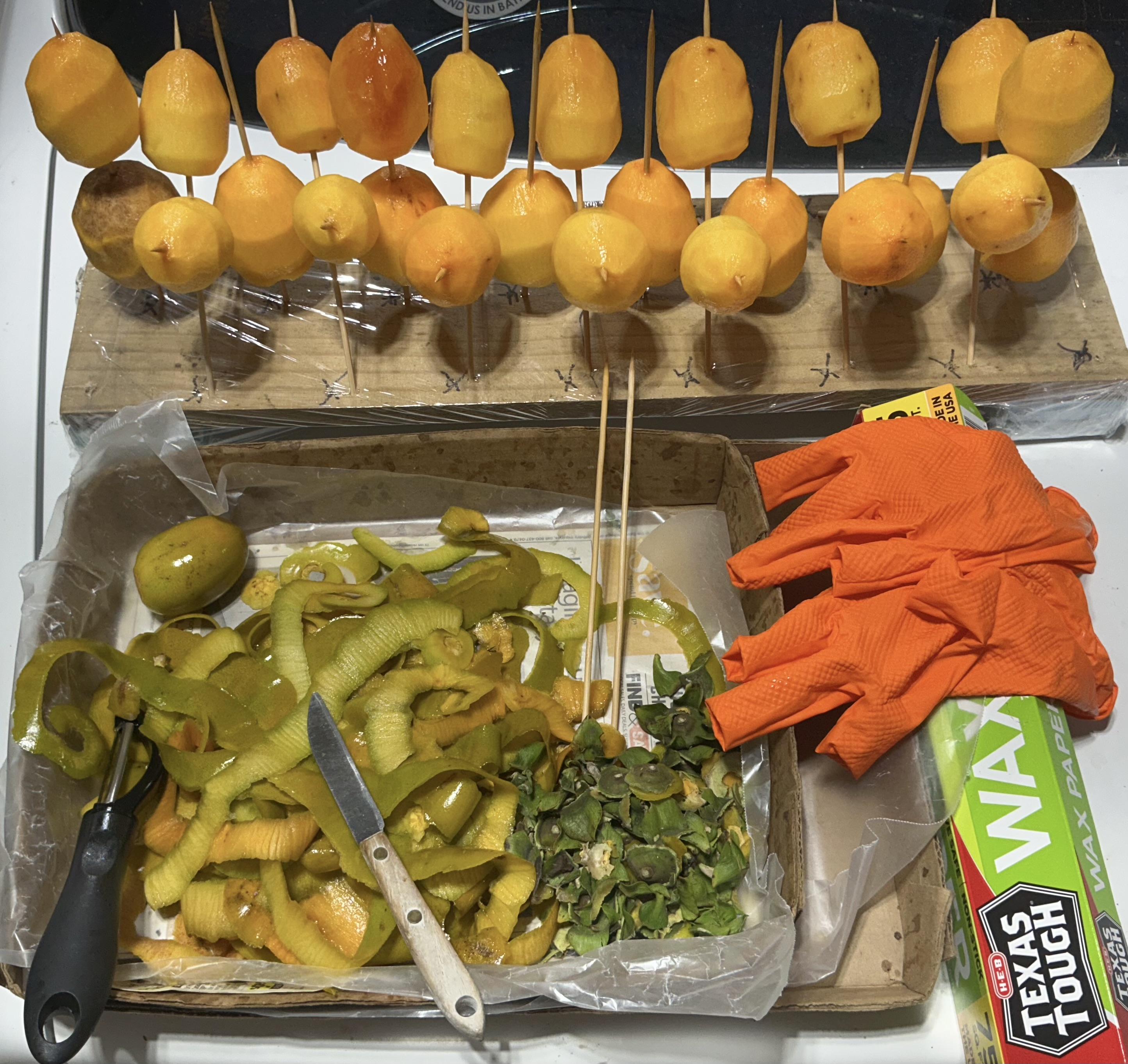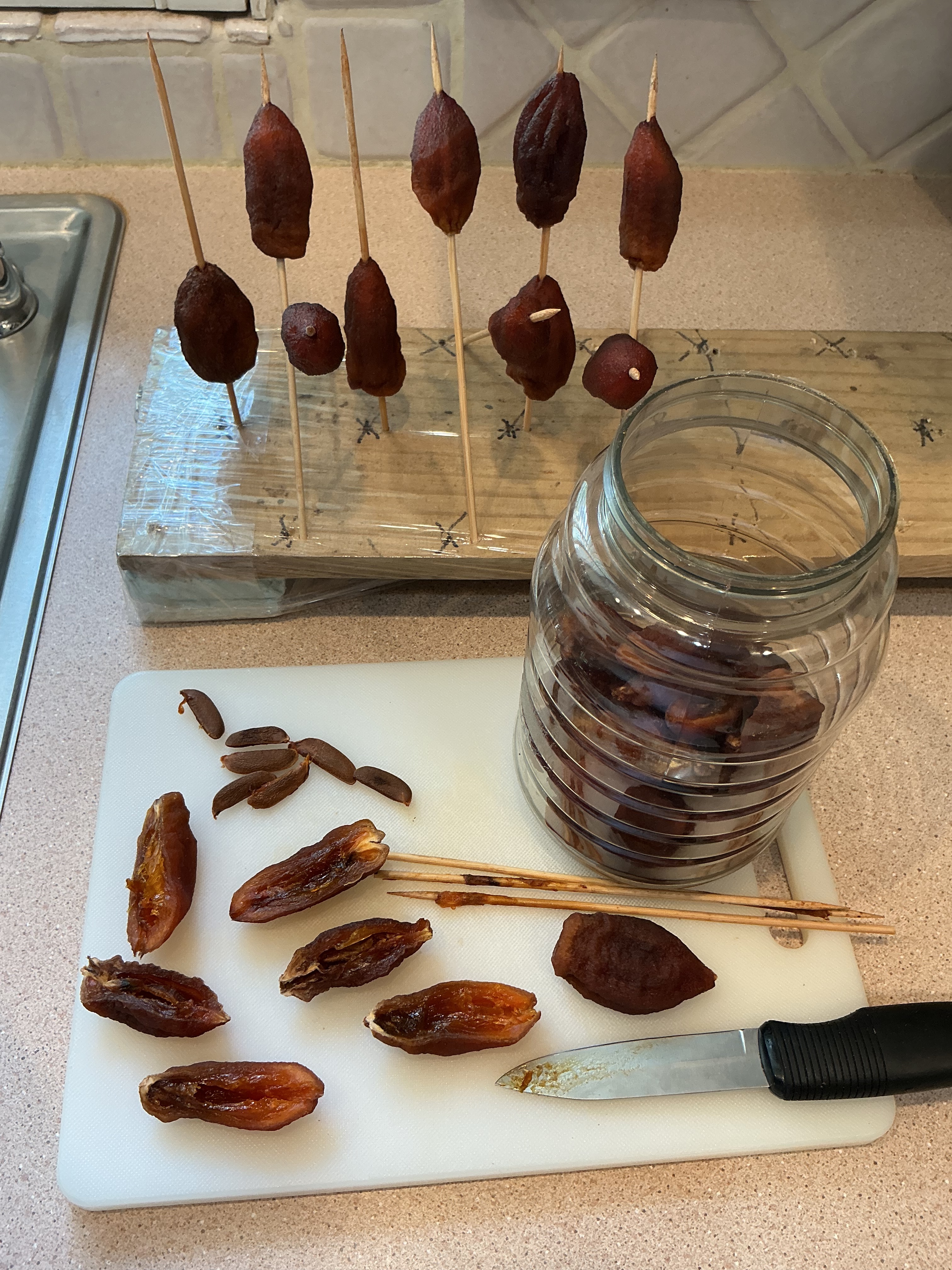 I grow over a dozen cultivars of Asian Persimmons (in The Woodlands, near Houston, TX), primarily astringent ones. For the past few years I have made hoshigaki out of some of the surplus fruits. In late September this year I peeled a batch of firm (just starting turn orange) Saijo, cut off the stems/calyxes, skewered them on bamboo BBQ sticks (much easier than tying them on strings!), arranged them on a pre-drilled board: