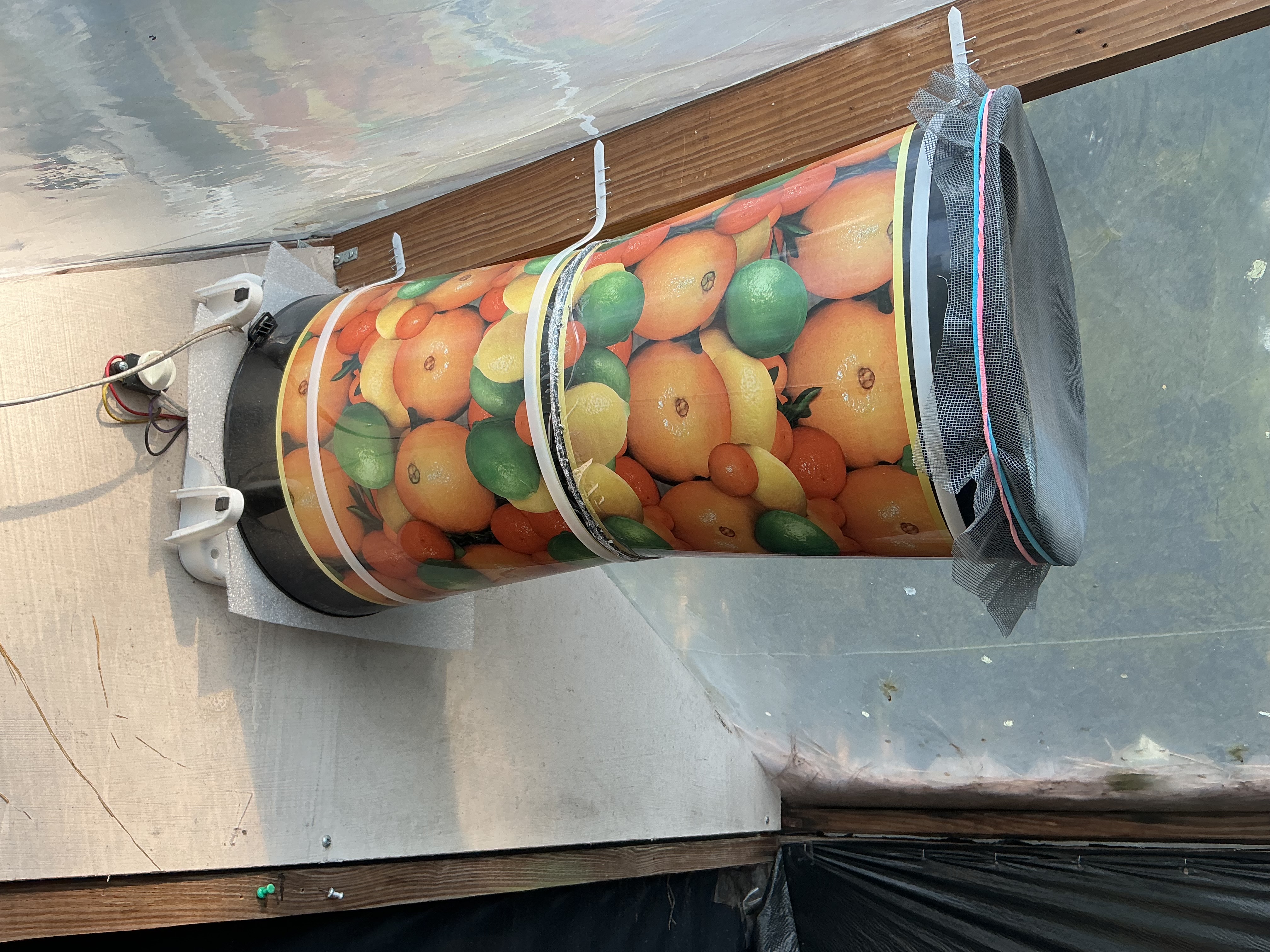 I inserted the board in a jury-rigged “wind tunnel” attached to the intake side of the exhaust fan in the apex of my greenhouse (it reaches 120F+ inside during the day in September):