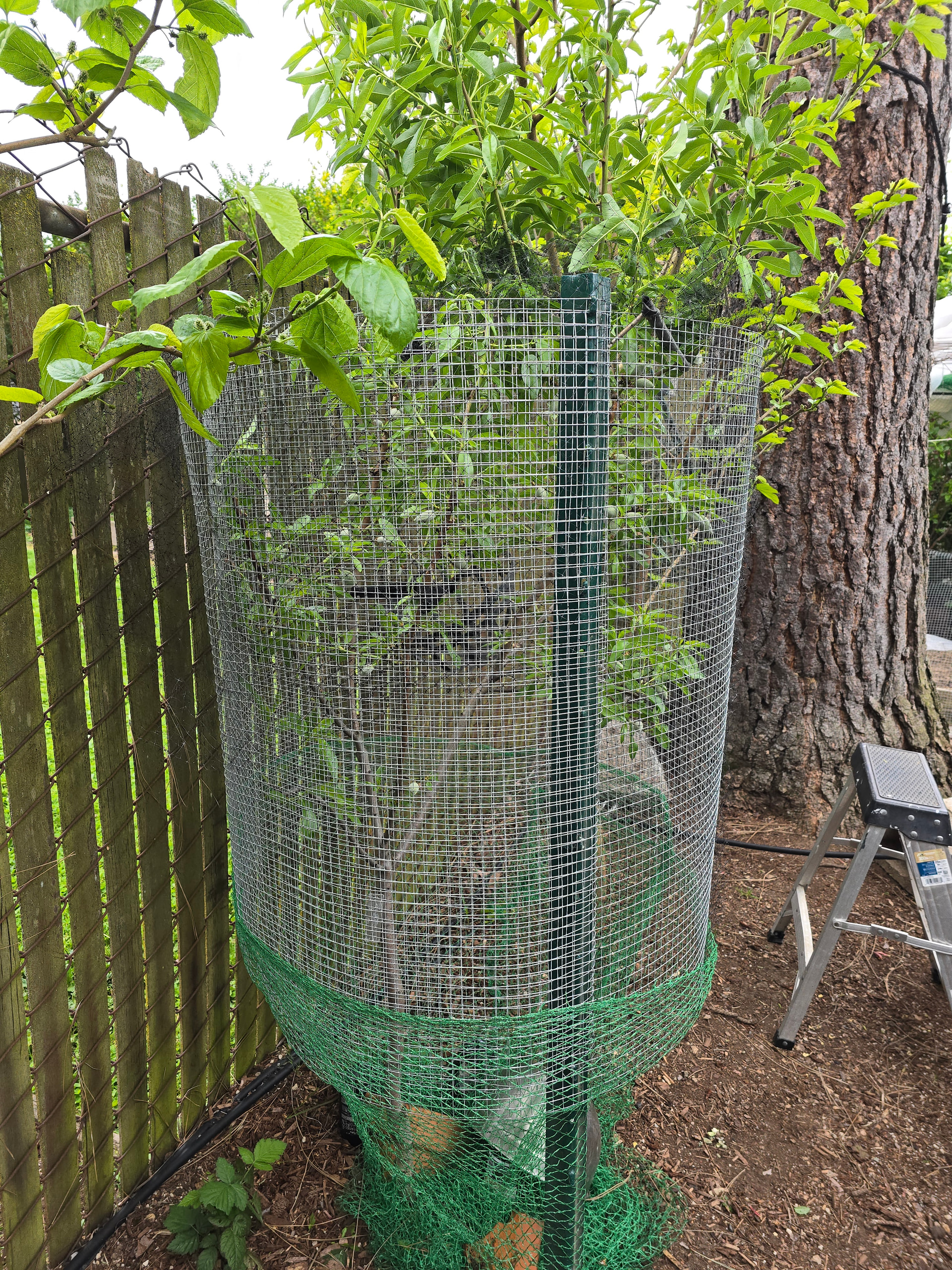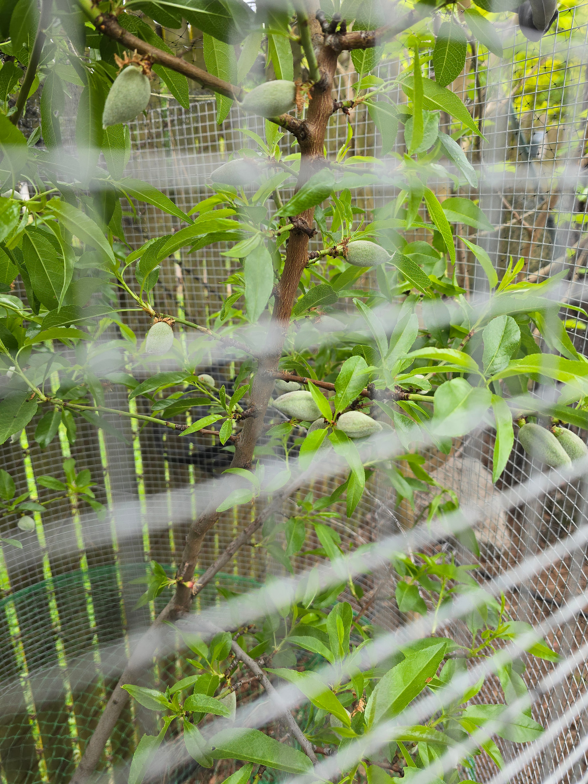 Determined to actually harvest more than 3 almonds this year. I plan to sure up the bottom with some additional wire. The top is covered in a finer black netting, at least temporarily. Will have to see if anything attempts to chew threw it.
