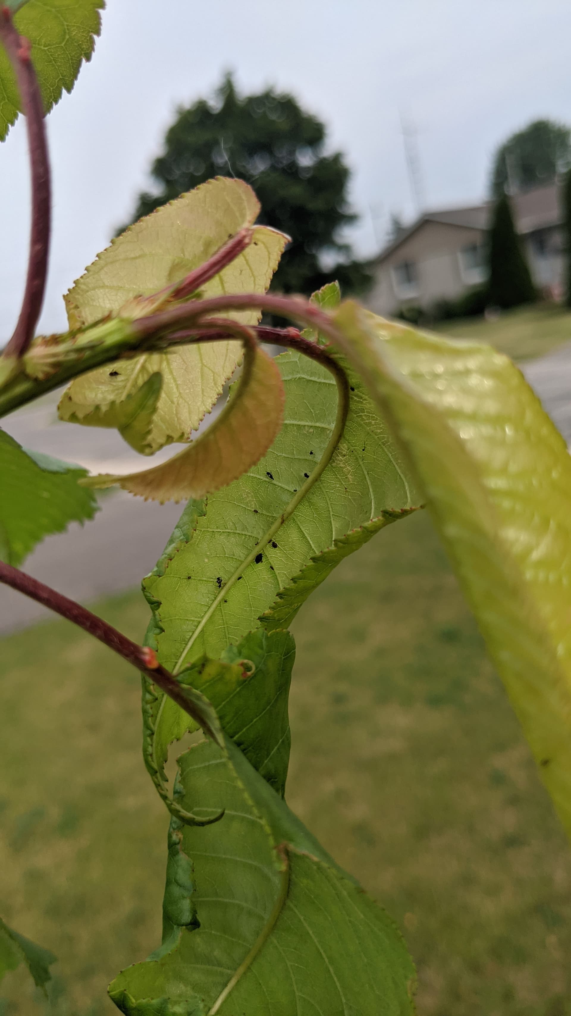 Hi everyone, I assume this is an aphid infestation on my cherry tree? The end leaves on some of this year’s growth have curled and there are little black bugs all over leaves…