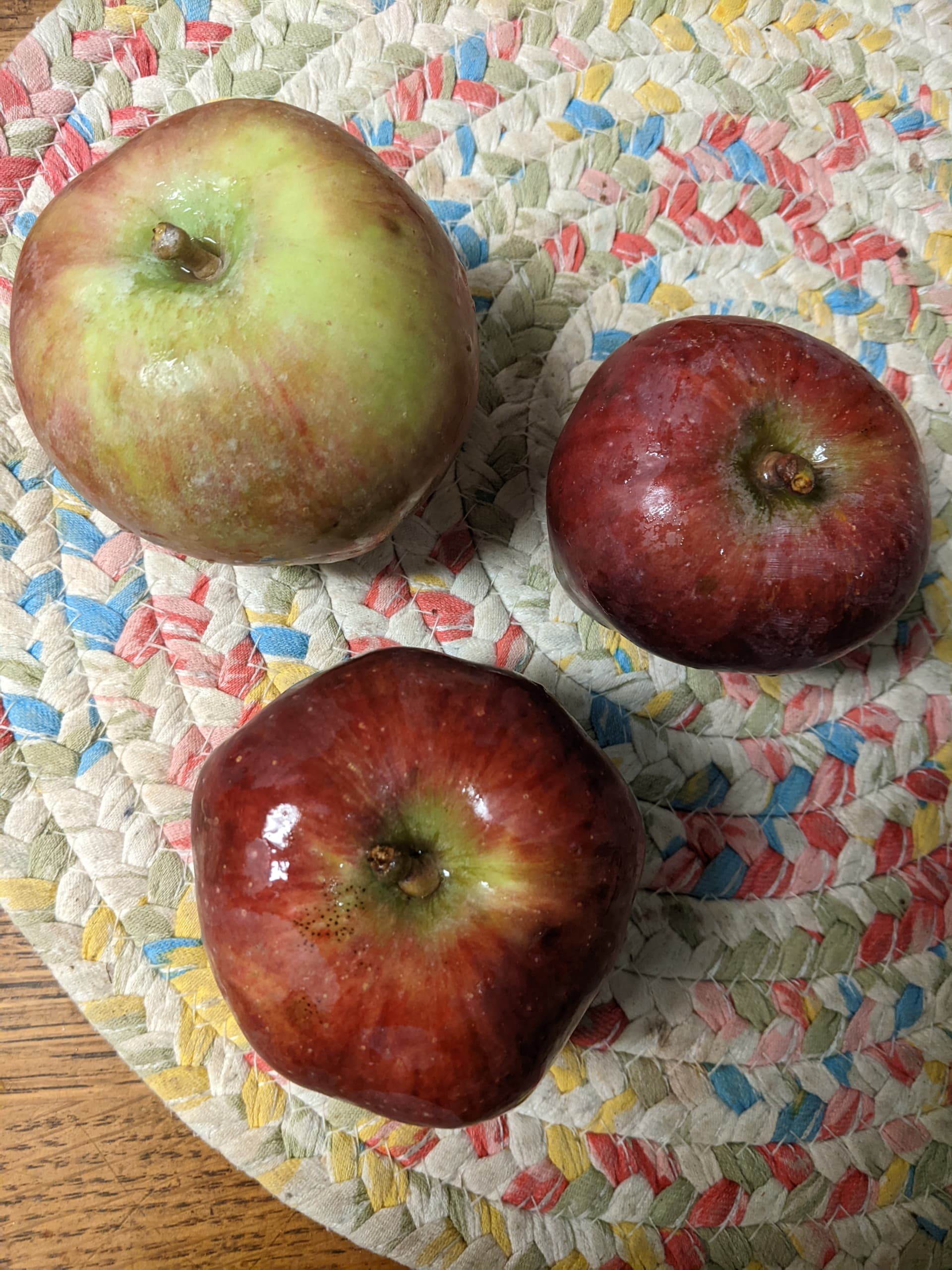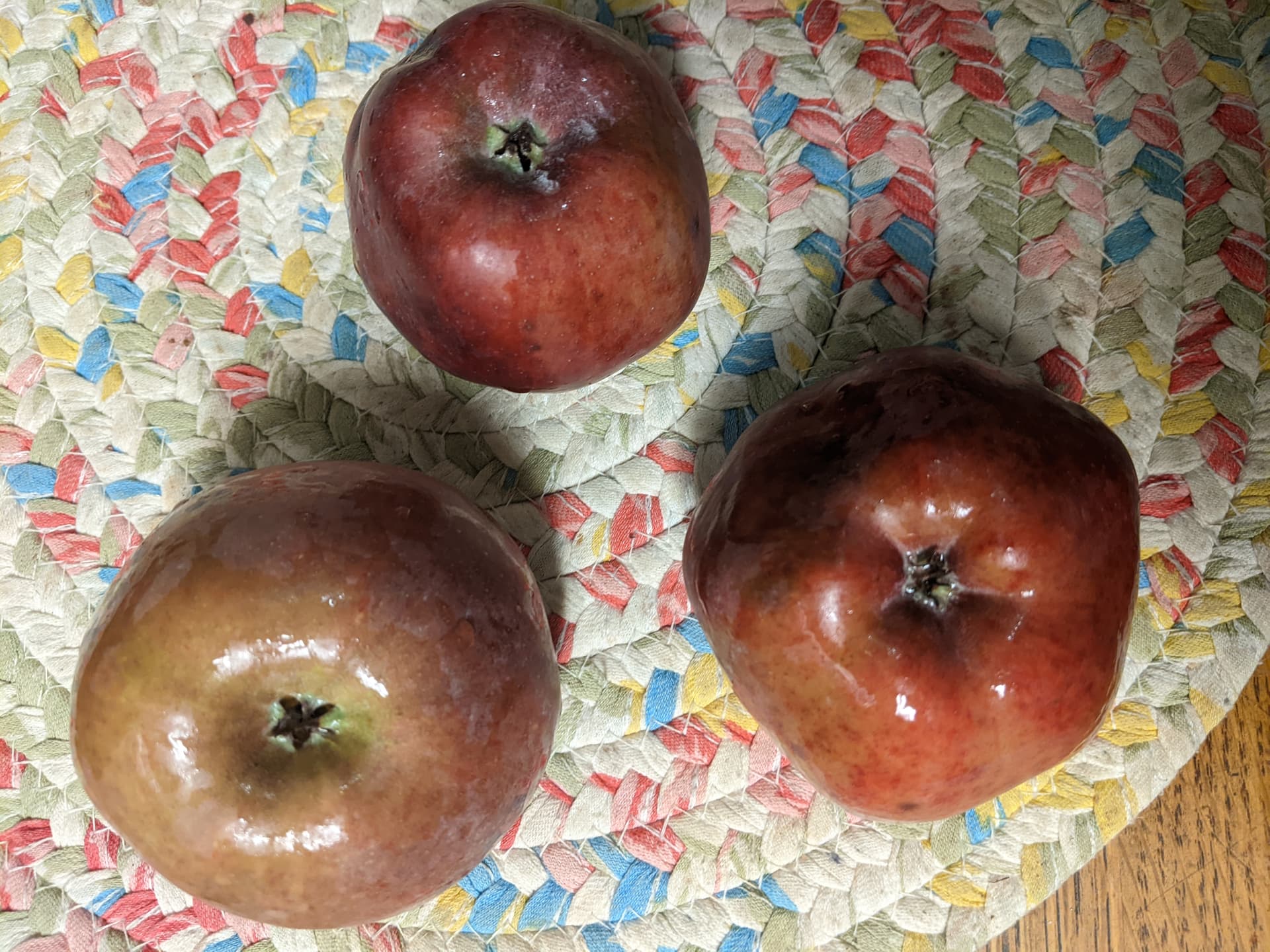 Love the ribbed appearance of Calville. My red delicious always has prominent base ribs but usually not continued to the top of the apple. These are the dropped red delicious I brought inside.
