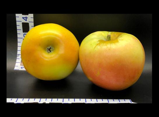 Description: Fruit medium size or above, roundish conical; skin bright yellow occasionally blushed with red. Flesh pale yellow, crisp, juicy, mild subacid. This apple has an excellent flavor that often tastes very similar to a pineapple. Very suscepitble to fungal diseases. Ripe October and keeps well.