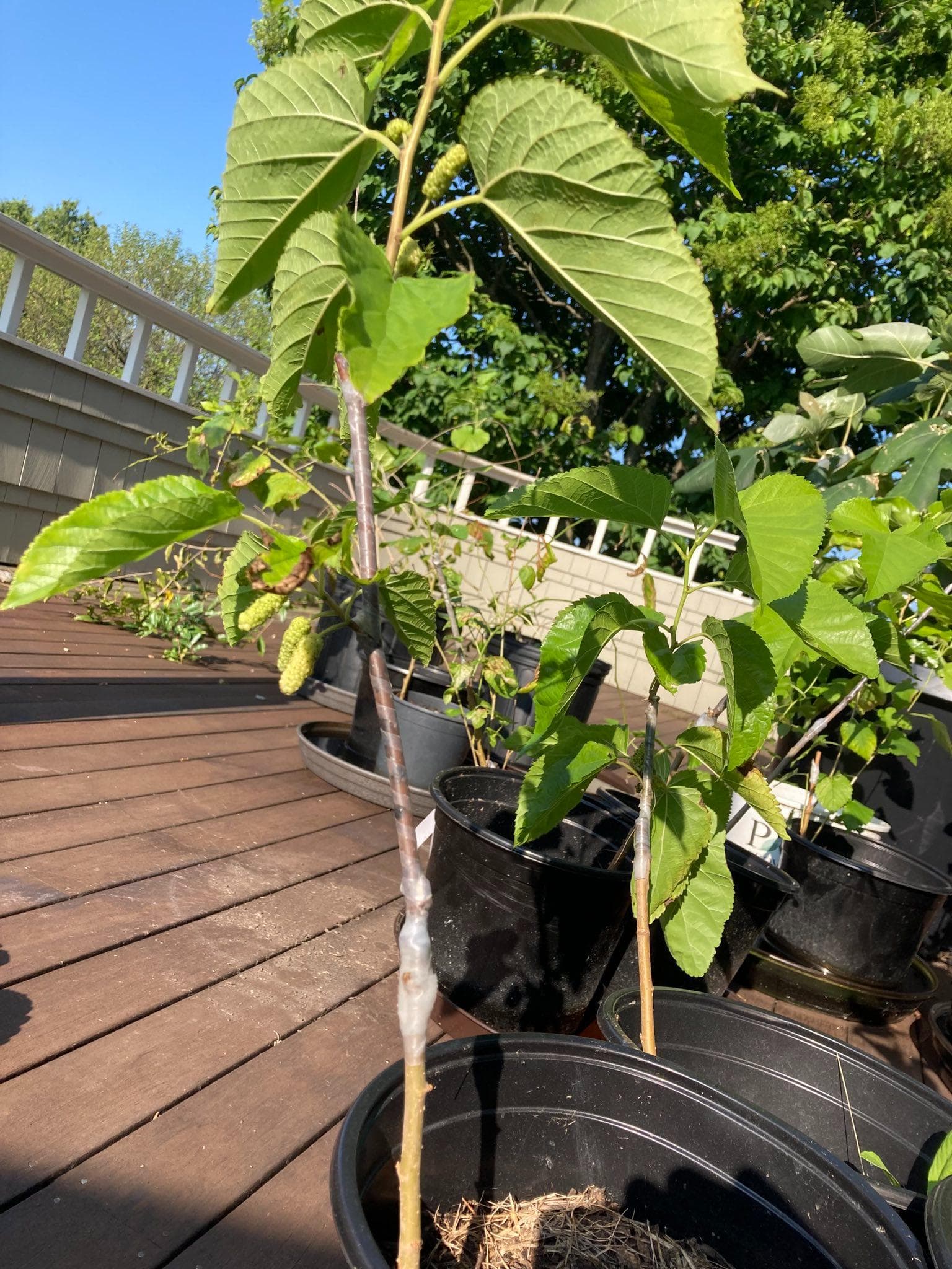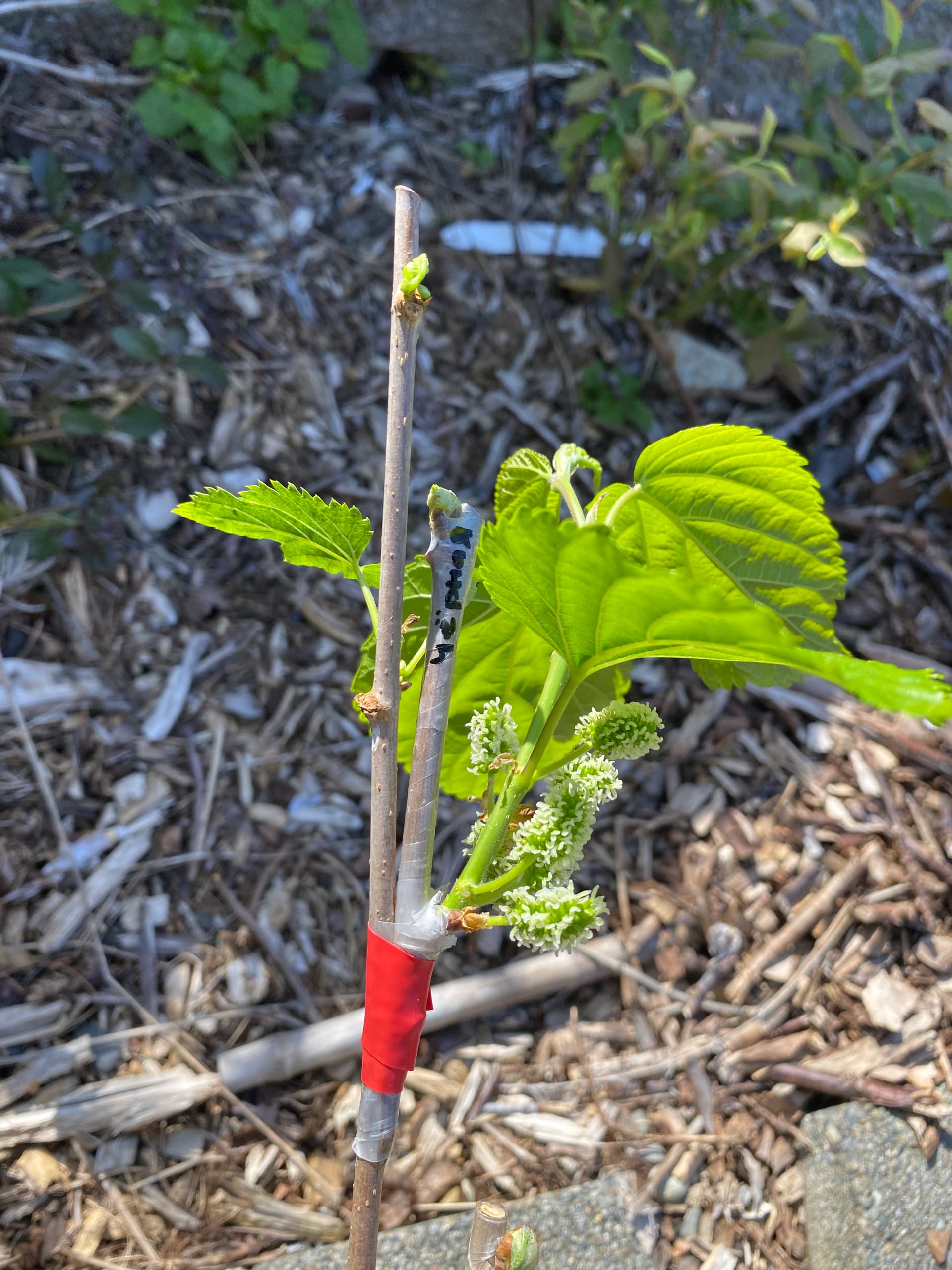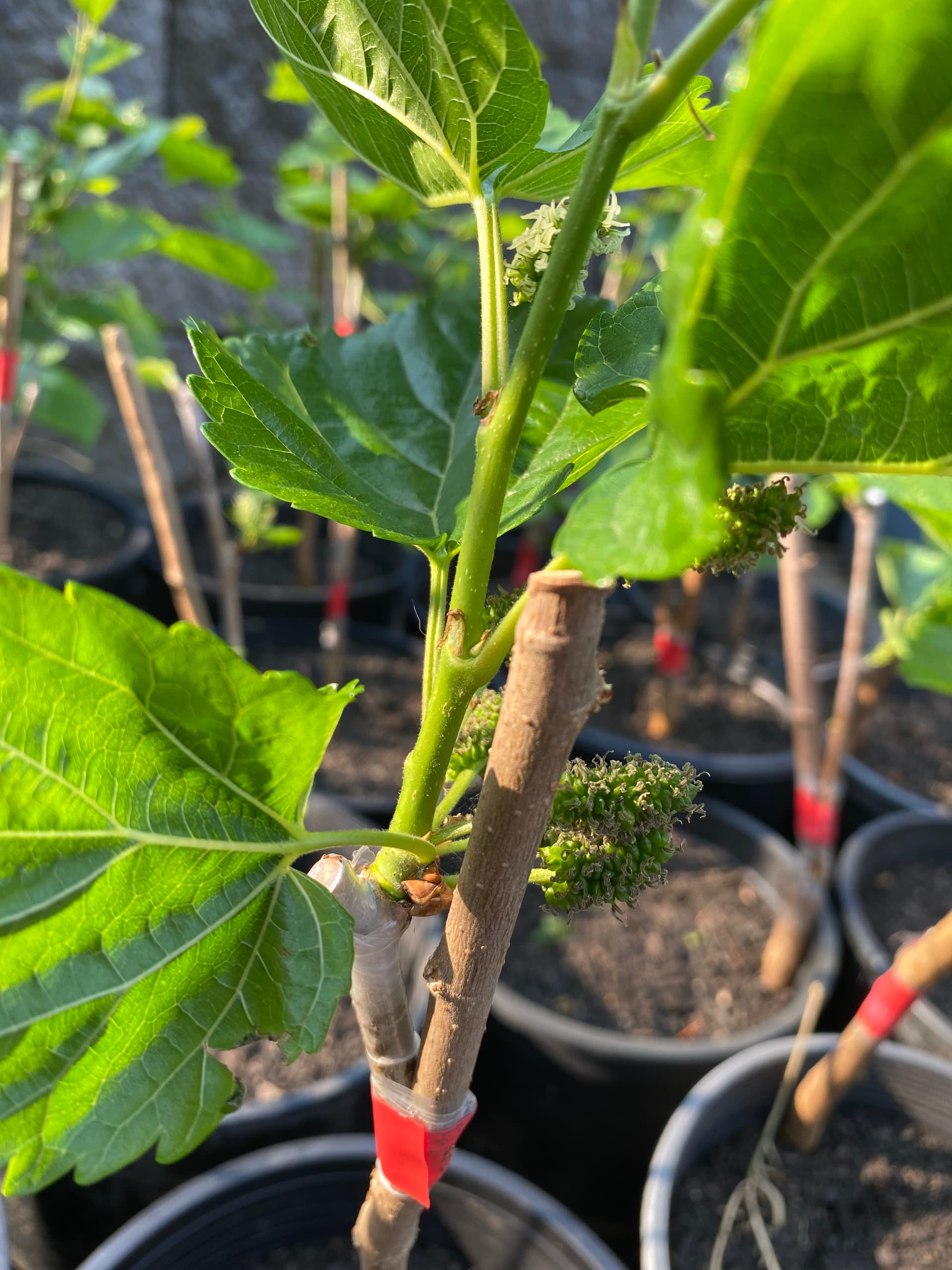 I bark grafted Kokuso and Northrup to this male wild white mulberry this year. They were my first mulberry grafts. I did cut small “slits” in the bark below the grafts to try and help prevent flooding. I have no idea if that was a good idea or not, but the grafts took for the most part. Seemed pretty easy to graft, but maybe I just got lucky.