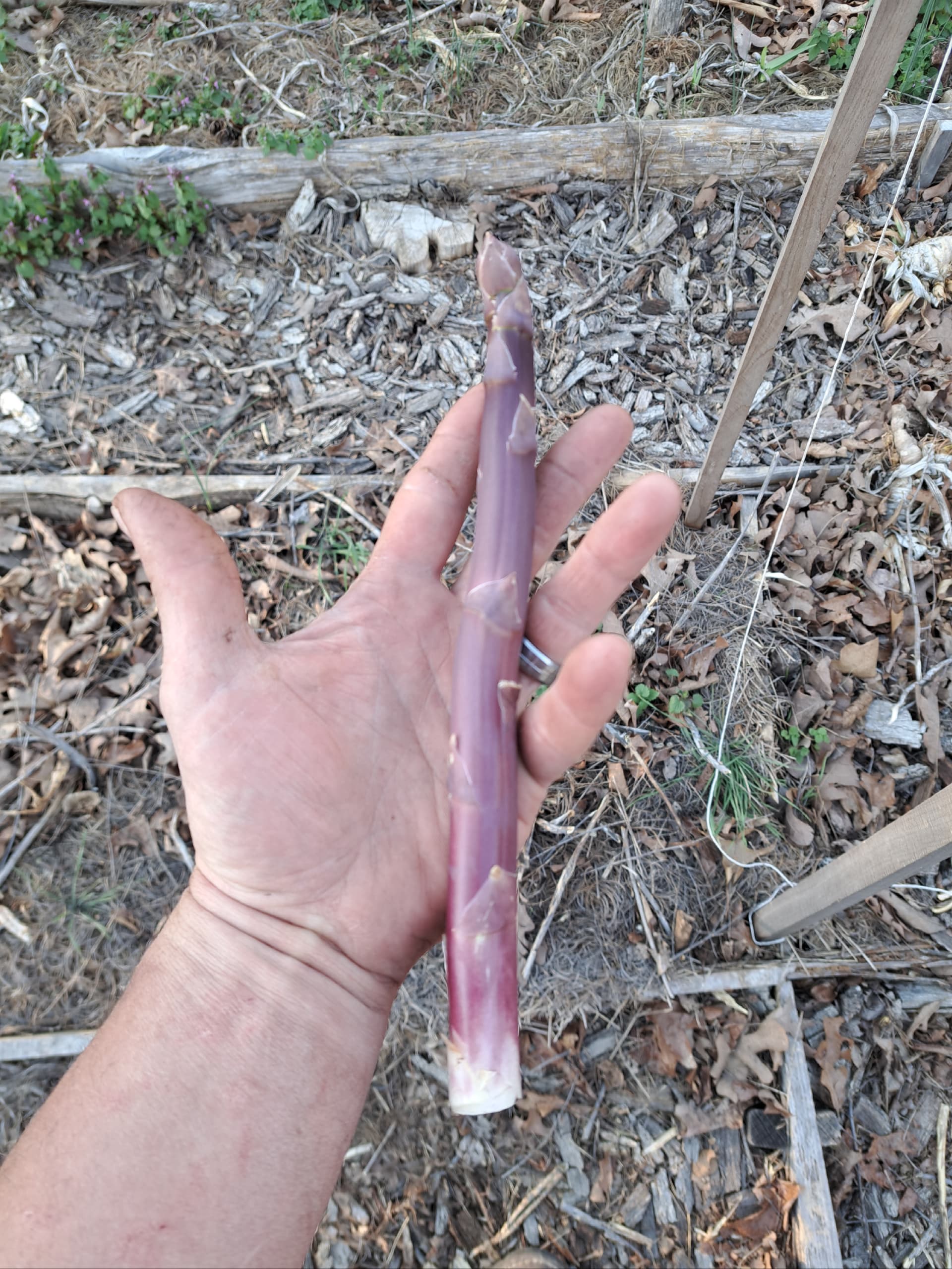 Just wanted to show off this massive purple passion spear I picked yesterday First one of the year. It weighed 2.4 ounces. I read a few years ago that in ideal conditions the ancient Roman’s could grow asparagus so well that four spears would weigh one pound and still be delicious to eat. This big one is not typical for PP in my beds, but it was nice to see.