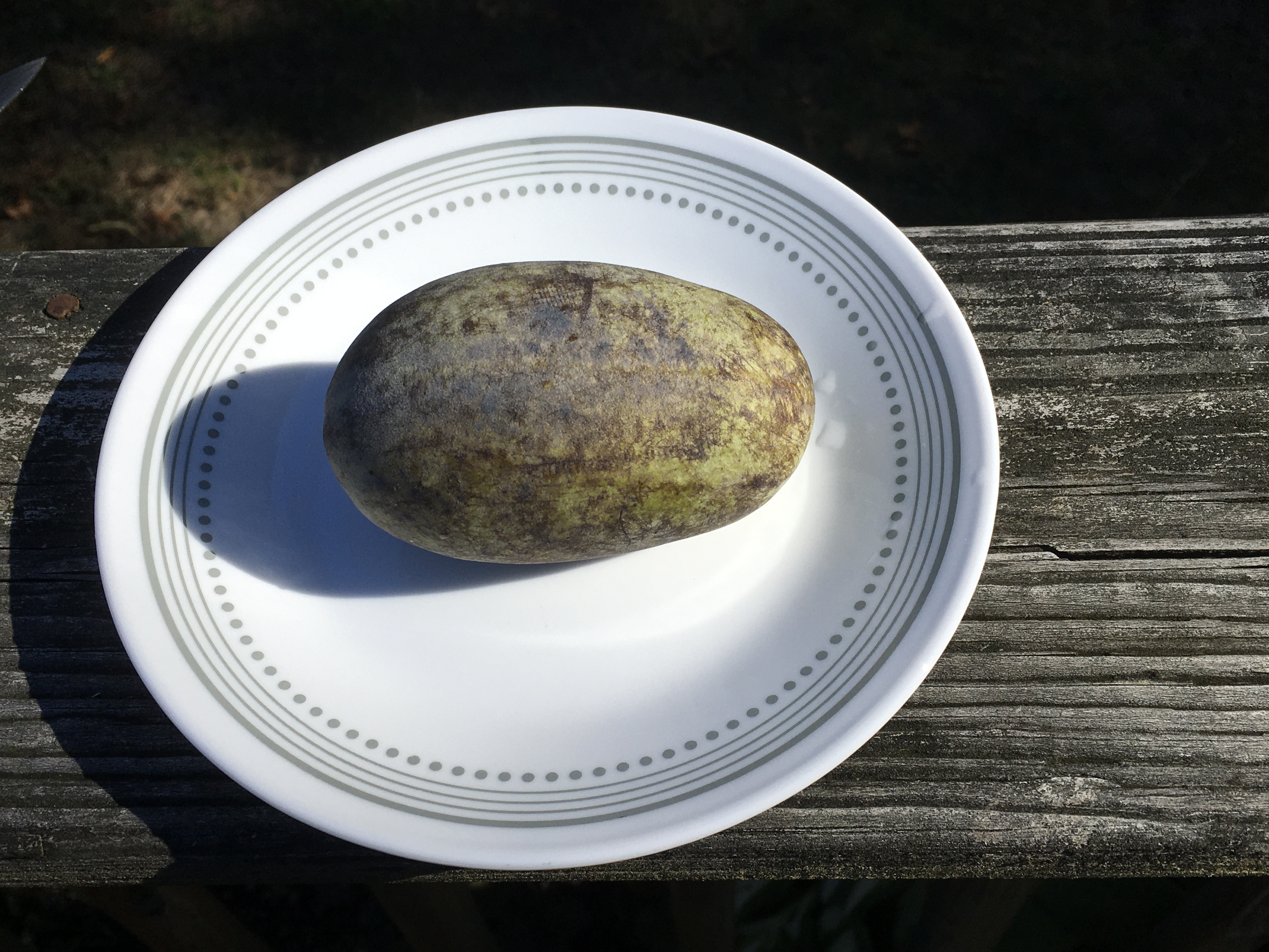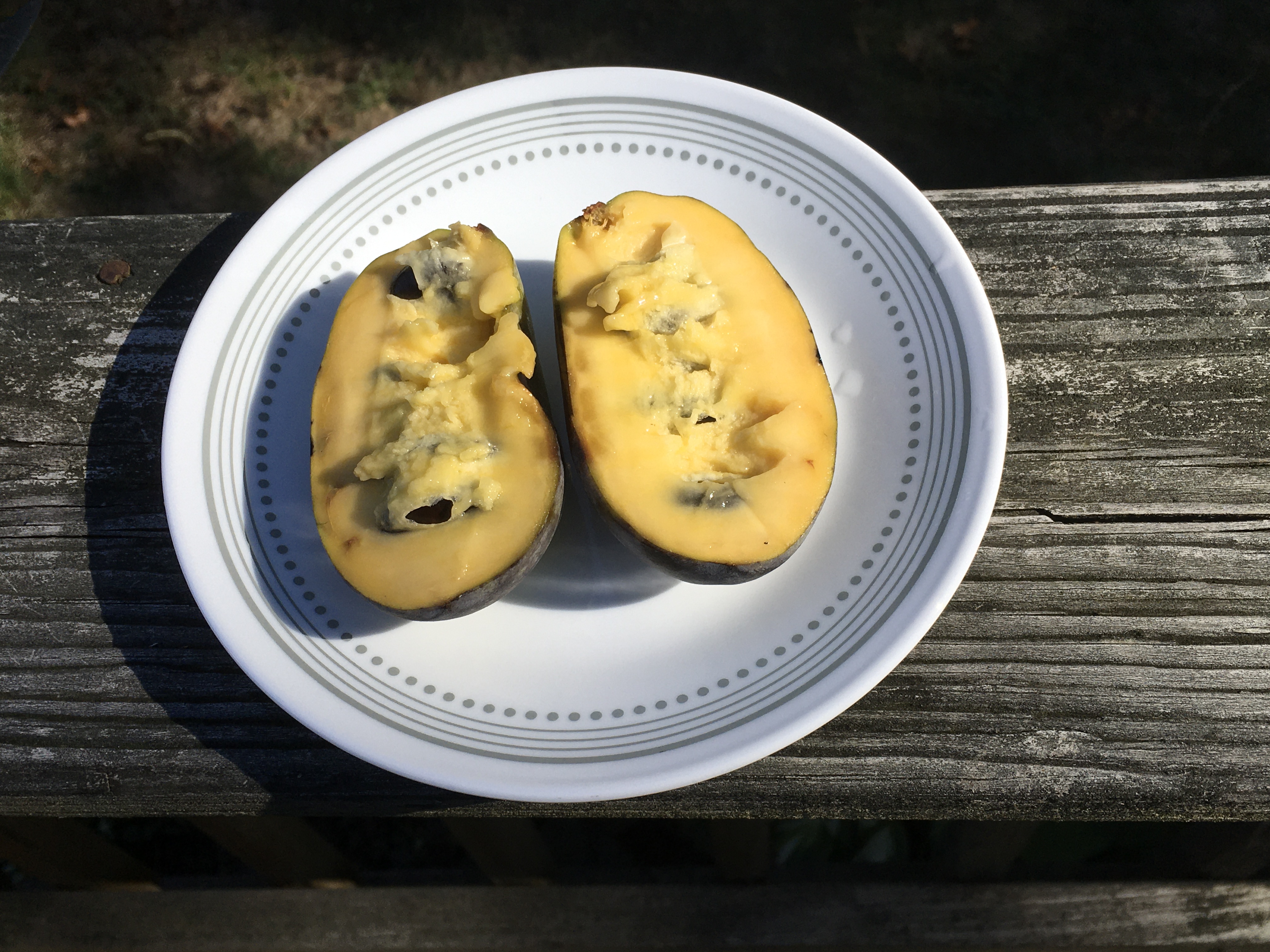 My Mango pawpaw. The tree grow vigorously but took 10 years before flowering. It has not flowered as prolifically as a Shenandoah. The quality of fruit is not as good, in my opinion. The flesh is stringy near its skin and I don’t like a bitter after taste.