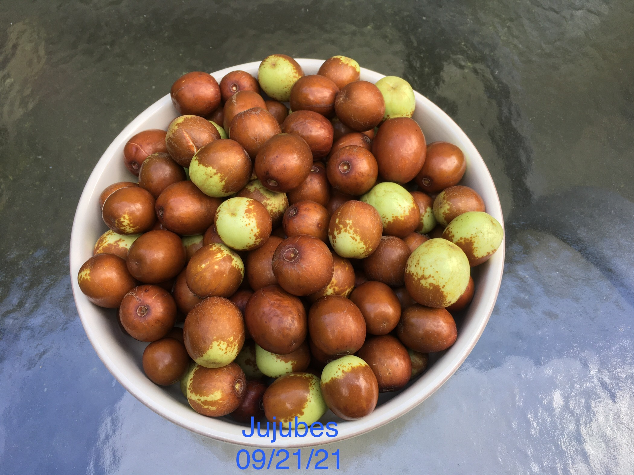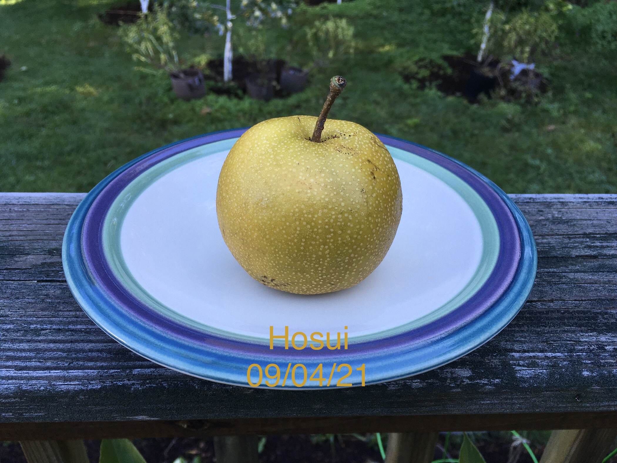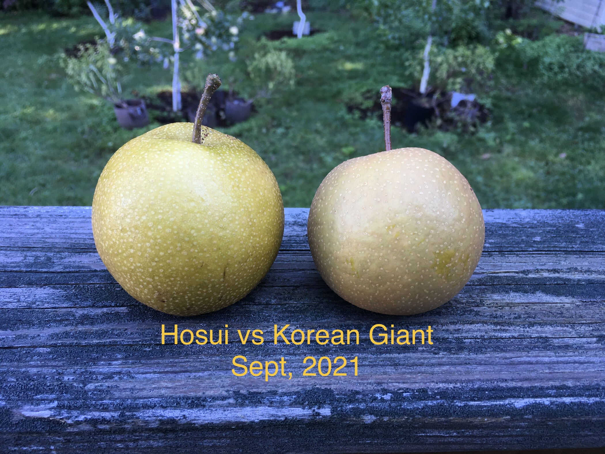 Hosui, picked two weeks ago and Korean Giant picked today, 9/25/21 to compare their coloring. KG has not fully ripened yet but definitely edible.