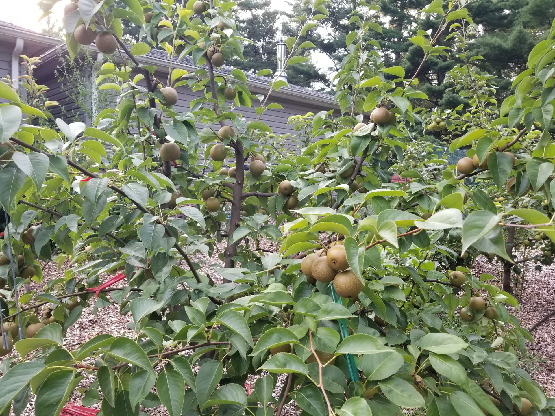 The Korean Giant pears at my location are already getting big and sweet. This pear is about softball size.