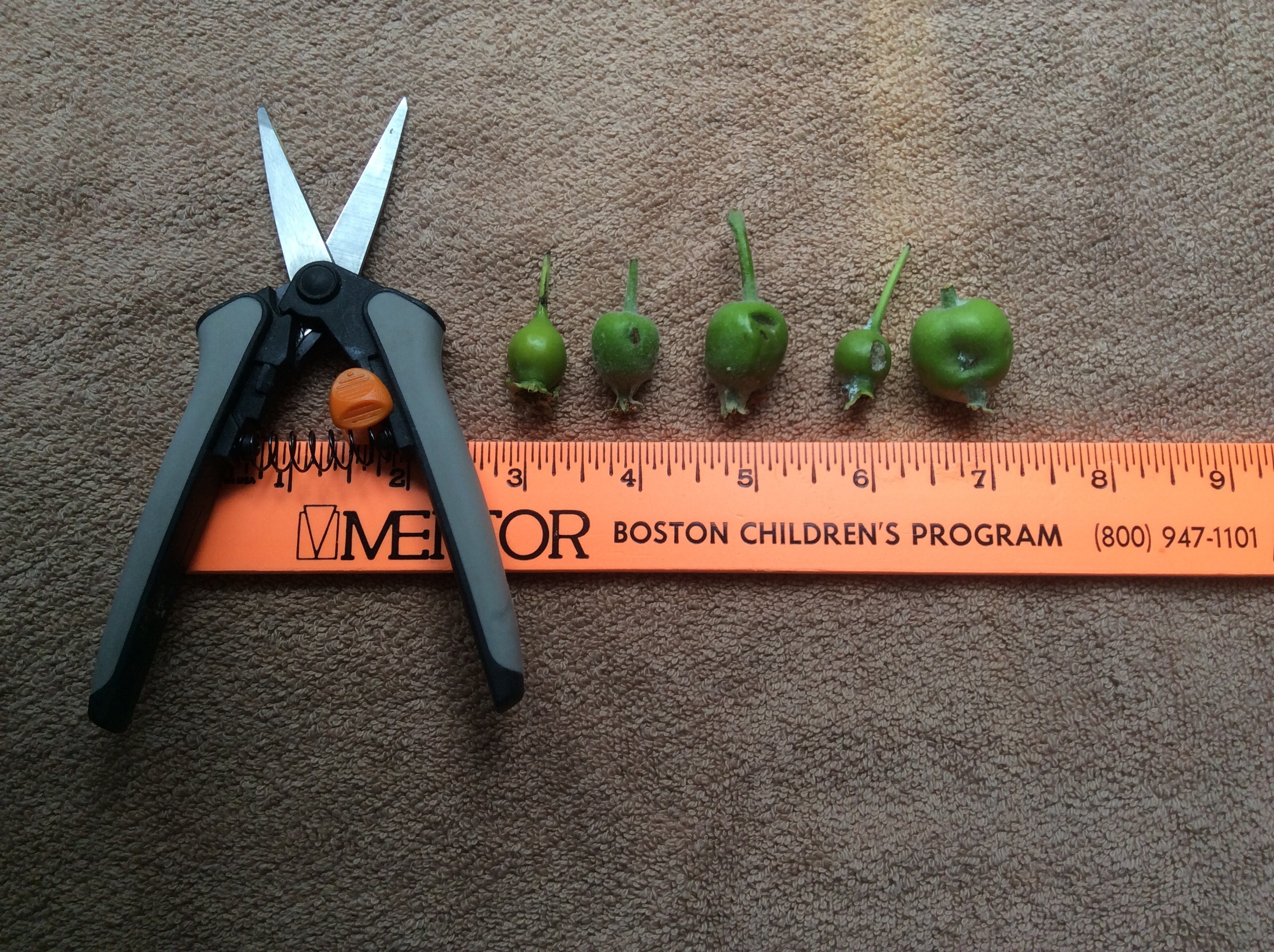 Apples stems are harder to pinch off. I use this pruning snip. It is very convenient. I try to bag as soon as I can but sometimes I need to get rid of bigger fruit, too.