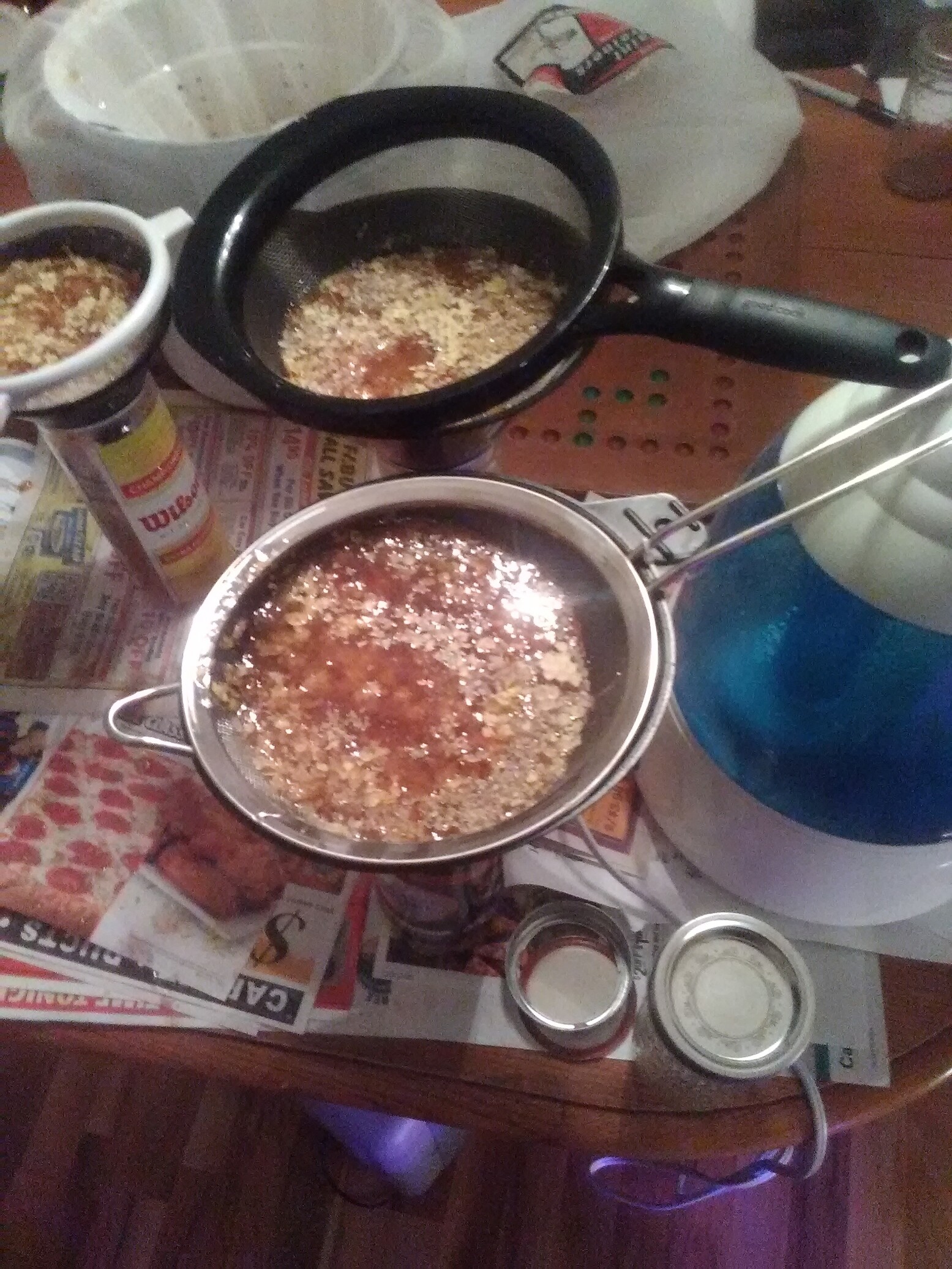Kevin thought you might like this, here’s a couple pics from my first time, low tech honey collection. Scoop comb wax and all into strainer inside funnel