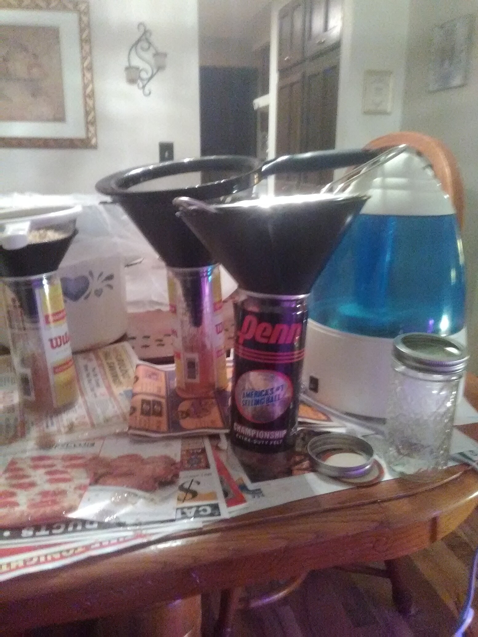 Used tennis ball canisters to hold funnel just above jars.