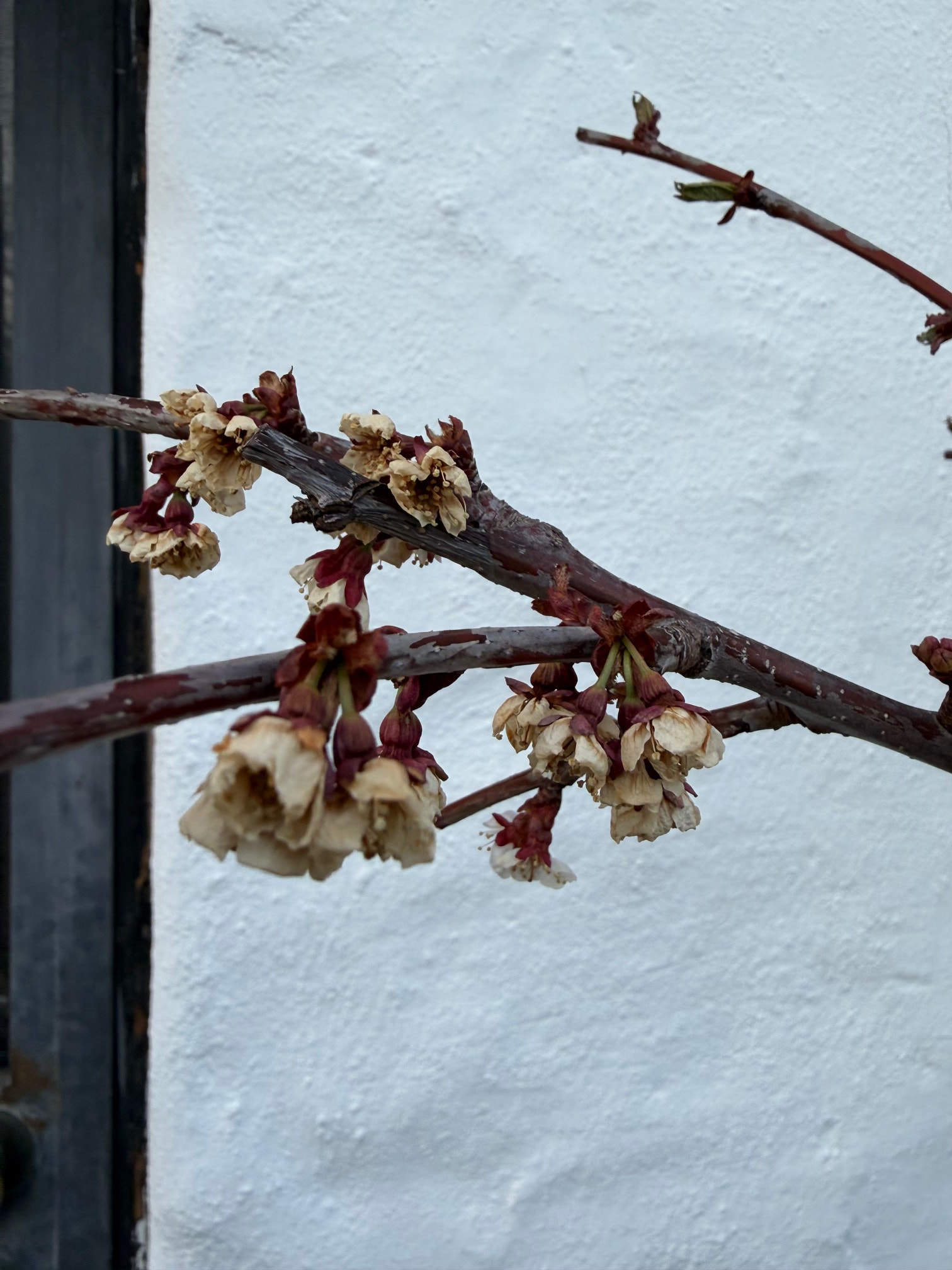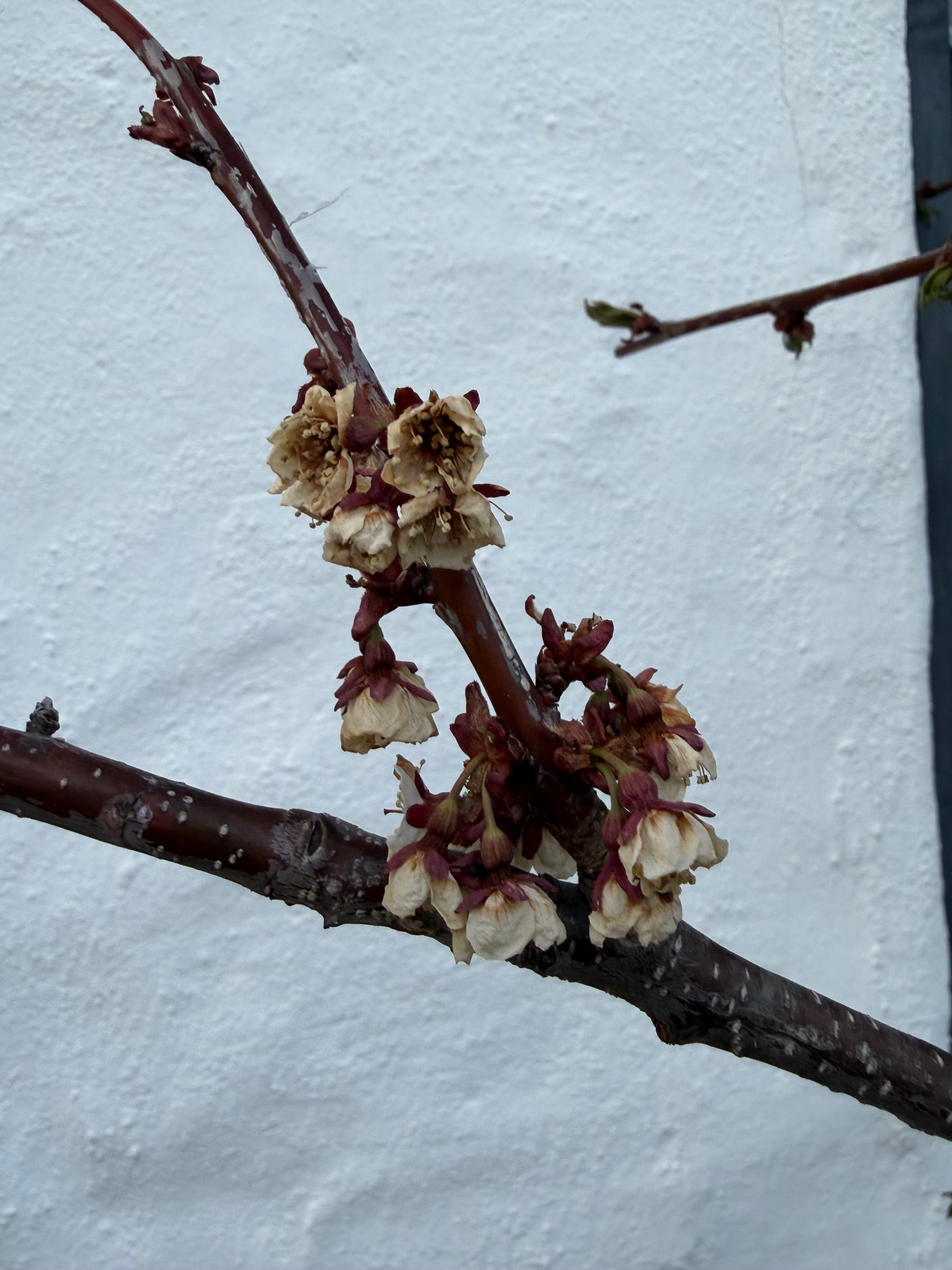 The strange thing is that I have an Ebony Pearl Cherry (same rootstock) right next to it—it bloomed earlier and wasn’t affected at all. It’s perfectly healthy.