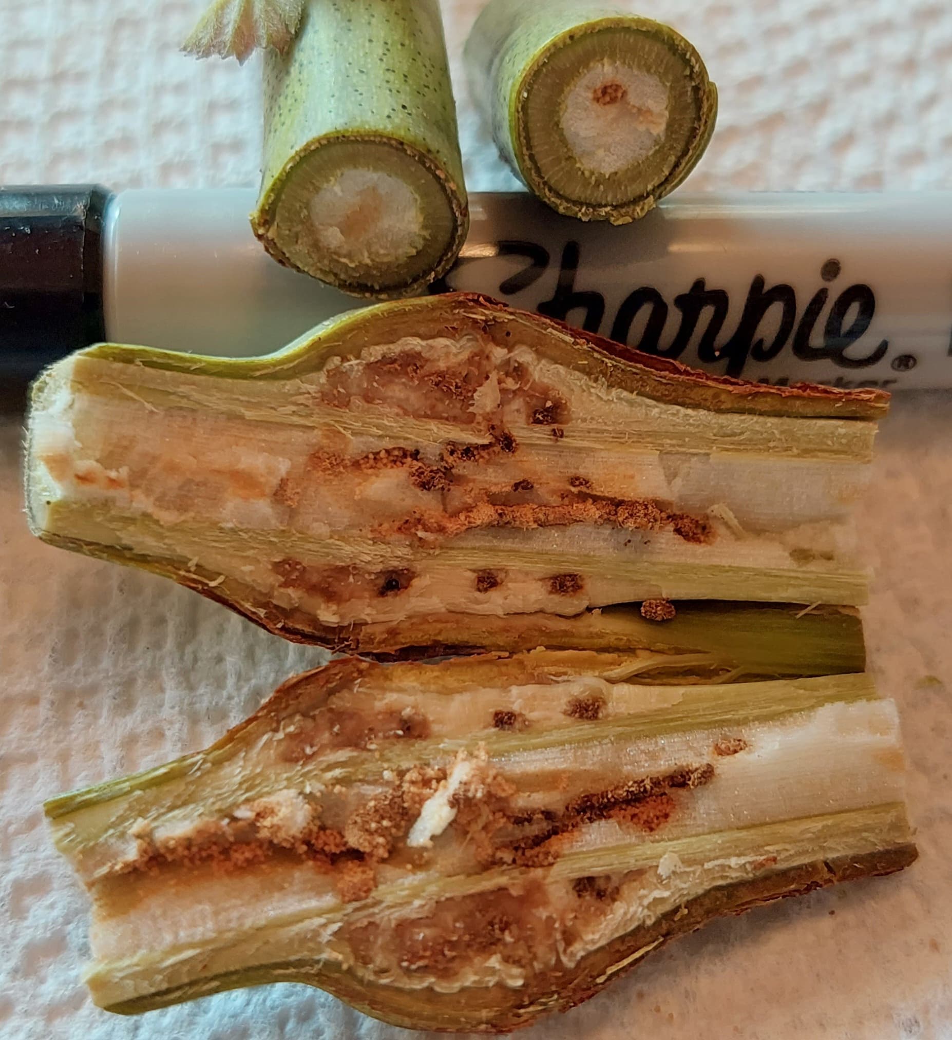 I opened all of those swelled parts and searched up the cane following the trail… but never found the culprit.
